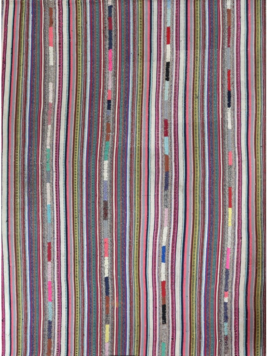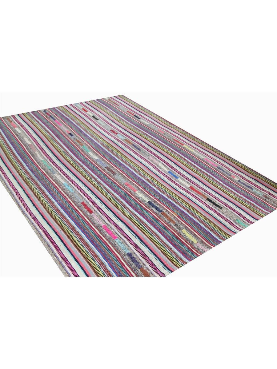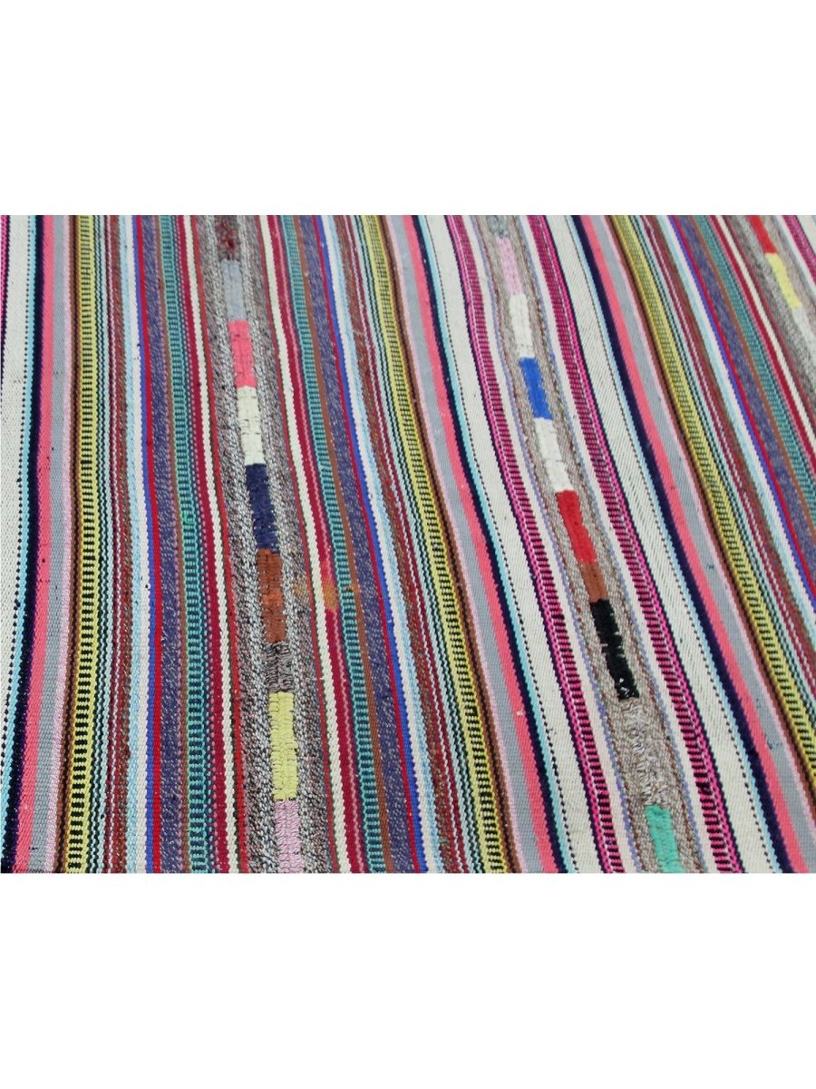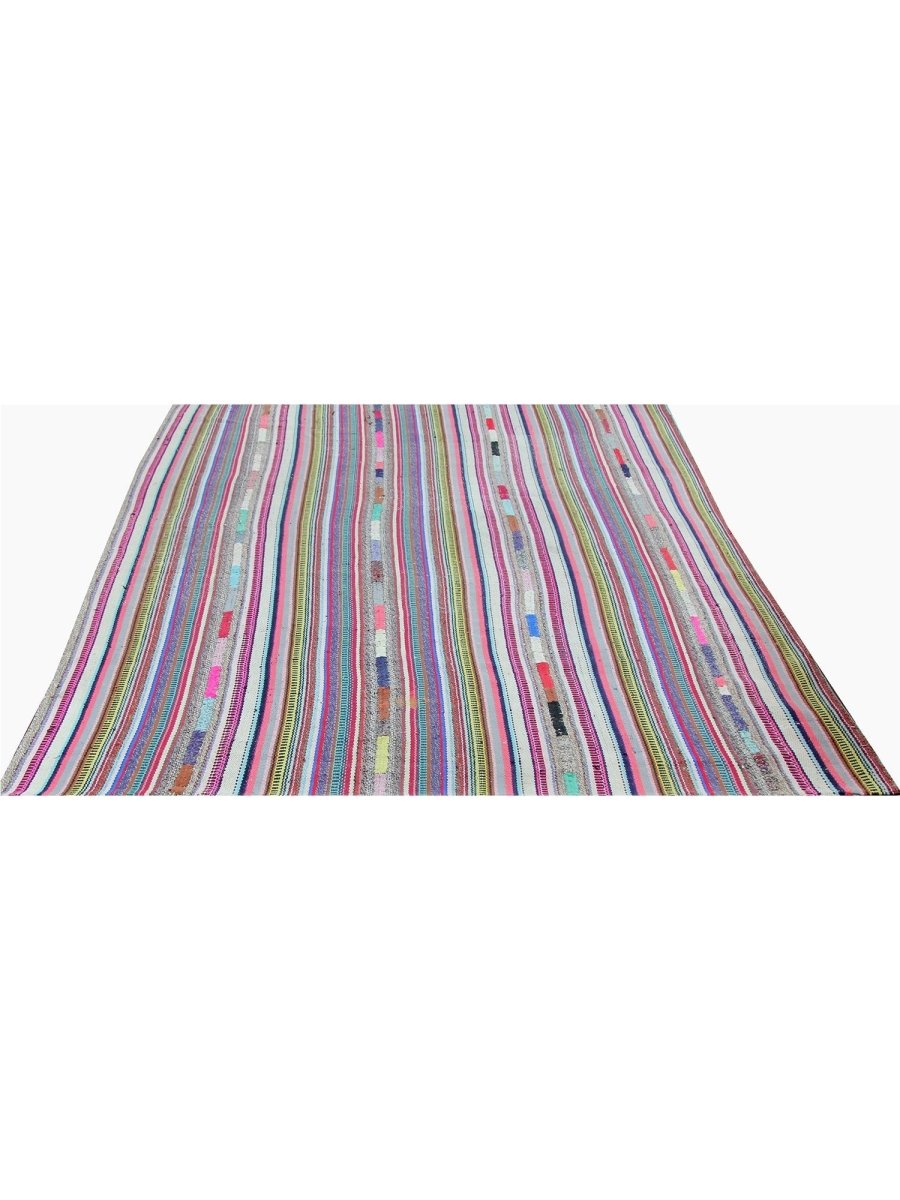 The 6x9 Old Persian Kilim Area Rug combines rich color contrasts with timeless craftsmanship. Handwoven in Persia from premium wool, this rug features a vibrant design of colorful vertical stripes, interspersed with textured bands resembling color blocks. The primary palette includes pastel hues like pink, light blue, and yellow, balanced by hints of red and gray. The textured sections add depth and visual intrigue, making this rug a standout piece. Ideal for eclectic, bohemian, or chic interiors, this rug’s striking pattern and diverse colors create a captivating focal point in living rooms, hallways, or creative spaces. This rug is a timeless accent that will enrich your living space.