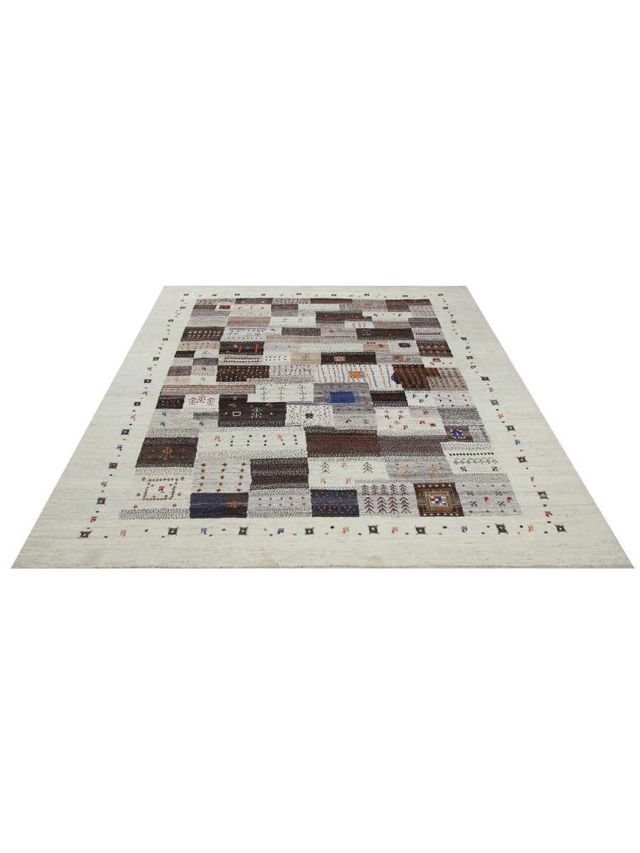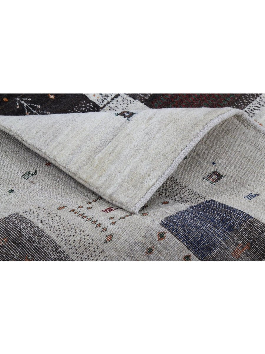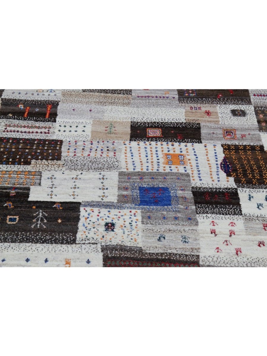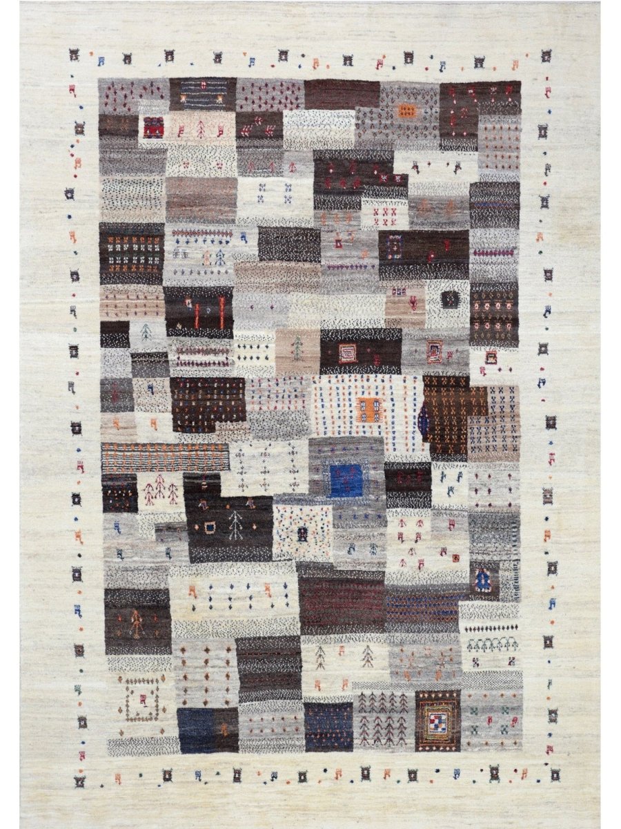 Infuse your home with unique character and comforting texture with this remarkable hand-knotted 6x9 Persian Gabbeh area rug from Persia. This rug showcases an artistic patchwork pattern, created by a delightful arrangement of rectangular blocks. Each block features distinct designs, including geometric motifs, stylized figures, and subtle textures, all rendered in a harmonious blend of earth tones, deep brown, cream, and hints of blue and red. The overall effect is a rich that invites close inspection, offering visual interest and a sense of handcrafted artistry.