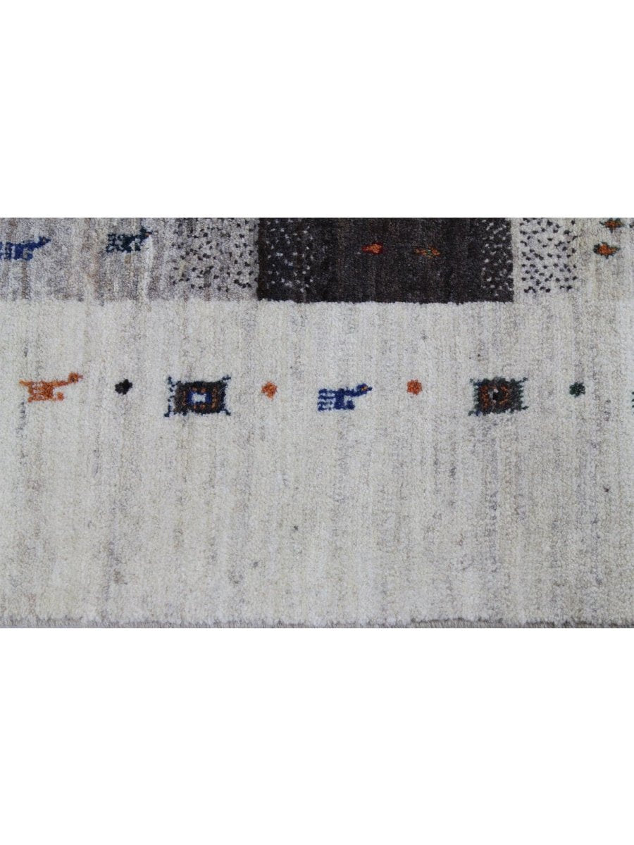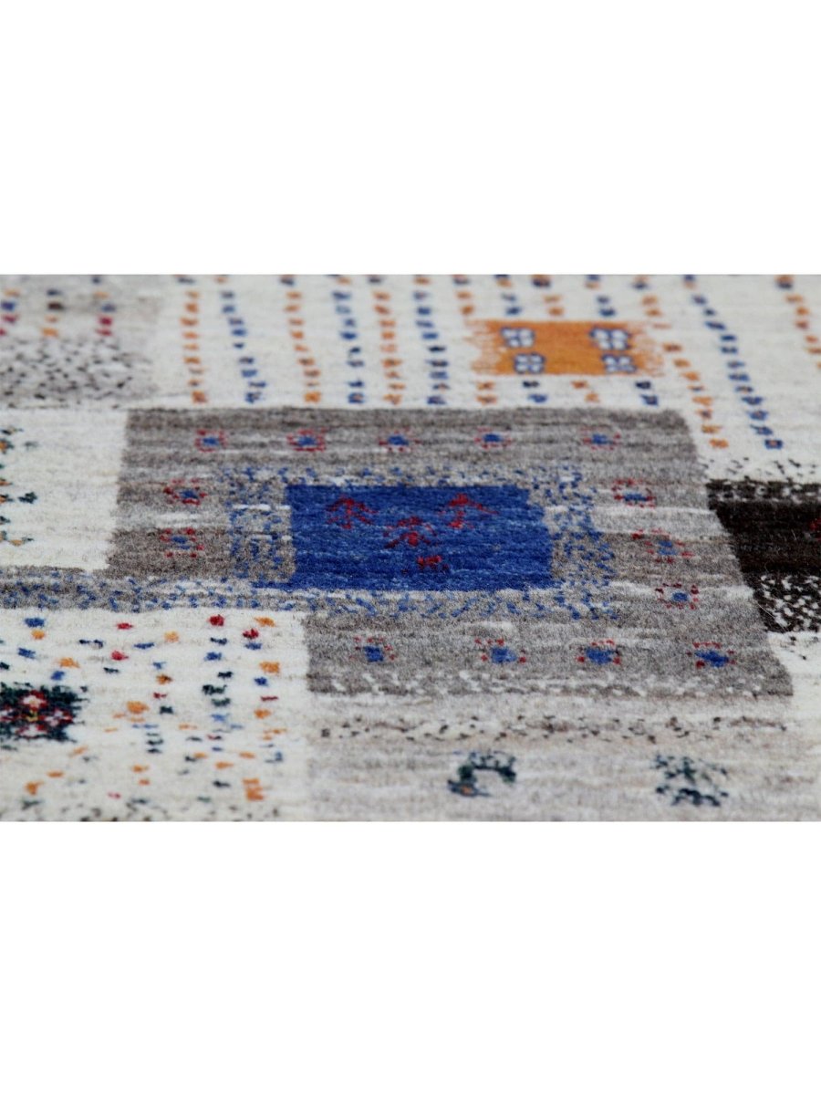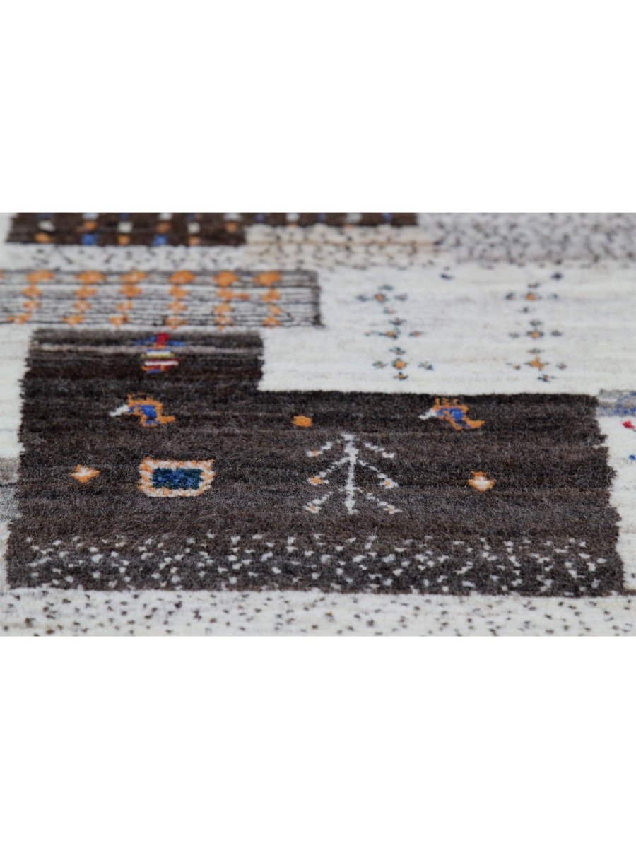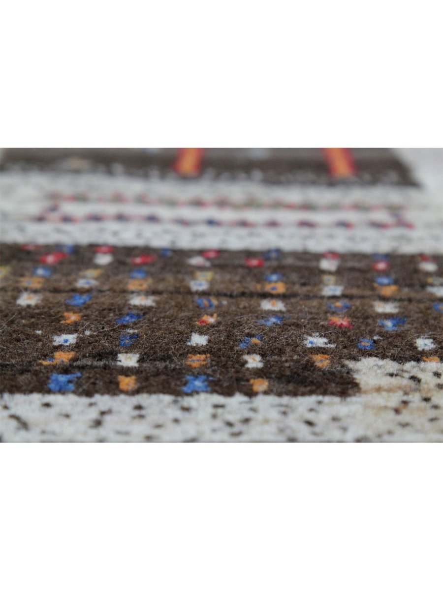 Infuse your home with unique character and comforting texture with this remarkable hand-knotted 6x9 Persian Gabbeh area rug from Persia. This rug showcases an artistic patchwork pattern, created by a delightful arrangement of rectangular blocks. Each block features distinct designs, including geometric motifs, stylized figures, and subtle textures, all rendered in a harmonious blend of earth tones, deep brown, cream, and hints of blue and red. The overall effect is a rich that invites close inspection, offering visual interest and a sense of handcrafted artistry.