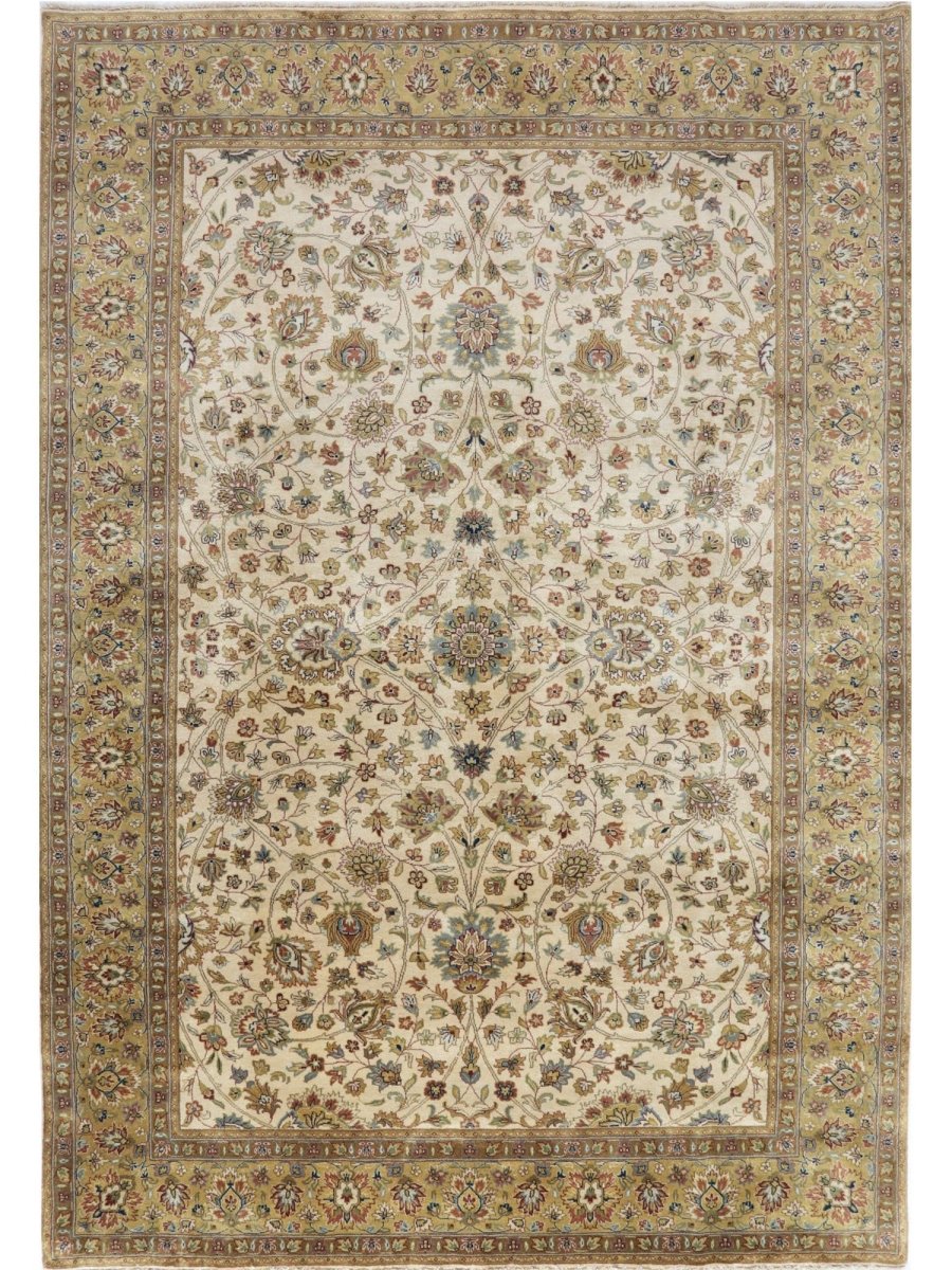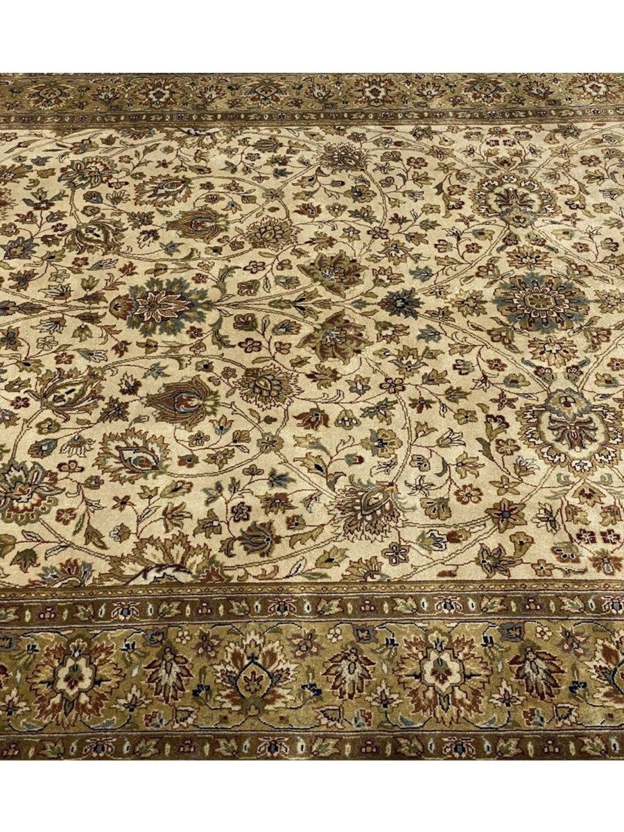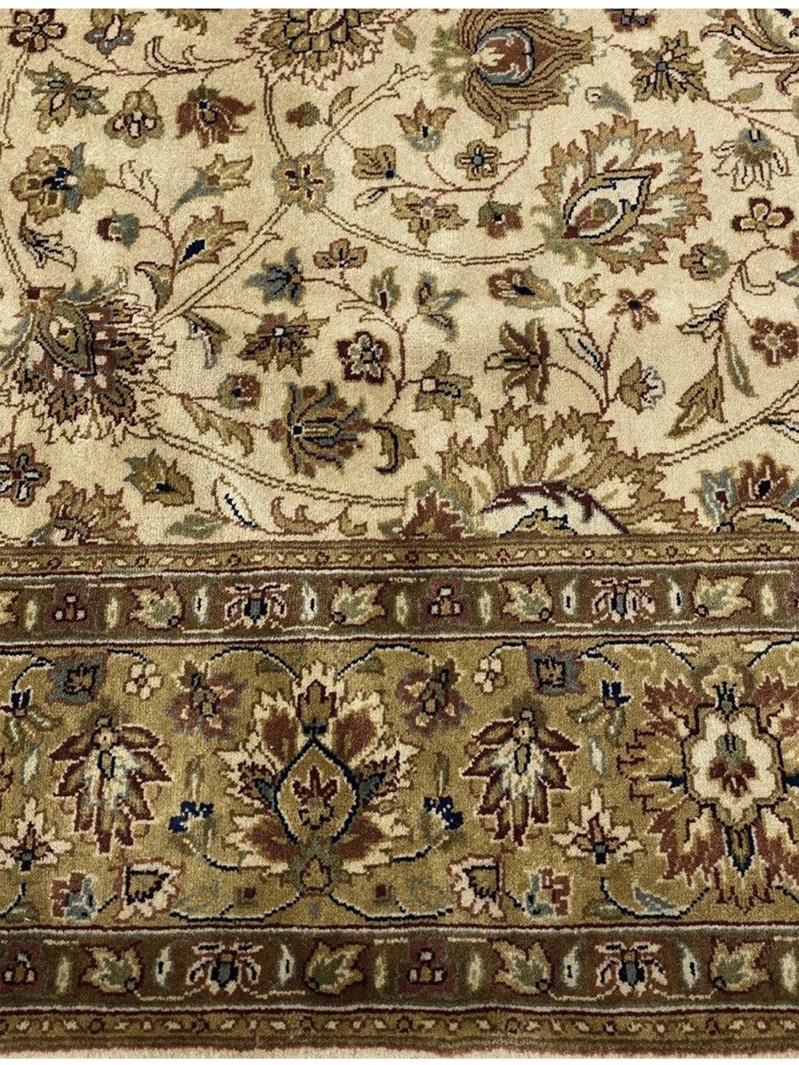 Add a touch of classic beauty to your home with this 6x9 handmade area rug, crafted in India. This rug features a captivating floral pattern with a central medallion, showcasing intricate motifs in a soft light beige, gold, and light blue palette. Composed of durable wool, it ensures longevity and is perfect for living areas, bedrooms, or dining spaces. The intricate border detail reflects expert craftsmanship and enduring design. This piece effortlessly complements, adding warmth, texture, and sophistication. A true blend of artistry and utility, it easily brings heritage charm into any space. Enjoy the benefit of free shipping across the United States. Each rug has one-of-a-kind subtle variations inherent to its creation.
