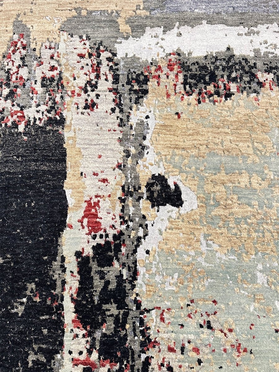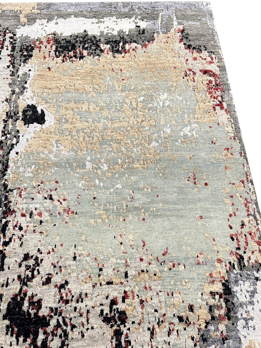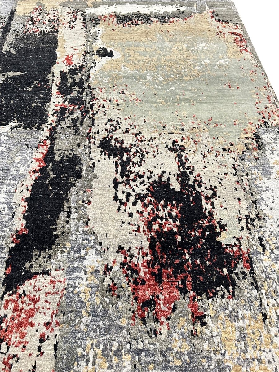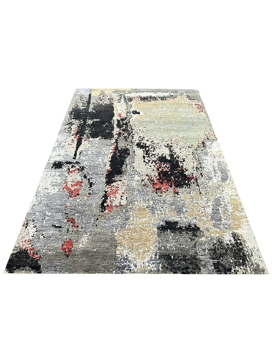 Experience the elegance of the 6x8 Modern Abstract Area Rug, a unique piece that brings beauty to your home. Hand-knotted from quality wool and bamboo silk, this rug features an abstract pattern that adds charm to any room. It makes the space feel cozy and inviting. The combination of black, gray, tan, olive, sage green, red, and ivory suits any style. This item beautifies your space and stands as a piece of art. Get free shipping in the U.S.