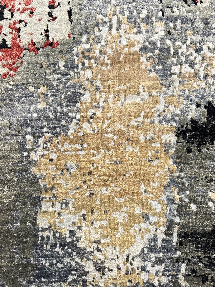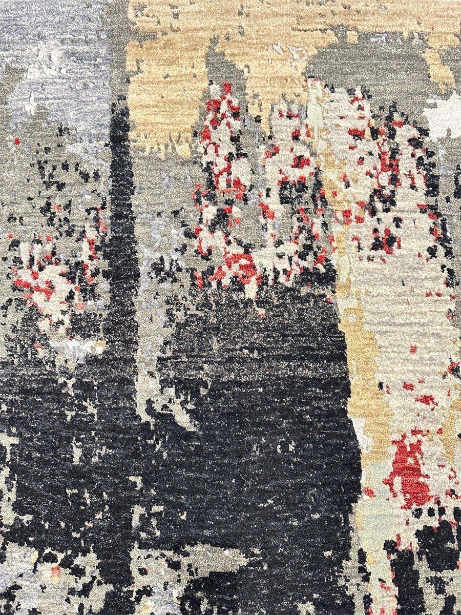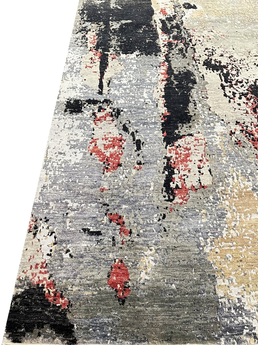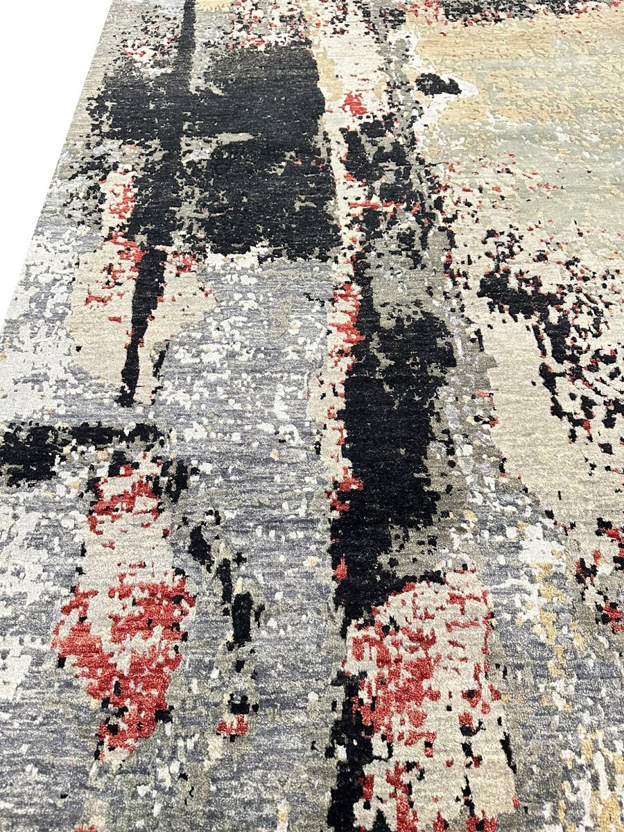 Experience the elegance of the 6x8 Modern Abstract Area Rug, a unique piece that brings beauty to your home. Hand-knotted from quality wool and bamboo silk, this rug features an abstract pattern that adds charm to any room. It makes the space feel cozy and inviting. The combination of black, gray, tan, olive, sage green, red, and ivory suits any style. This item beautifies your space and stands as a piece of art. Get free shipping in the U.S.