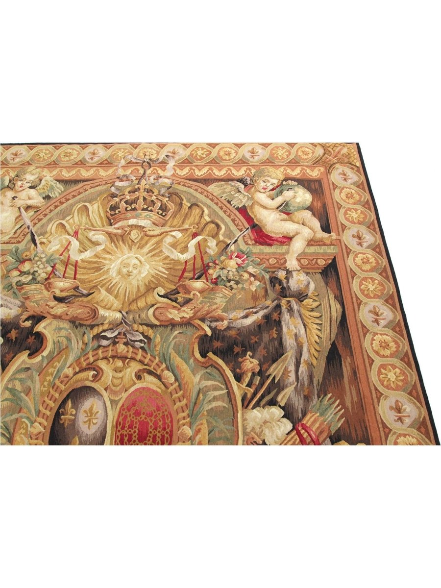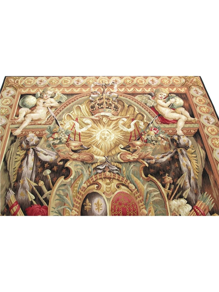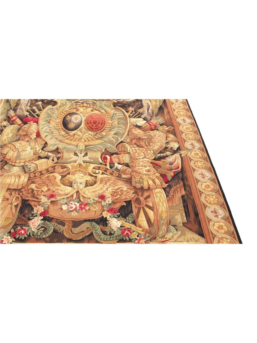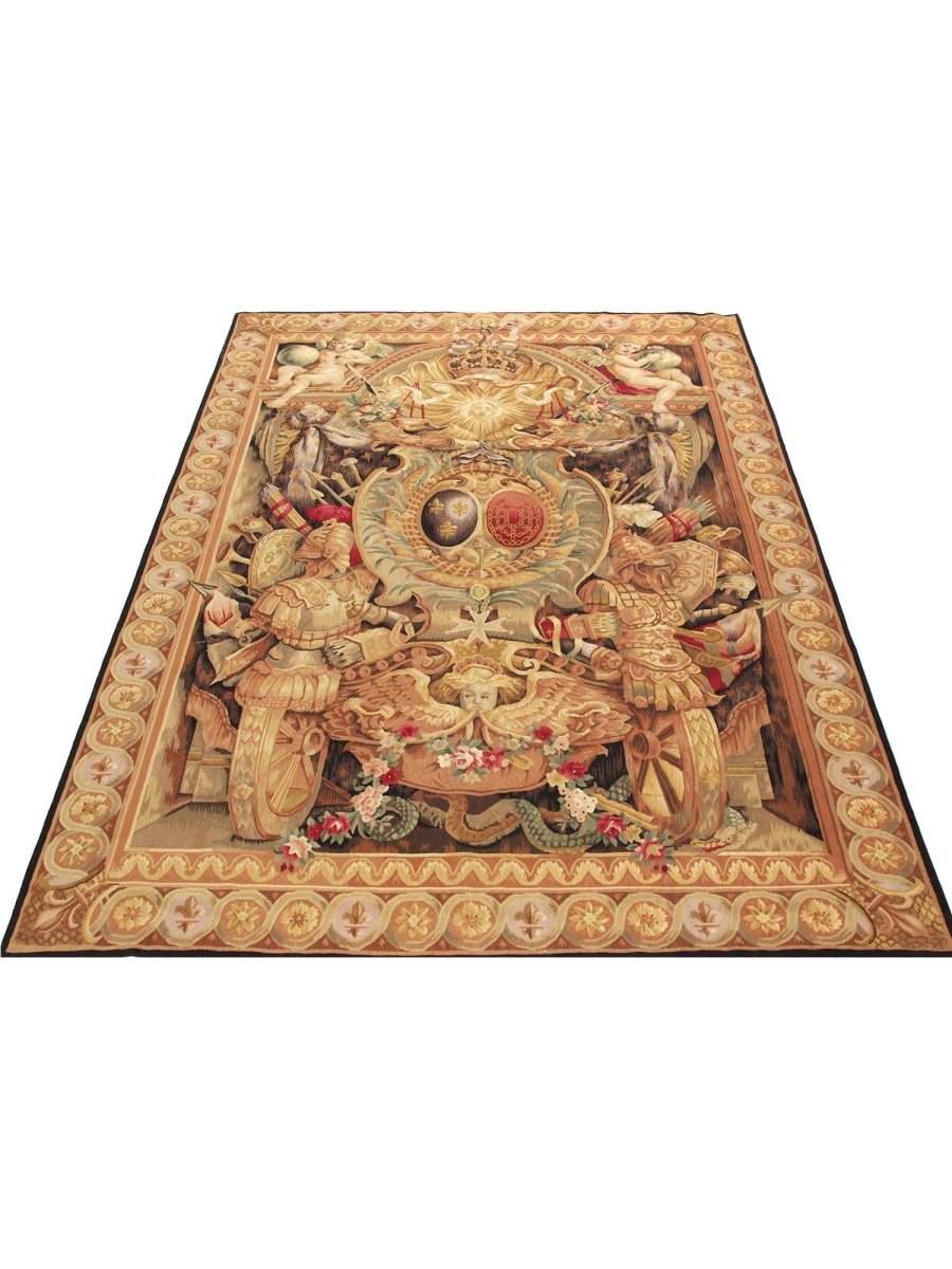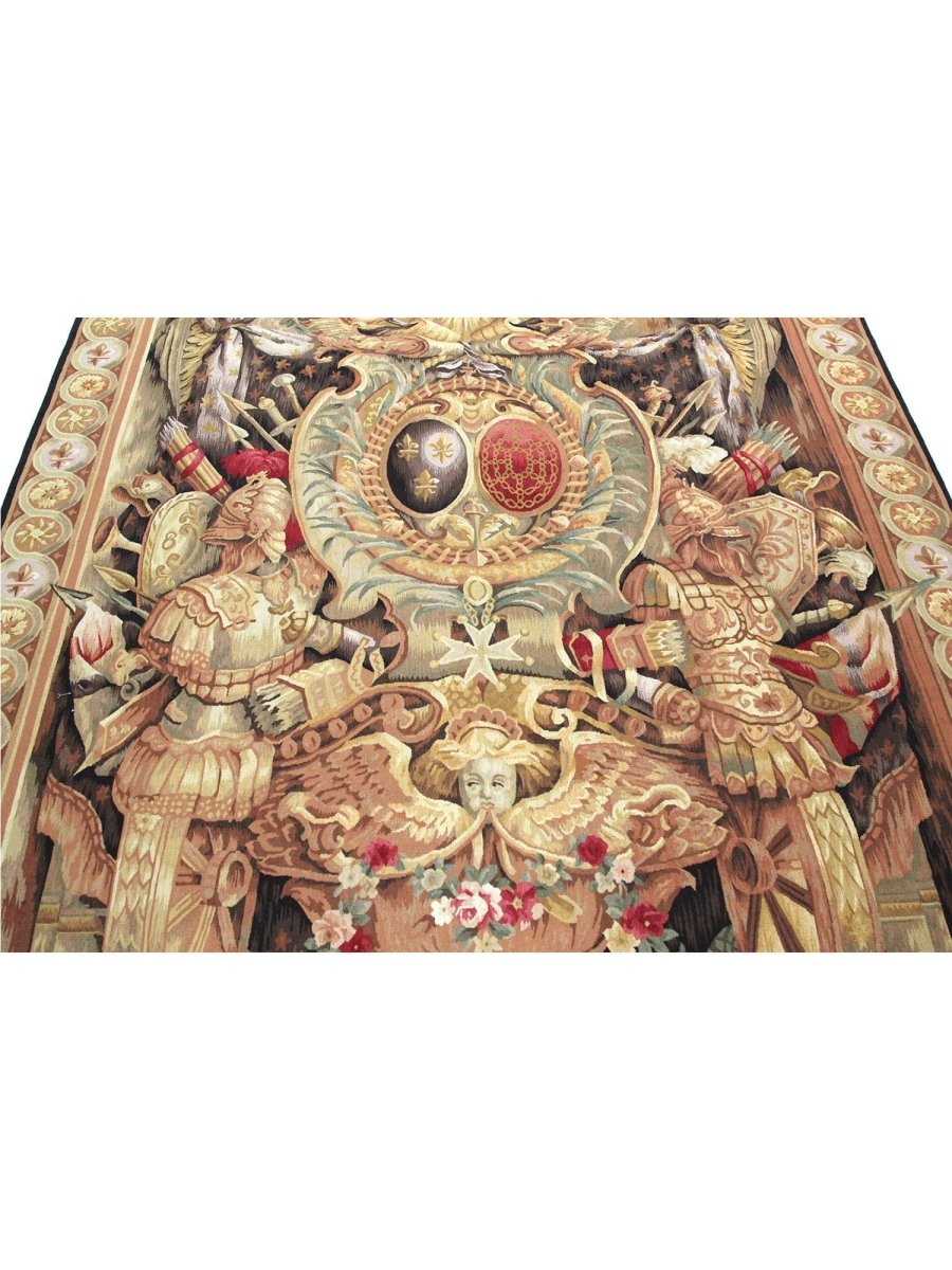 Enjoy the powerful historical presence of this 6x9 17th Century Tapestry Recreation, "Elements of War." Meticulously hand-knotted in China from fine wool, this exquisite piece vividly displays a captivating pictorial motif, carefully reinterpreting the symbolic representation of warfare from the era. The sophisticated color scheme showcases a foundation of various beige and gold tones, contrasted by deep red accents signifying valor, muted green for symbolic elements, and dark brown and black to define the intricate details and figures.