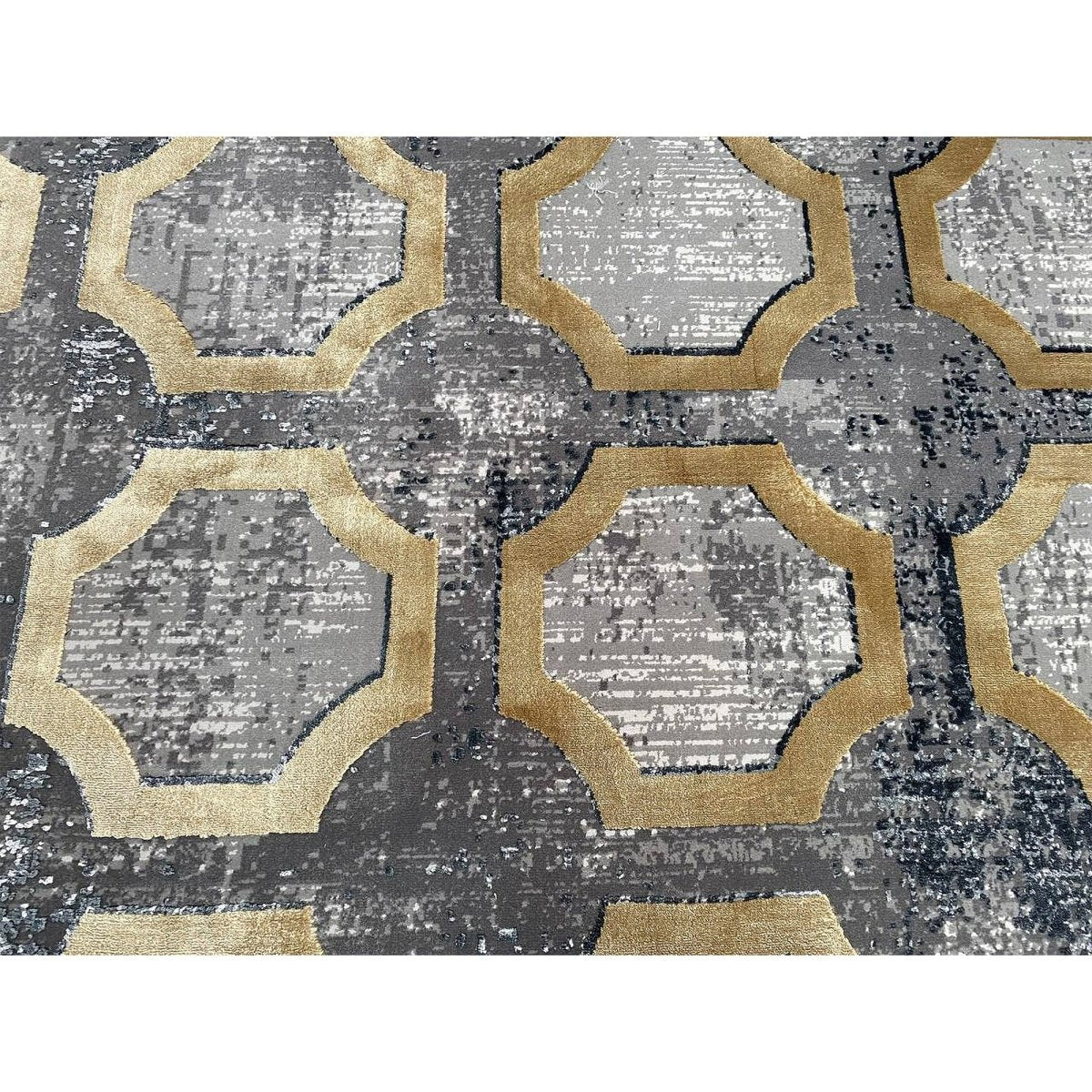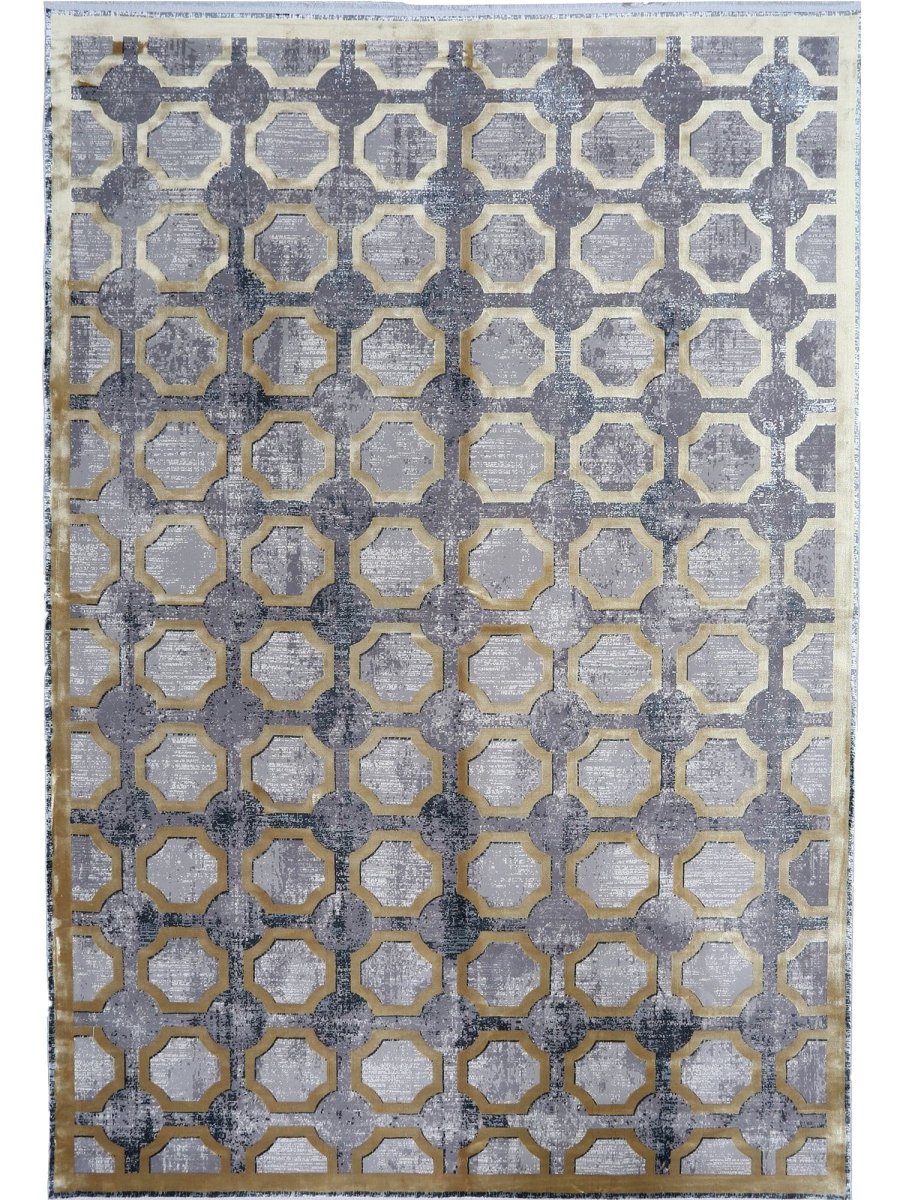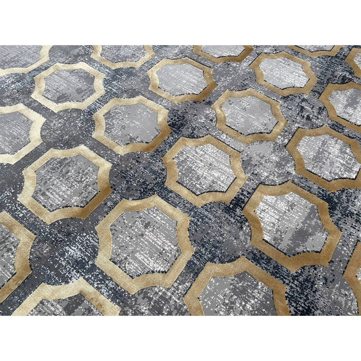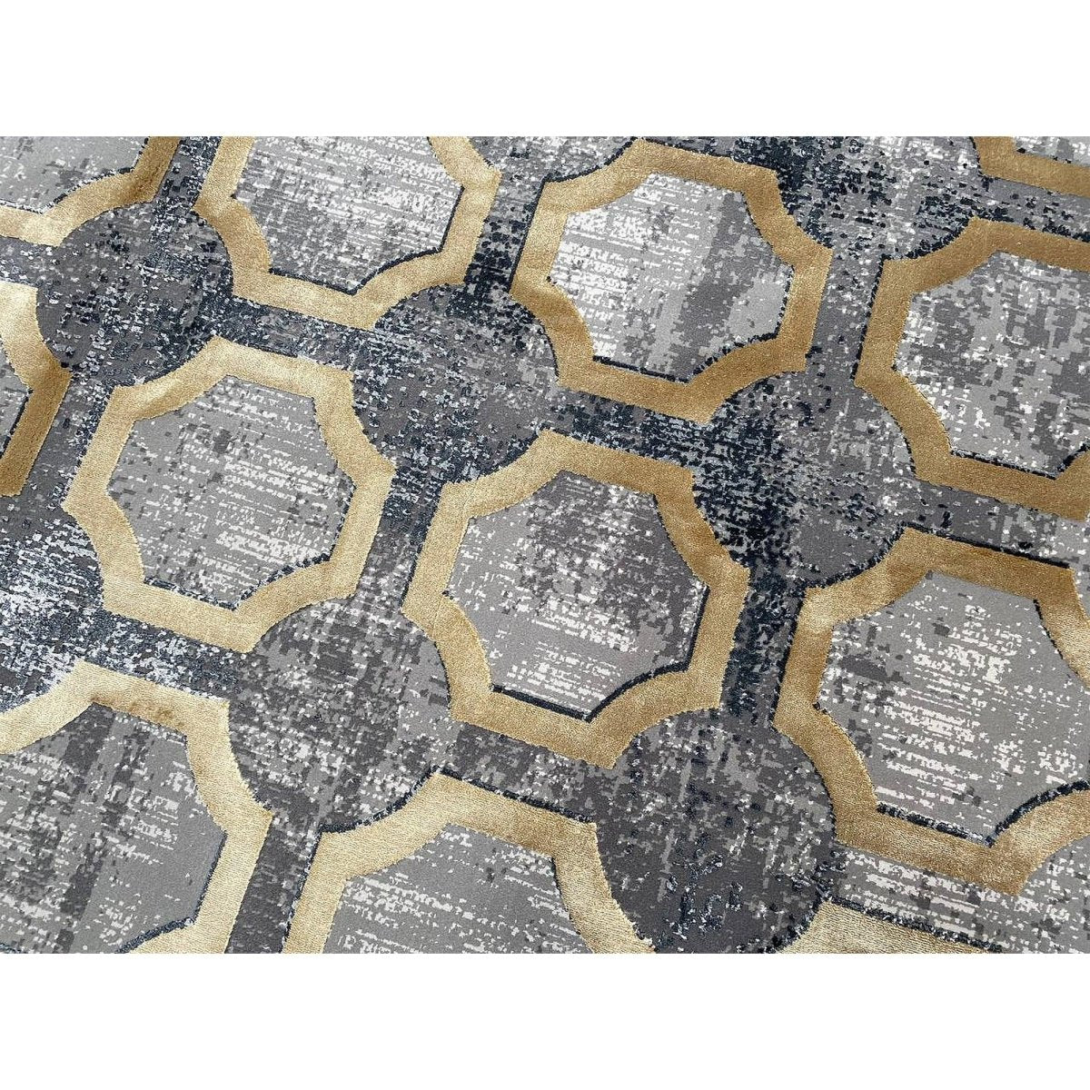 Upgrade your decor with this 6' x 9' contemporary Turkish area rug, featuring a sophisticated geometric pattern in gray, ivory, charcoal, and gold tones. Machine-made in Turkey from high-quality polypropylene, this rug offers exceptional durability, stain resistance, and a soft texture underfoot. Measuring 6'5" x 9'5", it adds a stylish and contemporary touch to any interior. Its refined color palette and elegant craftsmanship create visual interest and warmth, making it a timeless addition to your decor. Enjoy free U.S. shipping.