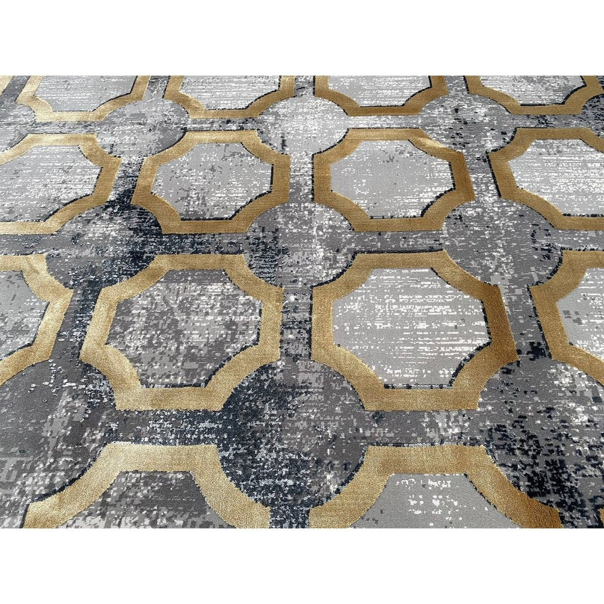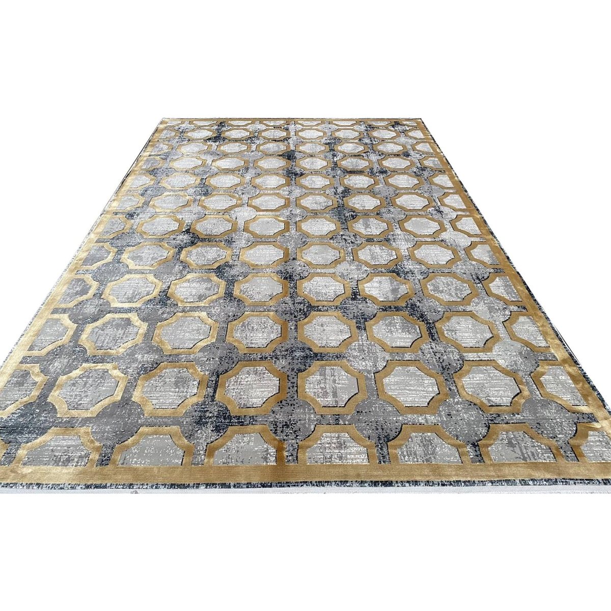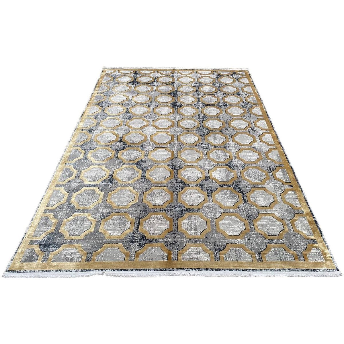 Upgrade your decor with this 6' x 9' contemporary Turkish area rug, featuring a sophisticated geometric pattern in gray, ivory, charcoal, and gold tones. Machine-made in Turkey from high-quality polypropylene, this rug offers exceptional durability, stain resistance, and a soft texture underfoot. Measuring 6'5" x 9'5", it adds a stylish and contemporary touch to any interior. Its refined color palette and elegant craftsmanship create visual interest and warmth, making it a timeless addition to your decor. Enjoy free U.S. shipping.