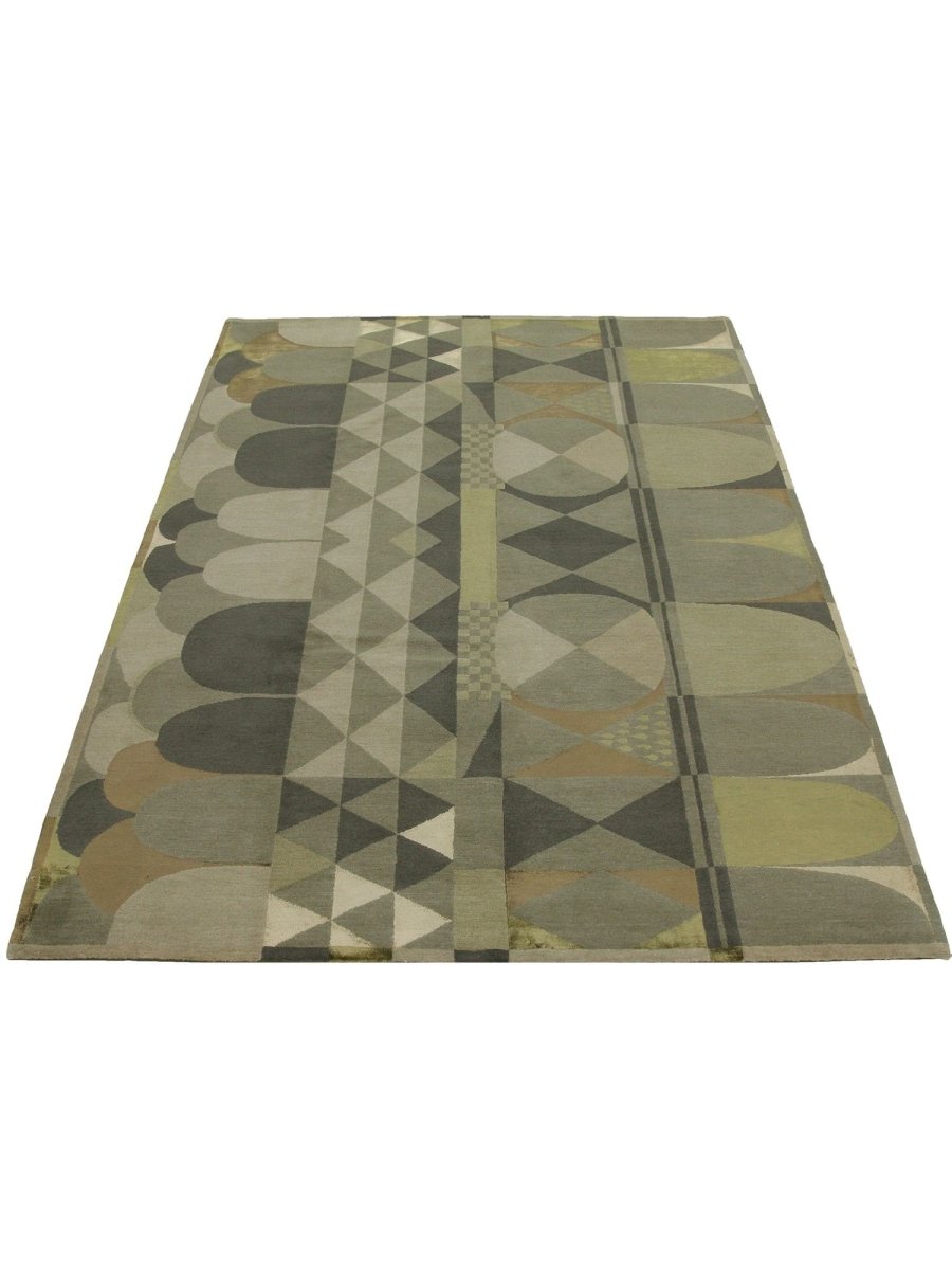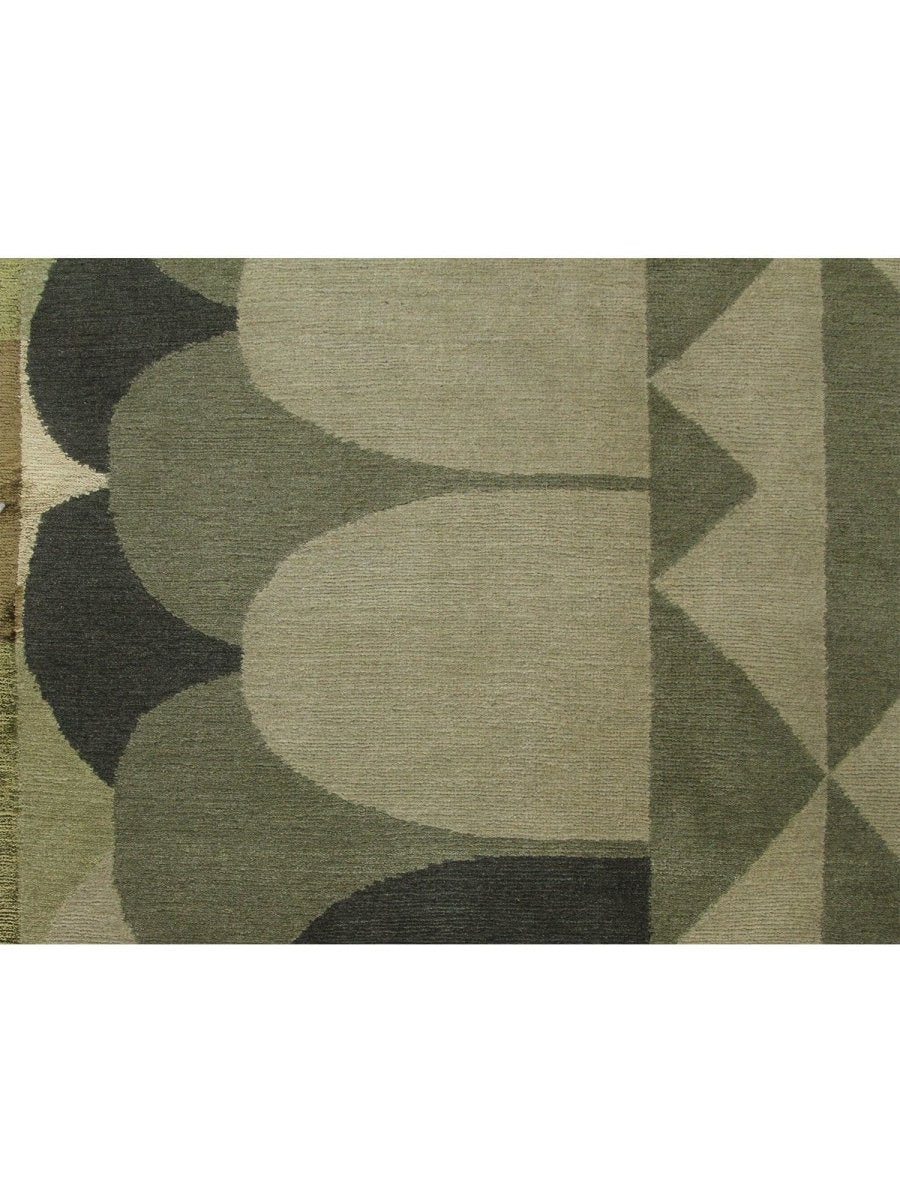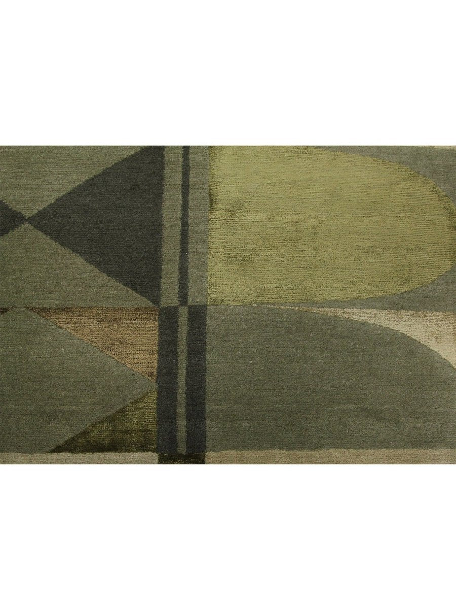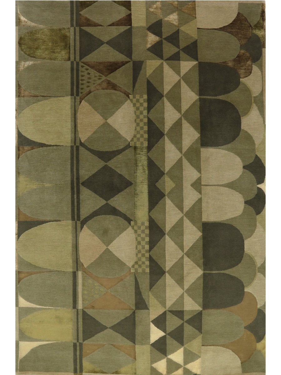 Immerse your space in the sophisticated allure of this magnificent 6x9 Transitional Nepali Area Rug. Hand-knotted by skilled artisans in Nepal from a luxurious blend of premium wool and natural silk, this new rug offers a durable yet exquisitely soft underfoot feel. The captivating geometric pattern unfolds in an intriguing arrangement of various shapes, including diamonds, half-circles, and checkered sections, organized into compelling vertical bands, creating a visually dynamic statement that effortlessly enhances any room. It is presented in a rich, earthy color palette of various shades of green, warm brown, and subtle beige tones, creating a harmonious and natural aesthetic that brings a sense of calm and depth to your interior.