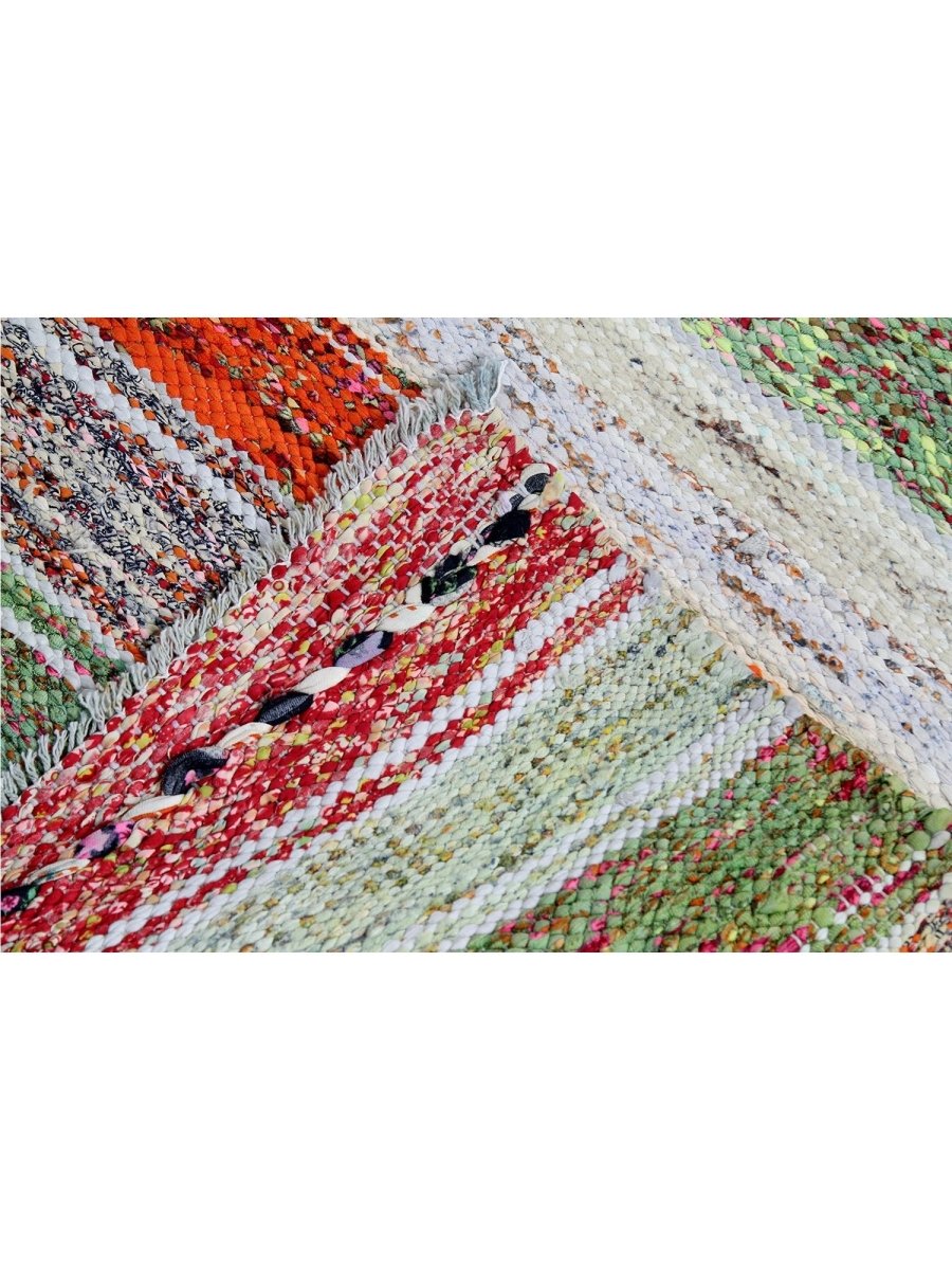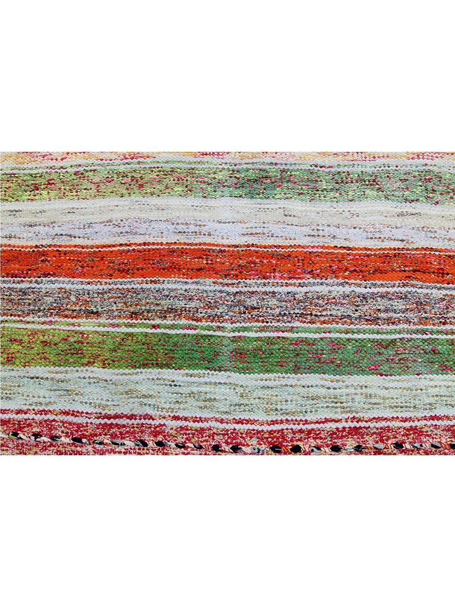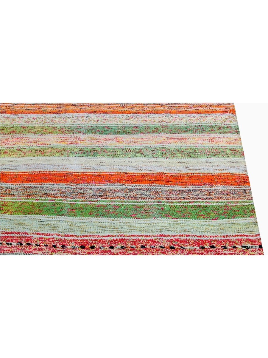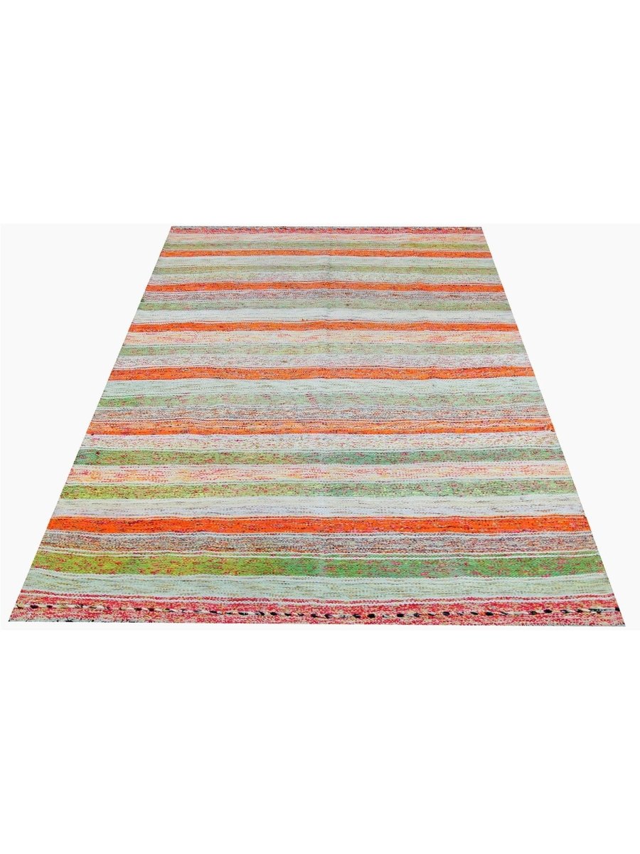 The 6x9 Old Persian Kilim Area Rug brings rustic charm with its earthy color palette and textured striped design. Hand-knotted in Persia from high-quality wool, this rug features a soft gray base enhanced by bold stripes in shades of orange and green and hints of red. The delicate woven texture incorporates flecks of various colors, adding depth and warmth. The balanced mix of neutral and vibrant hues makes this rug versatile for chic and bohemian interiors. Its wool construction ensures durability while offering a soft, inviting feel underfoot. This rug is ideal for living rooms, entryways, or cozy reading nooks. Experience the perfect combination of beauty, durability, and artistry.