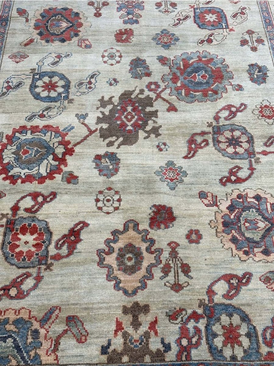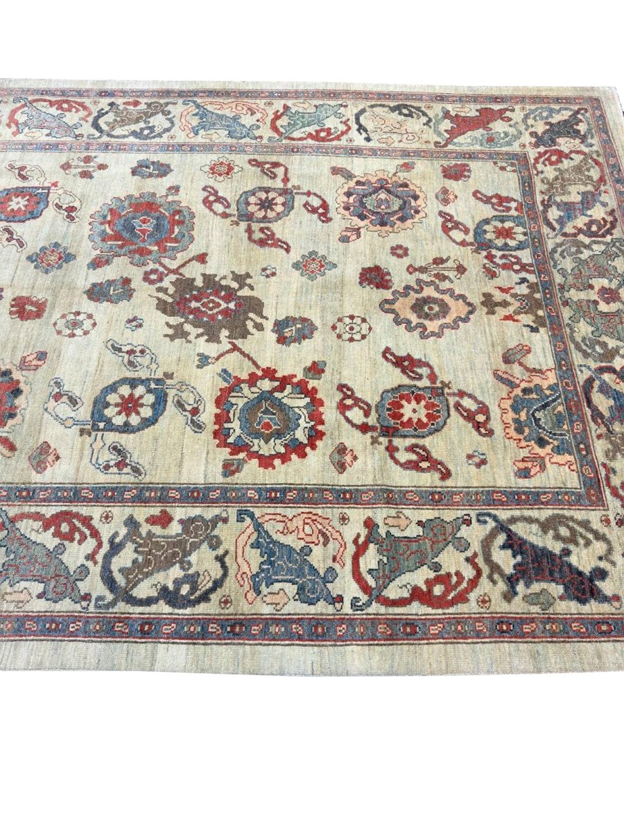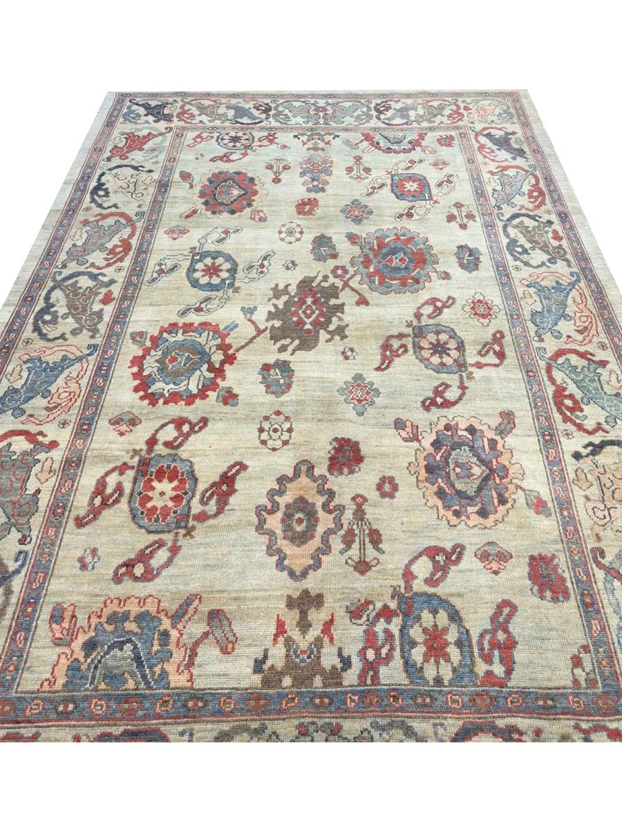 Decorate your space with the refined elegance of this 6x9 Persian Sultanabad area rug. Skillfully handcrafted in Persia from wool, this remarkable piece features a captivating all-over geometric design. Large, stylized motifs fill the entire surface in a scattered layout. Field displays a lovely light beige hue, providing a subtle backdrop for intricate artwork. Detailed design incorporates shapes and elements in a red, blue, brown, and muted green palette. This versatile-sized rug is perfect for enhancing bedrooms, home offices, or smaller living spaces. Constructed using traditional knotting techniques, wool textile offers lasting quality and a soft feel underfoot. Receive convenient, free, swift delivery throughout the United States.