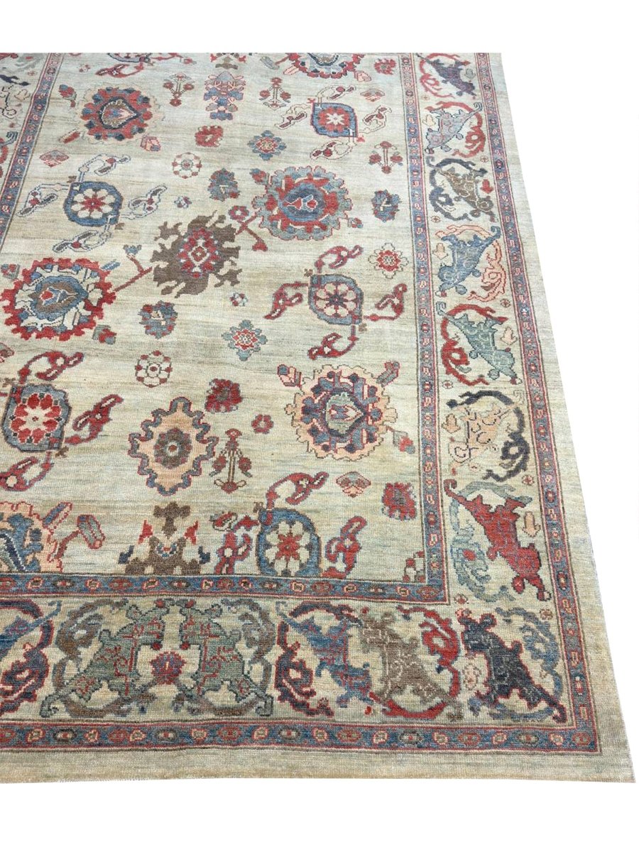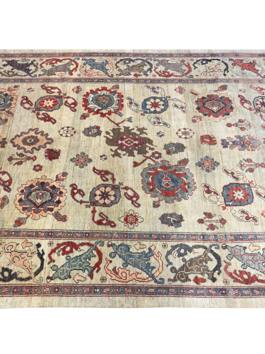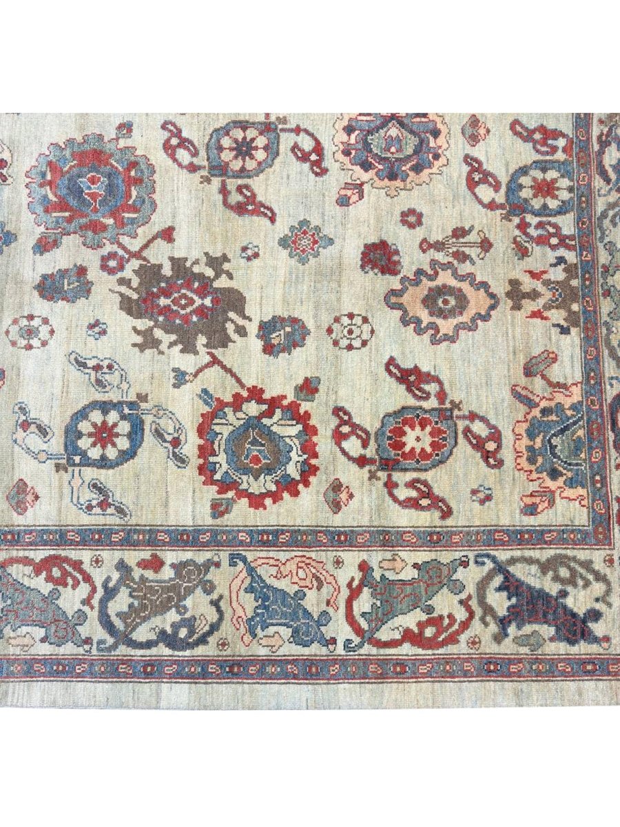 Decorate your space with the refined elegance of this 6x9 Persian Sultanabad area rug. Skillfully handcrafted in Persia from wool, this remarkable piece features a captivating all-over geometric design. Large, stylized motifs fill the entire surface in a scattered layout. Field displays a lovely light beige hue, providing a subtle backdrop for intricate artwork. Detailed design incorporates shapes and elements in a red, blue, brown, and muted green palette. This versatile-sized rug is perfect for enhancing bedrooms, home offices, or smaller living spaces. Constructed using traditional knotting techniques, wool textile offers lasting quality and a soft feel underfoot. Receive convenient, free, swift delivery throughout the United States.