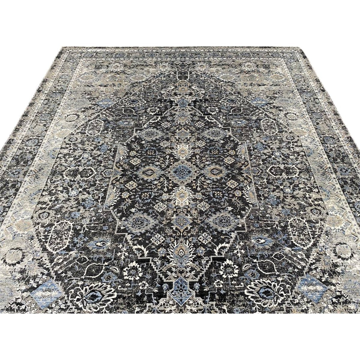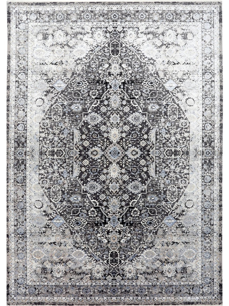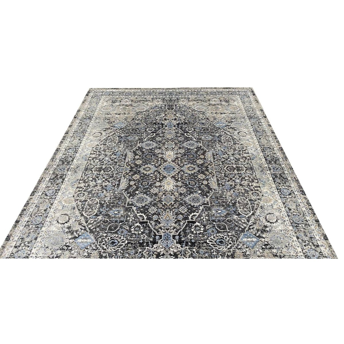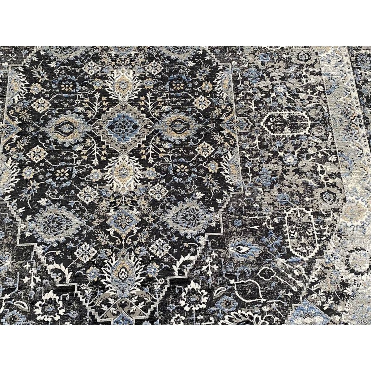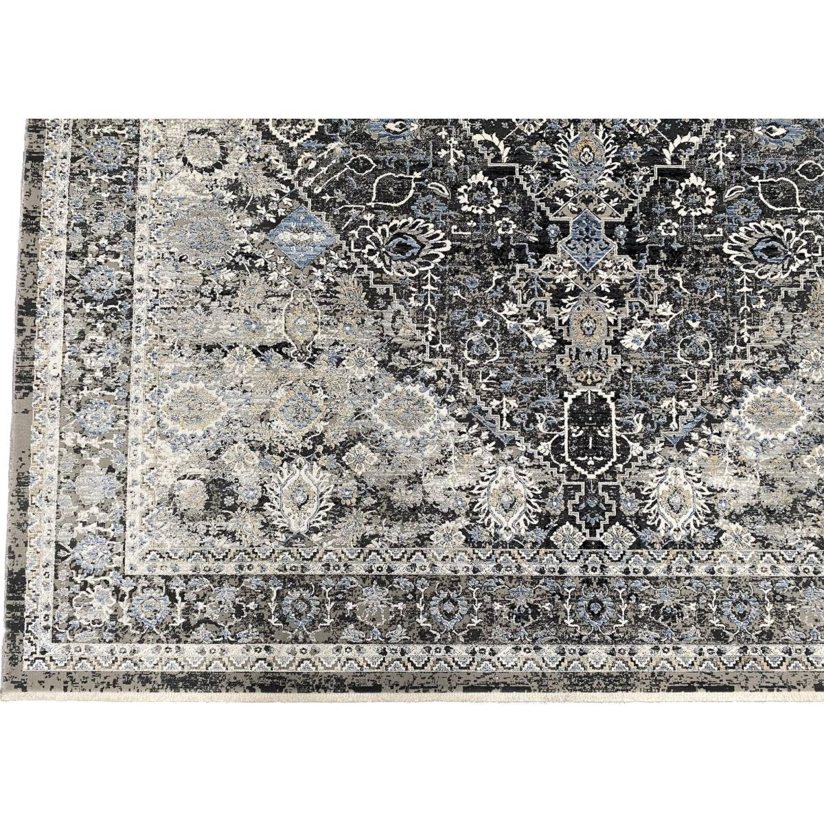 Add warmth and sophistication with 7x9 Transitional Turkish Area Rug, an original addition to your home that brings classic style and charm. Beautifully machine made from the finest quality polypropylene, this stunning rug features a geometric design that adds character and style to the room. An ideal choice for dining rooms, living spaces, or for adding drama to the entranceway, it creates a cozy atmosphere. The striking combination of black, white, gray, and blue makes it a suitable enhancement for any home style. This outstanding piece not only adds great beauty to your decor but also serves as a fine piece of artwork. Enjoy free shipping in the US.