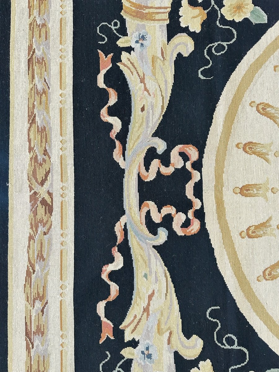 The deep black primary field provides a dramatic backdrop, enhancing the richness of the design. At the center, an ivory oval medallion displays a graceful arrangement of flowers, ribbons, and classical motifs, surrounded by a wreath of multicolored blooms in pink, blue, gold, and soft green. Large cornucopia-style bouquets in each corner echo the central theme, adding harmony and visual balance.