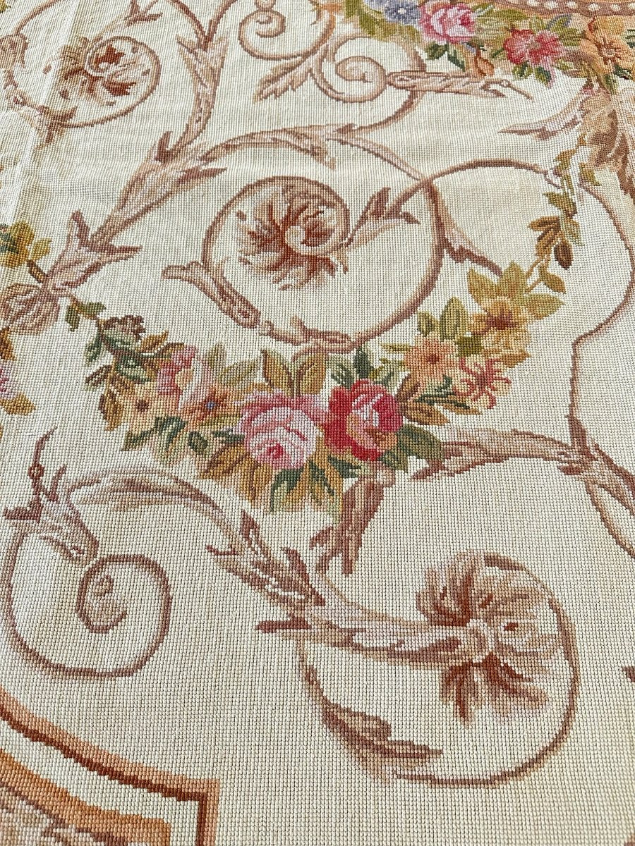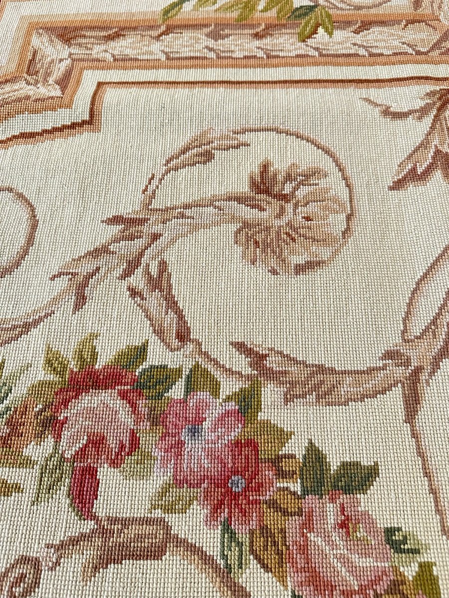 Handcrafted from wool, this needlepoint rug offers a smooth, tapestry-like texture, combining durability with decorative artistry. Made in China and new in condition, it brings timeless refinement and visual elegance.