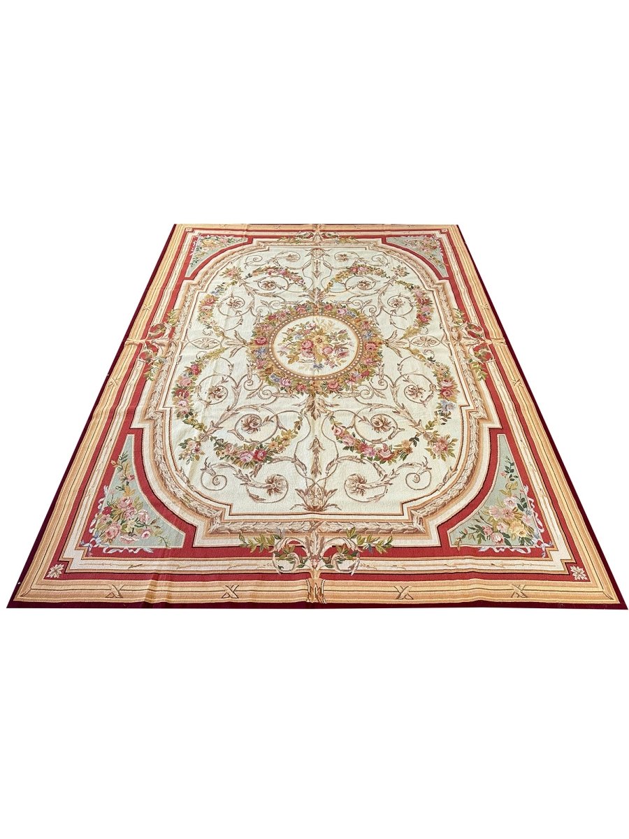 This 8' x 10' French Style Needlepoint Area Rug presents an elegant, flower-inspired design rooted in classical European tradition. An ivory ground sets the stage for a richly detailed central floral medallion, composed of roses and delicate blossoms in soft multicolor hues, surrounded by flowing acanthus scrolls, floral garlands, and symmetrical vinework. An ornate architectural border with warm accents of red, gold, sage, and blush frames the composition, adding depth and sophistication.