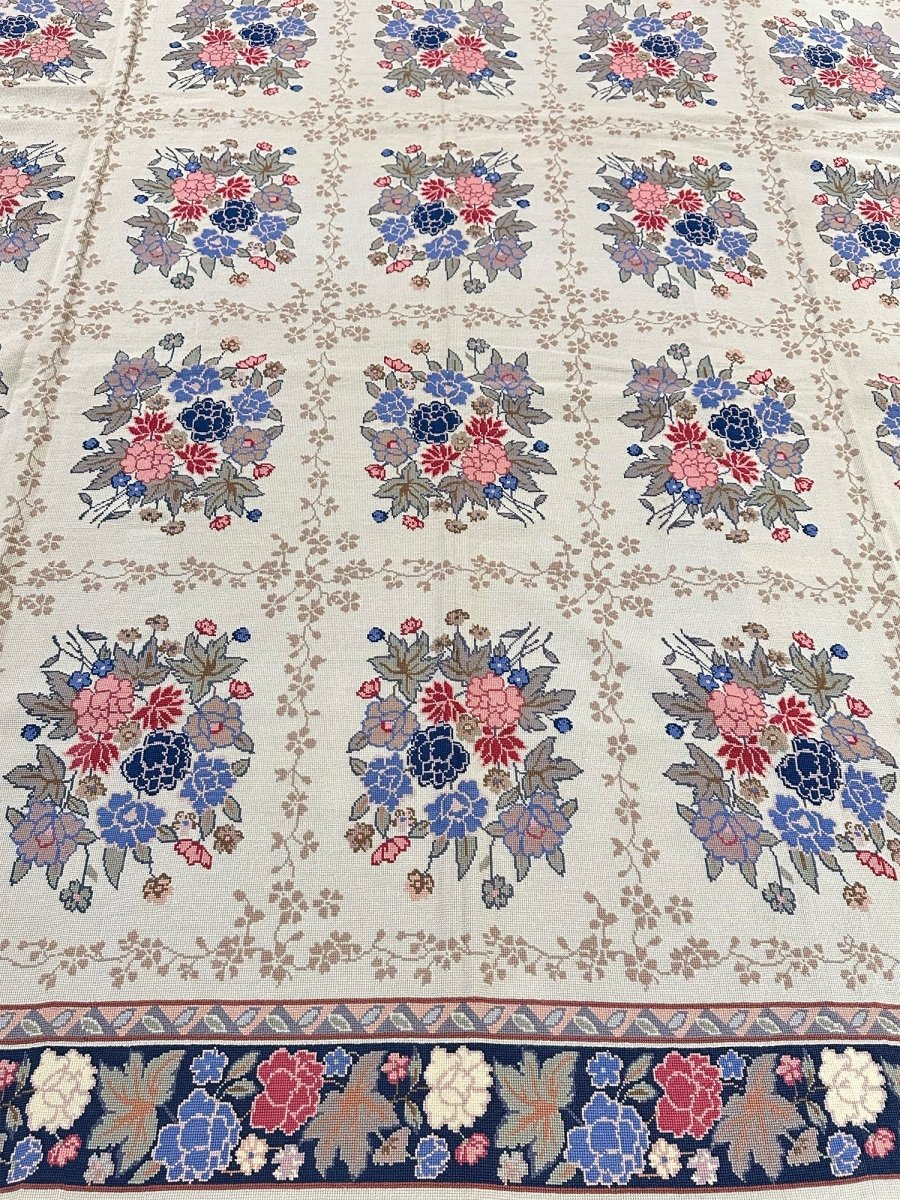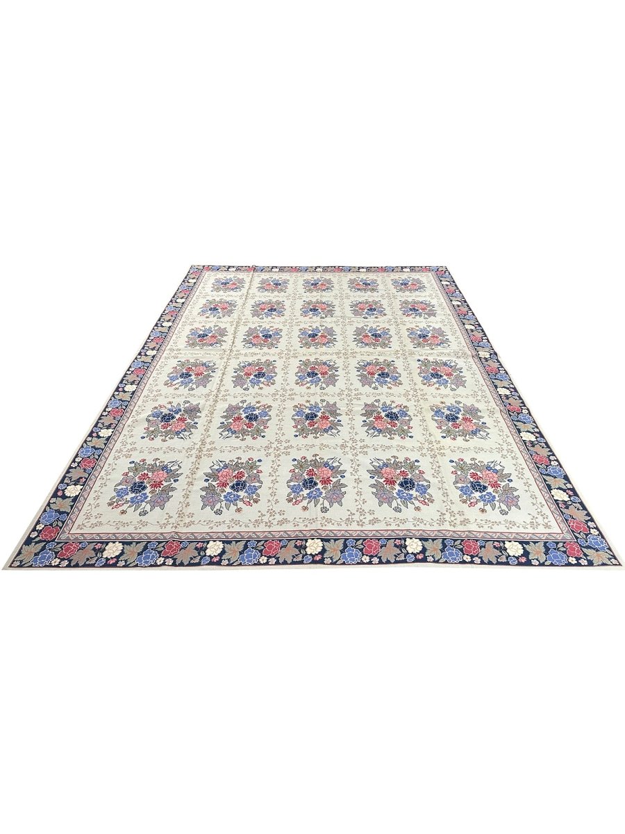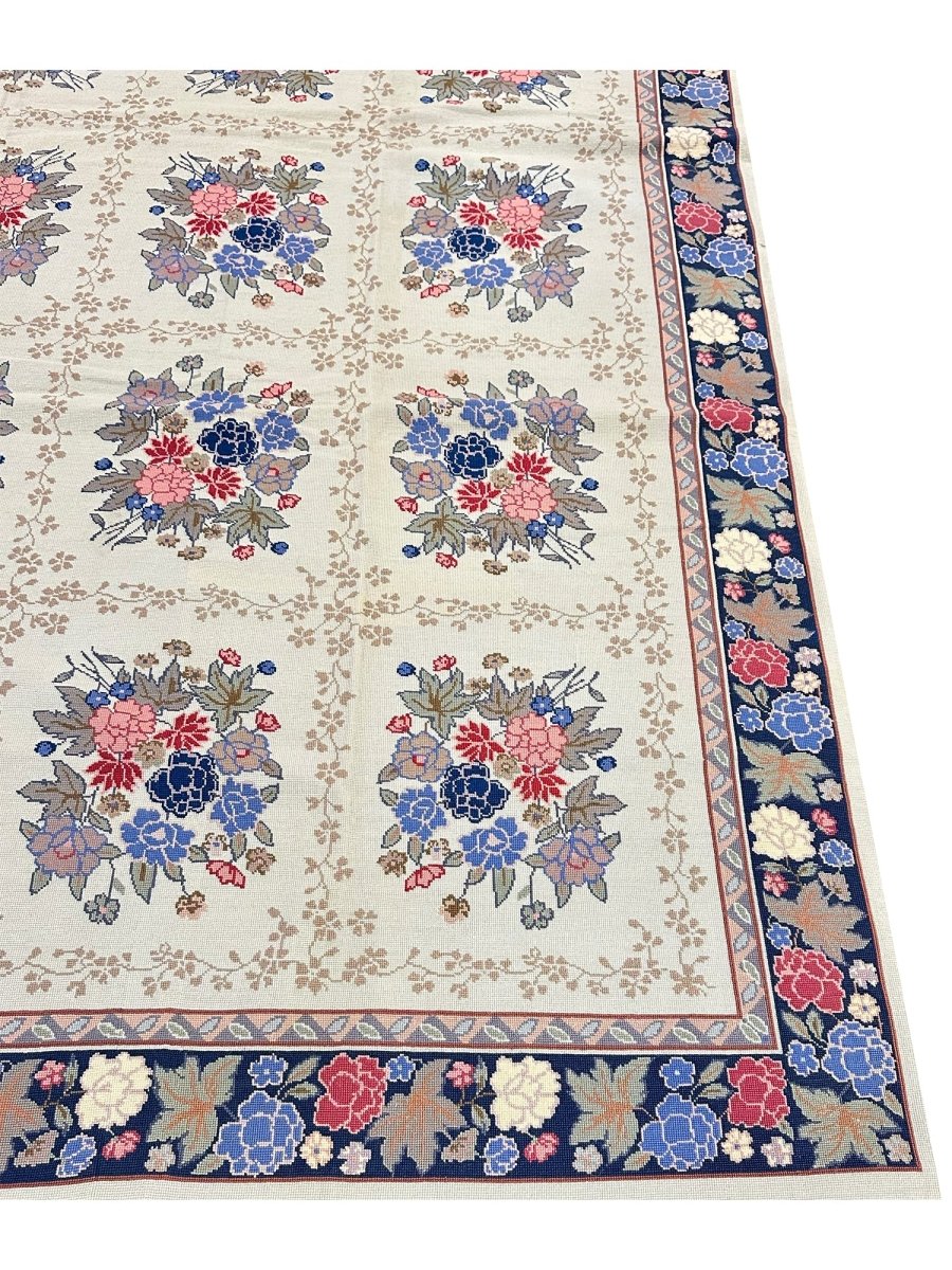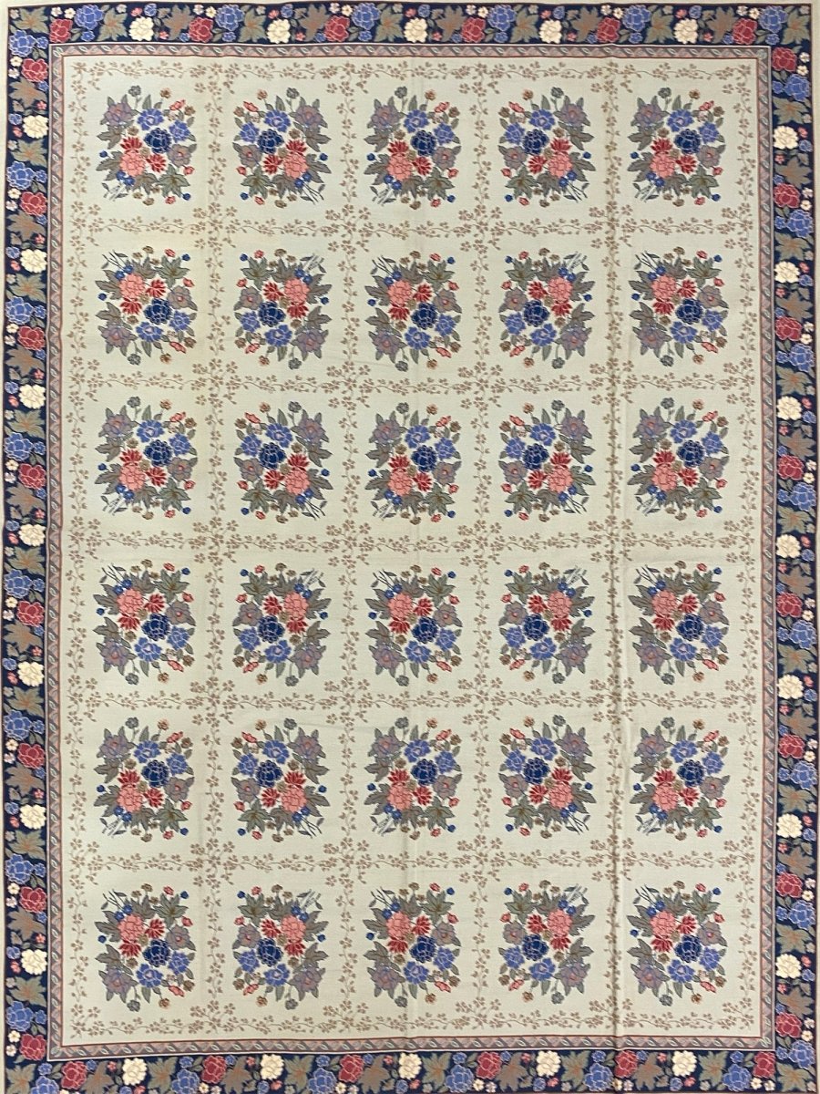 This 8x11 Chinese Needlepoint Area Rug is handmade in China from high-quality new wool and features a classic floral panel design. Set on a soft beige field, the rug displays repeating floral bouquet motifs arranged in a structured grid pattern. Rich blue tones dominate the flowers, complemented by additional multicolor accents including rose, taupe, green, and ivory. A decorative floral border frames the design, adding balance and traditional elegance. Finely woven with a smooth needlepoint texture, this rug offers timeless style and durable craftsmanship.
