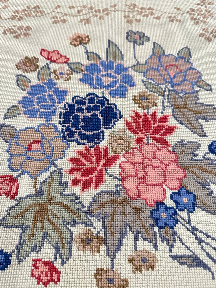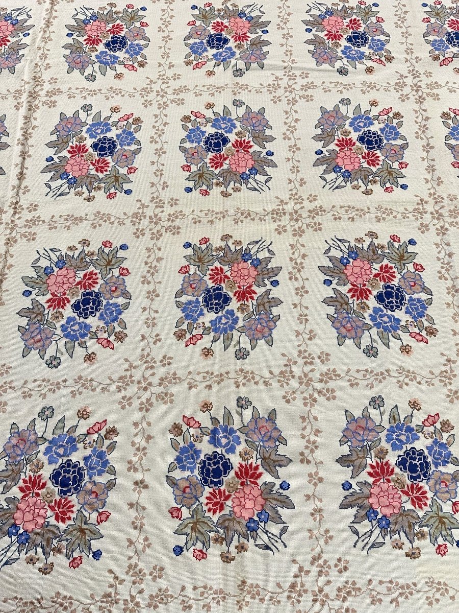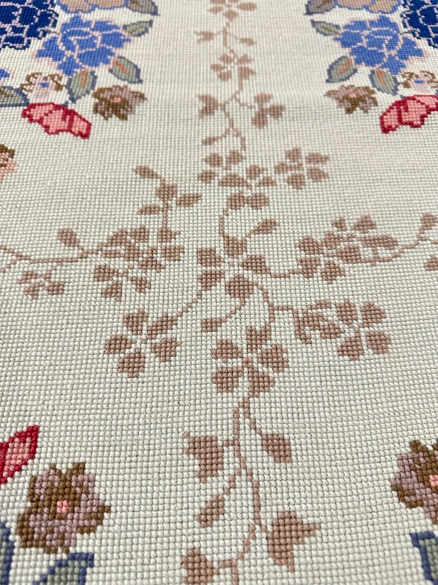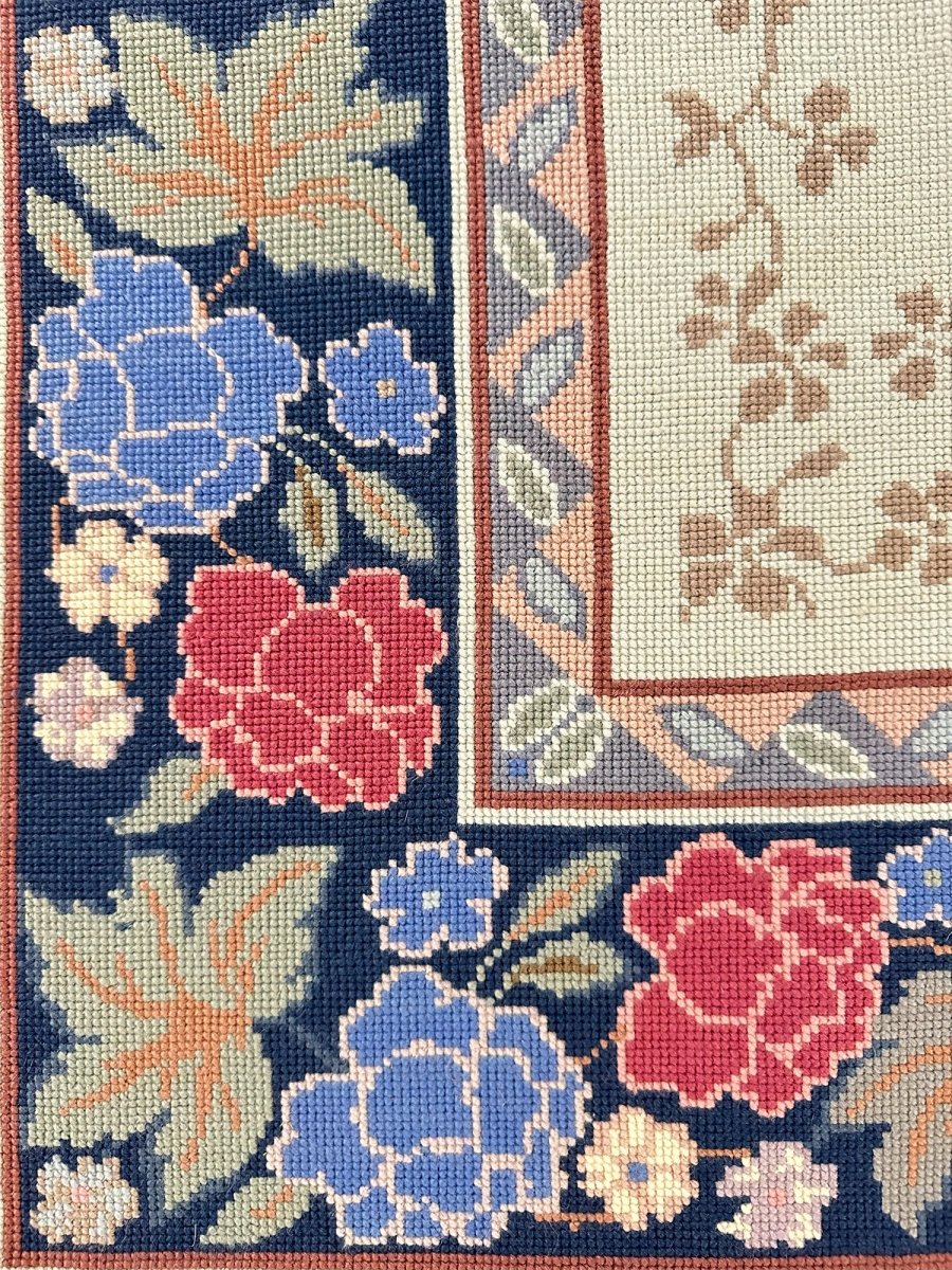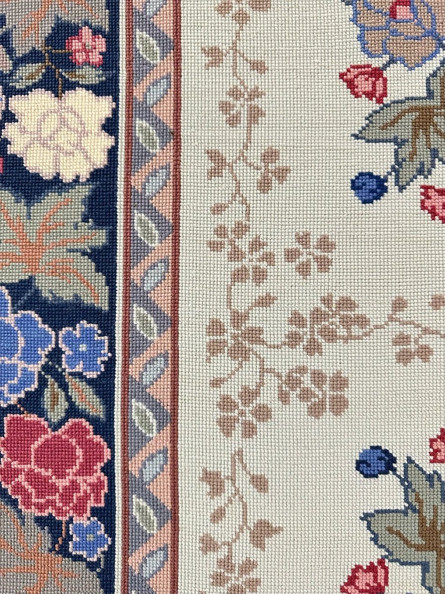 This 8x11 Chinese Needlepoint Area Rug is handmade in China from high-quality new wool and features a classic floral panel design. Set on a soft beige field, the rug displays repeating floral bouquet motifs arranged in a structured grid pattern. Rich blue tones dominate the flowers, complemented by additional multicolor accents including rose, taupe, green, and ivory. A decorative floral border frames the design, adding balance and traditional elegance. Finely woven with a smooth needlepoint texture, this rug offers timeless style and durable craftsmanship.