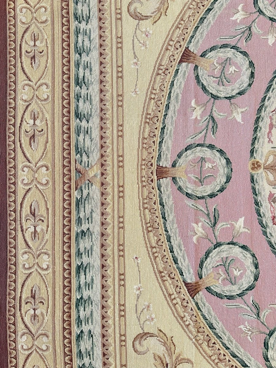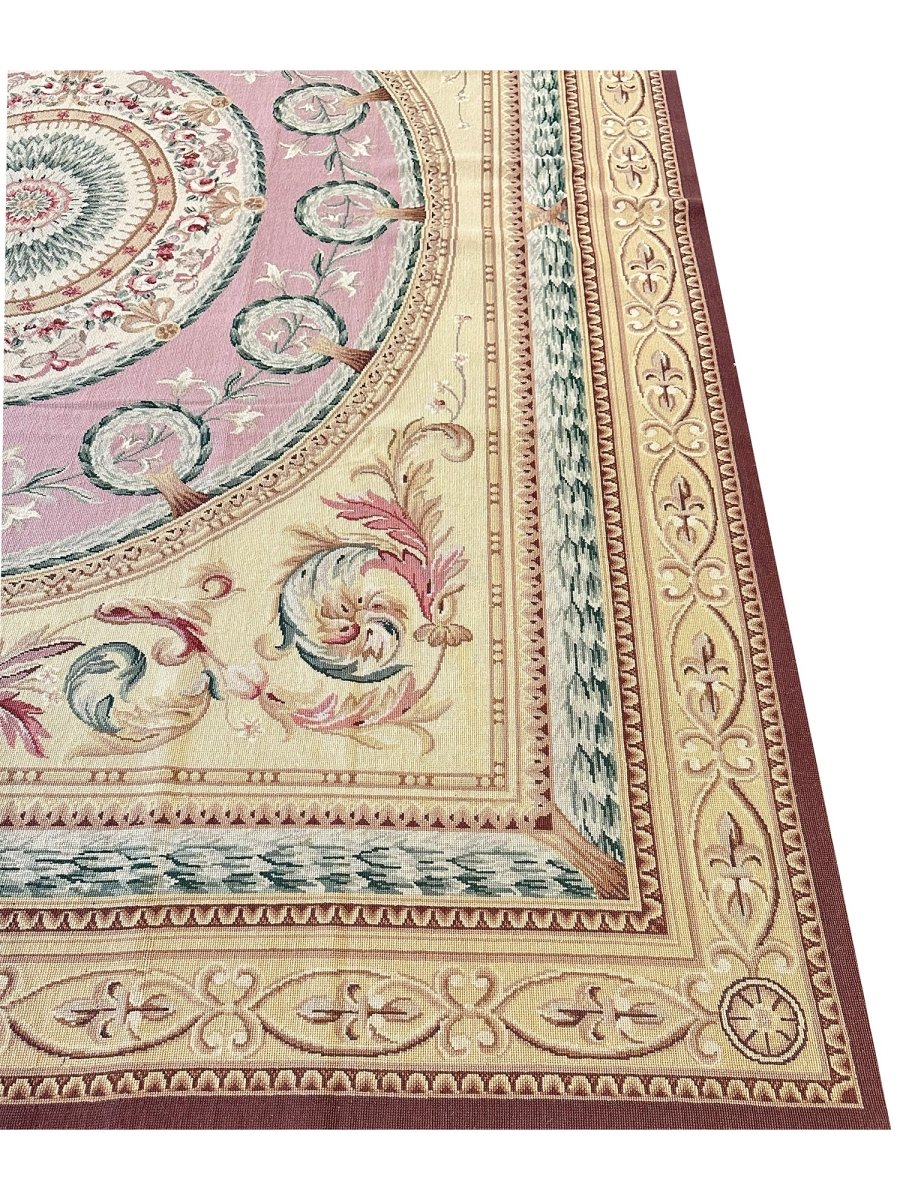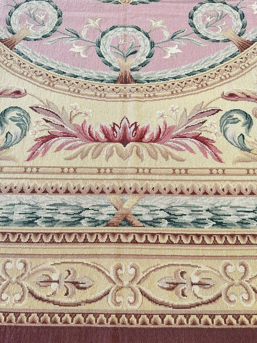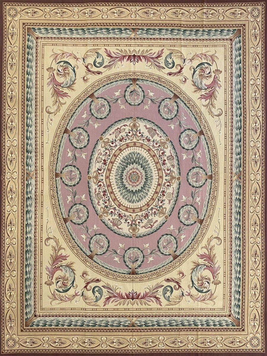 This 8' x 9' Chinese Needlepoint Area Rug presents a stunning display of neoclassical design with a richly layered geometric and floral composition. Set on a luxurious purple field, the rug features a dramatic central oval medallion with an intricate sunburst motif at its core, encircled by symmetrical rosettes and delicate botanical details. The beige outer field is adorned with elegant scrolling acanthus leaves and classical corner spandrels in coordinating mauve tones. Multiple decorative borders featuring geometric patterns, fleur-de-lis motifs, and rope designs frame the composition in soft gold, sage green, and ivory, creating magnificent depth and architectural grandeur.