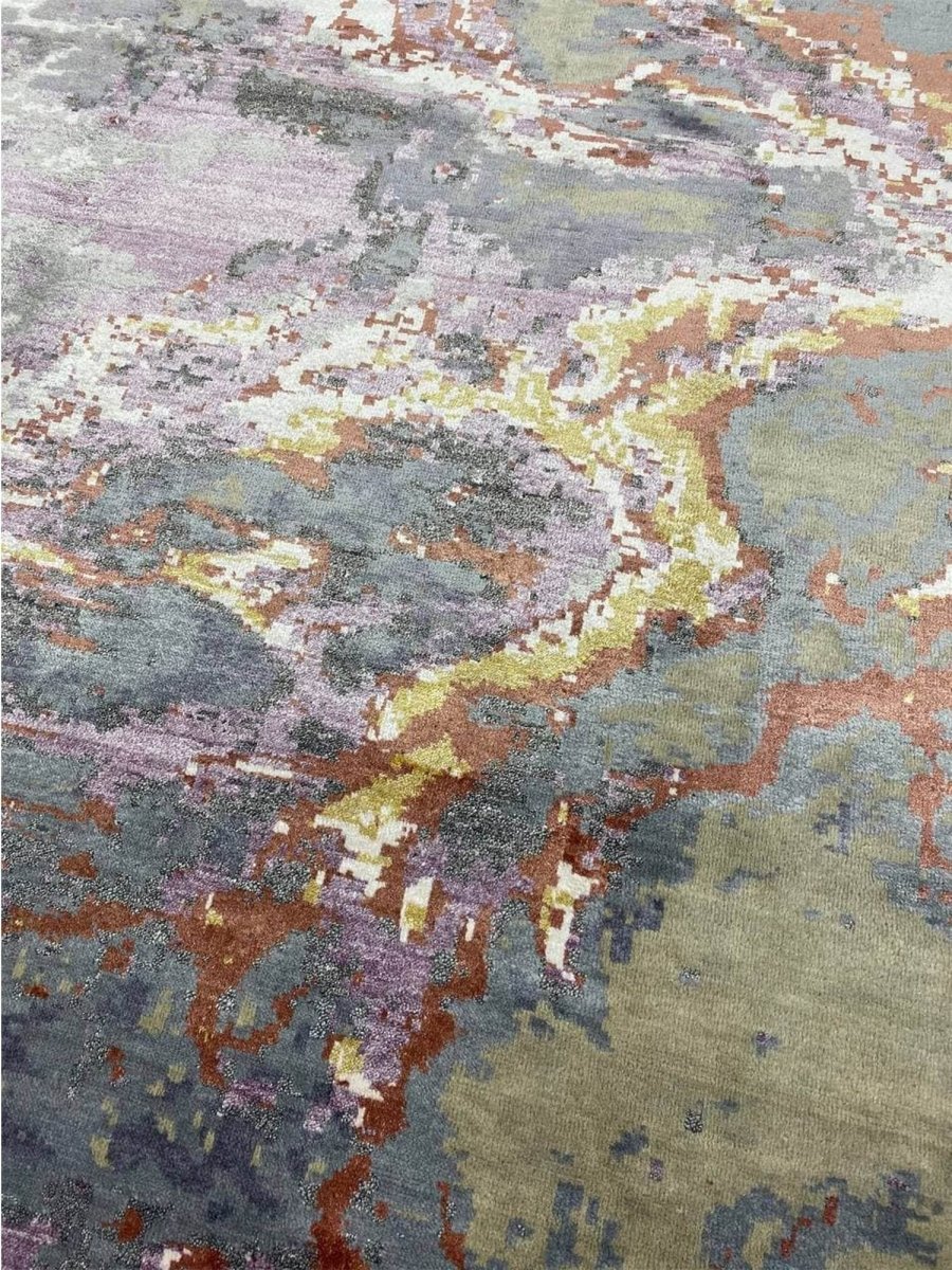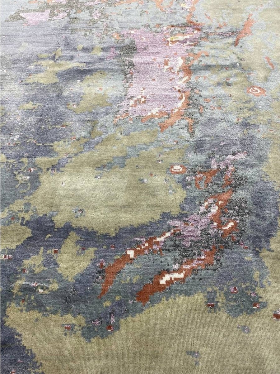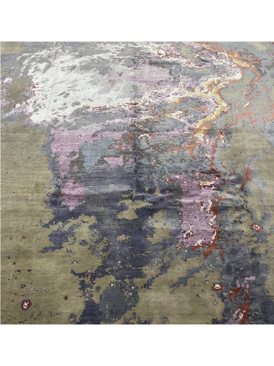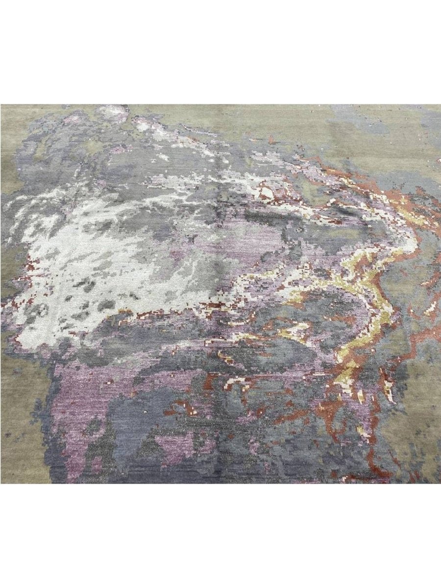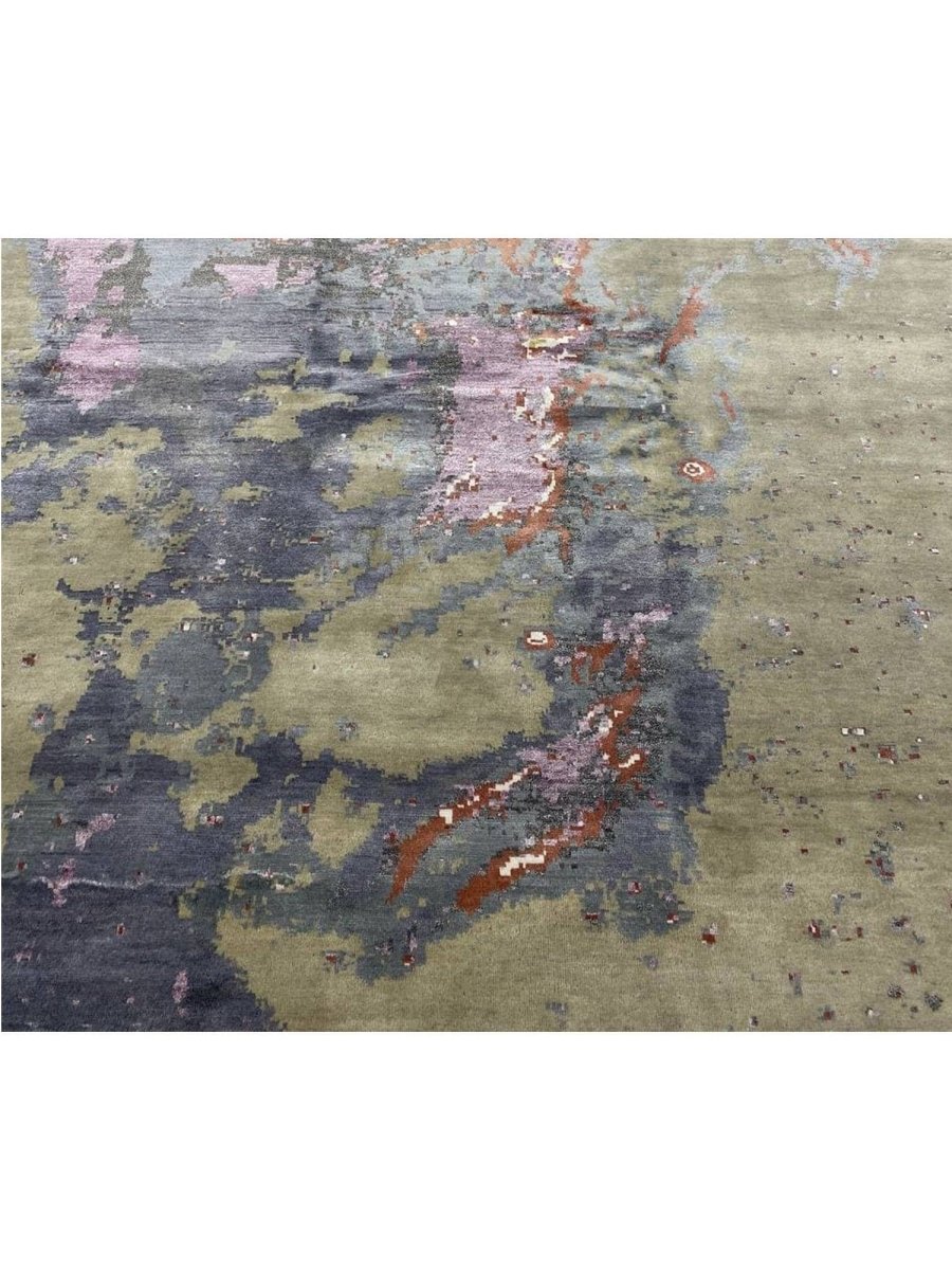 Bring modern sophistication to your home with this 9x12 modern abstract rug, hand-knotted in India. Crafted from a luxurious blend of wool and bamboo silk, this rug provides a soft, plush feel with a subtle sheen. The abstract pattern in refined gray, moss green, ivory, purple, gold, red, and charcoal tones offers a contemporary and versatile aesthetic, complementing a variety of decor styles. With an exact size of 9'1" x 12'1", this rug offers generous coverage that enhances open and well-proportioned interiors. Its high-quality craftsmanship ensures durability, resilience, and long-lasting beauty for everyday use. Designed to deliver a perfect balance of style and comfort, this rug adds visual interest and warmth while maintaining a refined presence. Enjoy free shipping within the U.S.