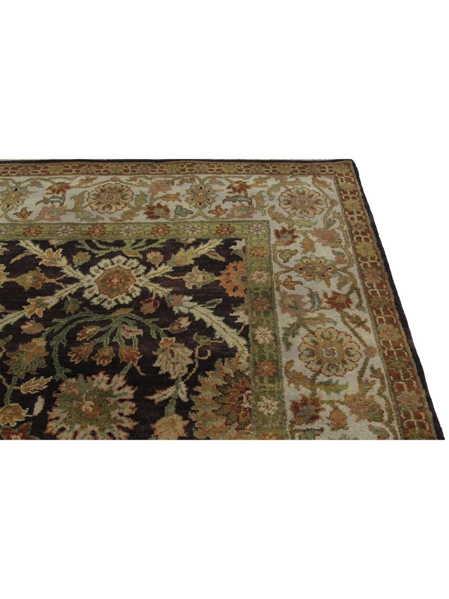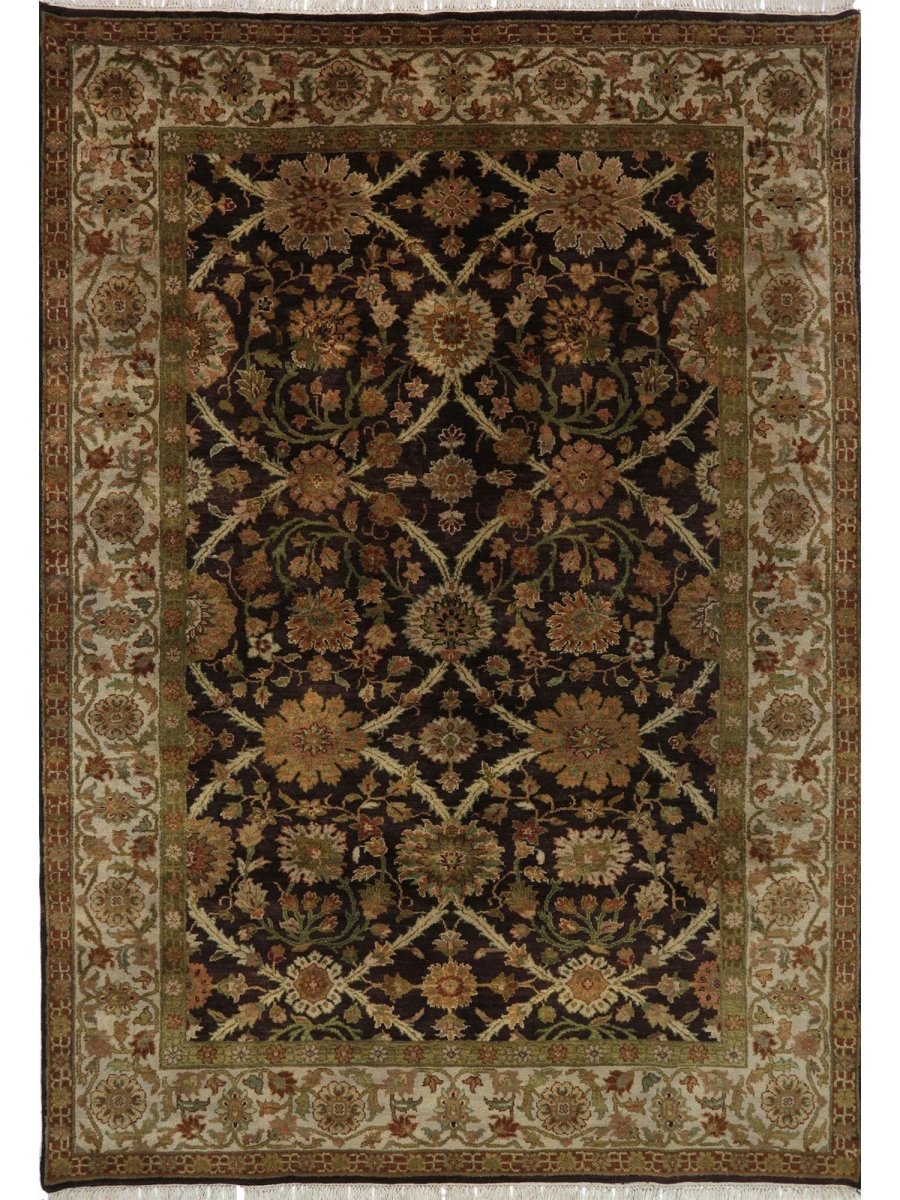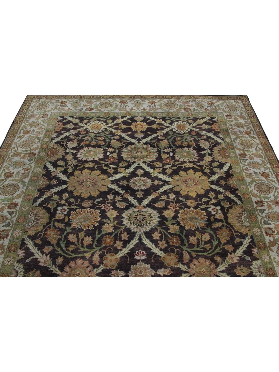 Adorn your living space with the timeless elegance of this hand-knotted 6x9 Indian Agra area rug, meticulously crafted in India. This rug showcases a captivating all-over floral pattern set against a deep, inviting field of dark brown and black. Intricate blossoms, intertwining vines, and delicate foliage in shades of olive green, gold, and subtle cream create a lush and detailed scene across the entire surface. A beautifully designed border with complementary floral motifs frames the central design, enhancing its sophisticated appeal. Crafted from high-quality wool, this rug provides a dense and durable pile, offering comforting warmth and resilient performance even in areas with regular foot traffic. This rug is an excellent choice for adding a refined focal point to a living room, bringing a rich and inviting foundation to a dining nook, and introducing elegant ambiance to a bedroom. Its intricate floral design and rich color palette make it a cherished piece, offering both enduring quality and a profound visual appeal to your home.
