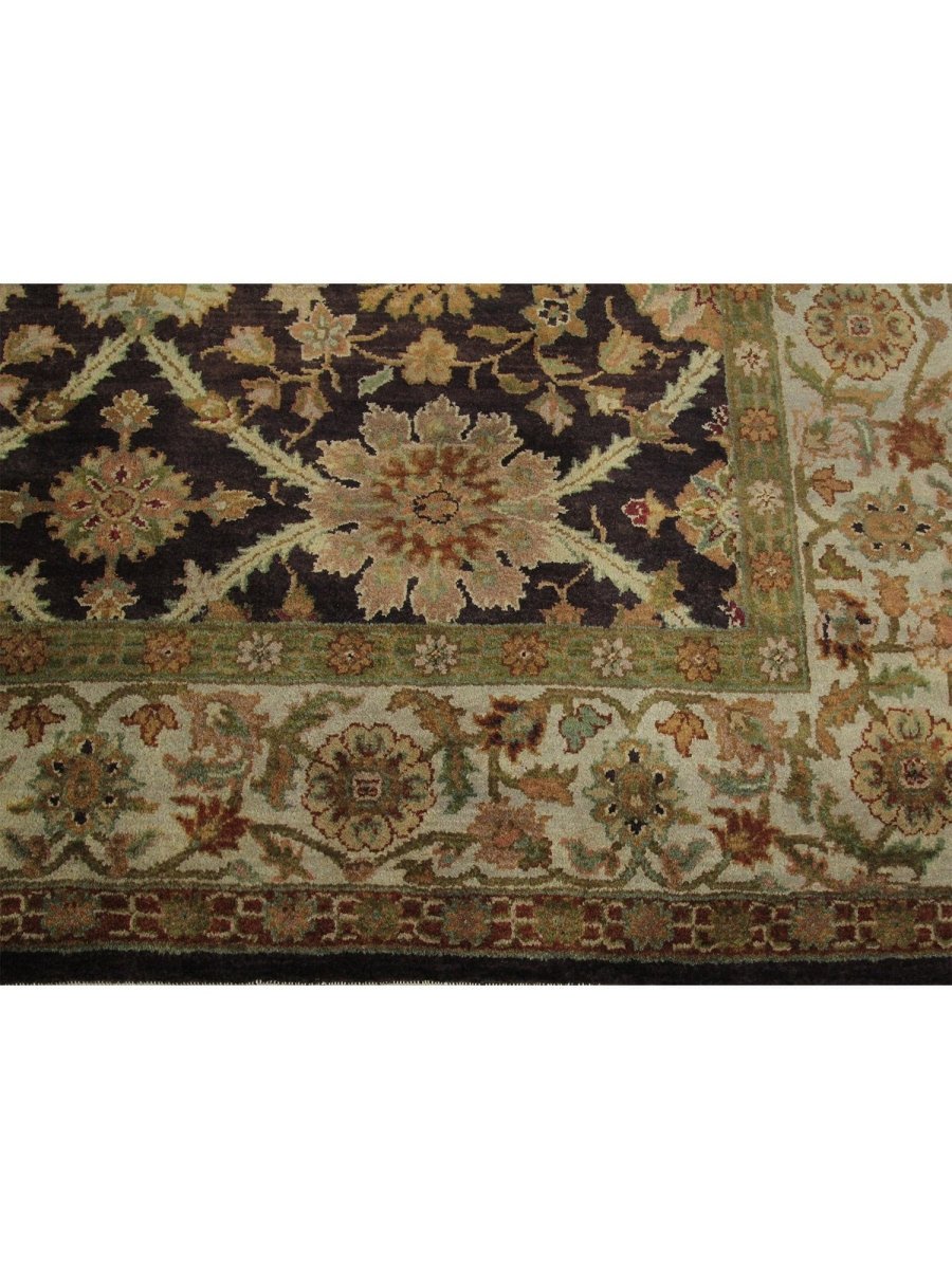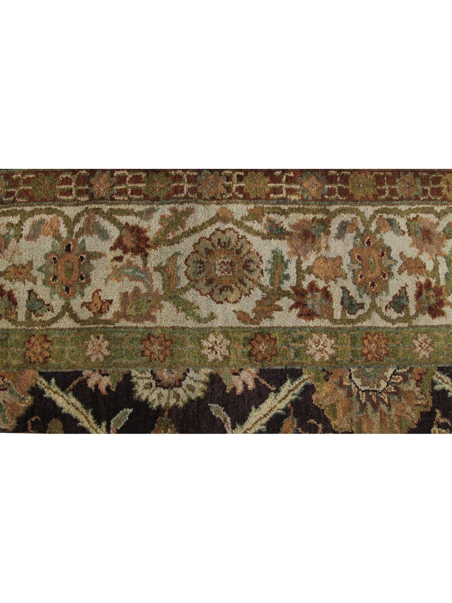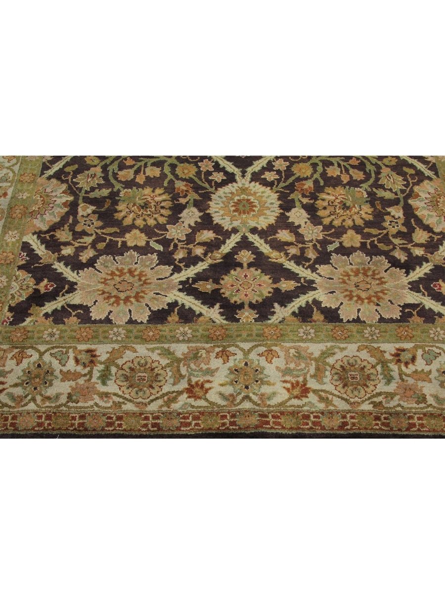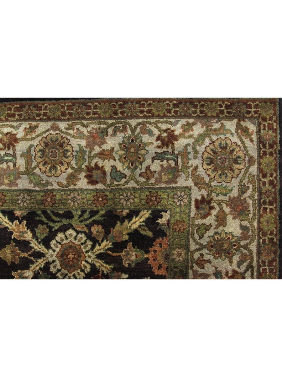 Adorn your living space with the timeless elegance of this hand-knotted 6x9 Indian Agra area rug, meticulously crafted in India. This rug showcases a captivating all-over floral pattern set against a deep, inviting field of dark brown and black. Intricate blossoms, intertwining vines, and delicate foliage in shades of olive green, gold, and subtle cream create a lush and detailed scene across the entire surface. A beautifully designed border with complementary floral motifs frames the central design, enhancing its sophisticated appeal. Crafted from high-quality wool, this rug provides a dense and durable pile, offering comforting warmth and resilient performance even in areas with regular foot traffic. This rug is an excellent choice for adding a refined focal point to a living room, bringing a rich and inviting foundation to a dining nook, and introducing elegant ambiance to a bedroom. Its intricate floral design and rich color palette make it a cherished piece, offering both enduring quality and a profound visual appeal to your home.