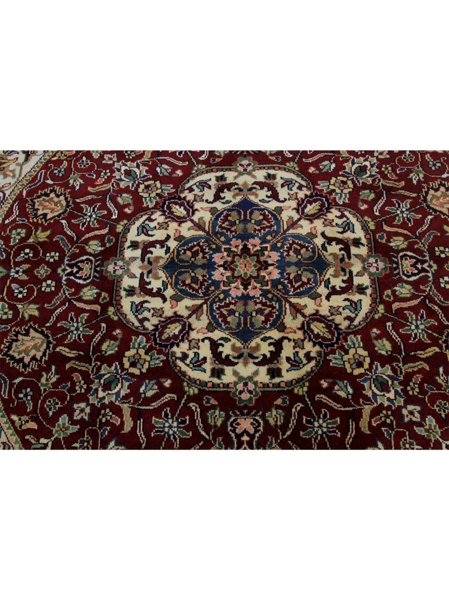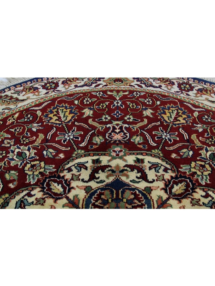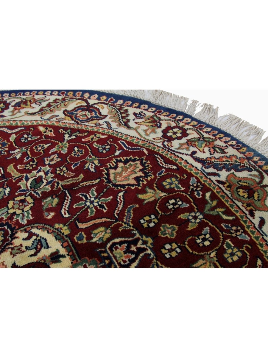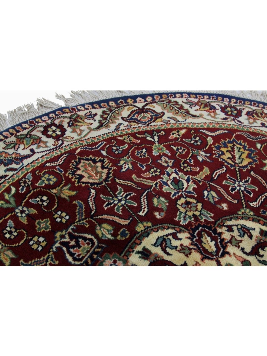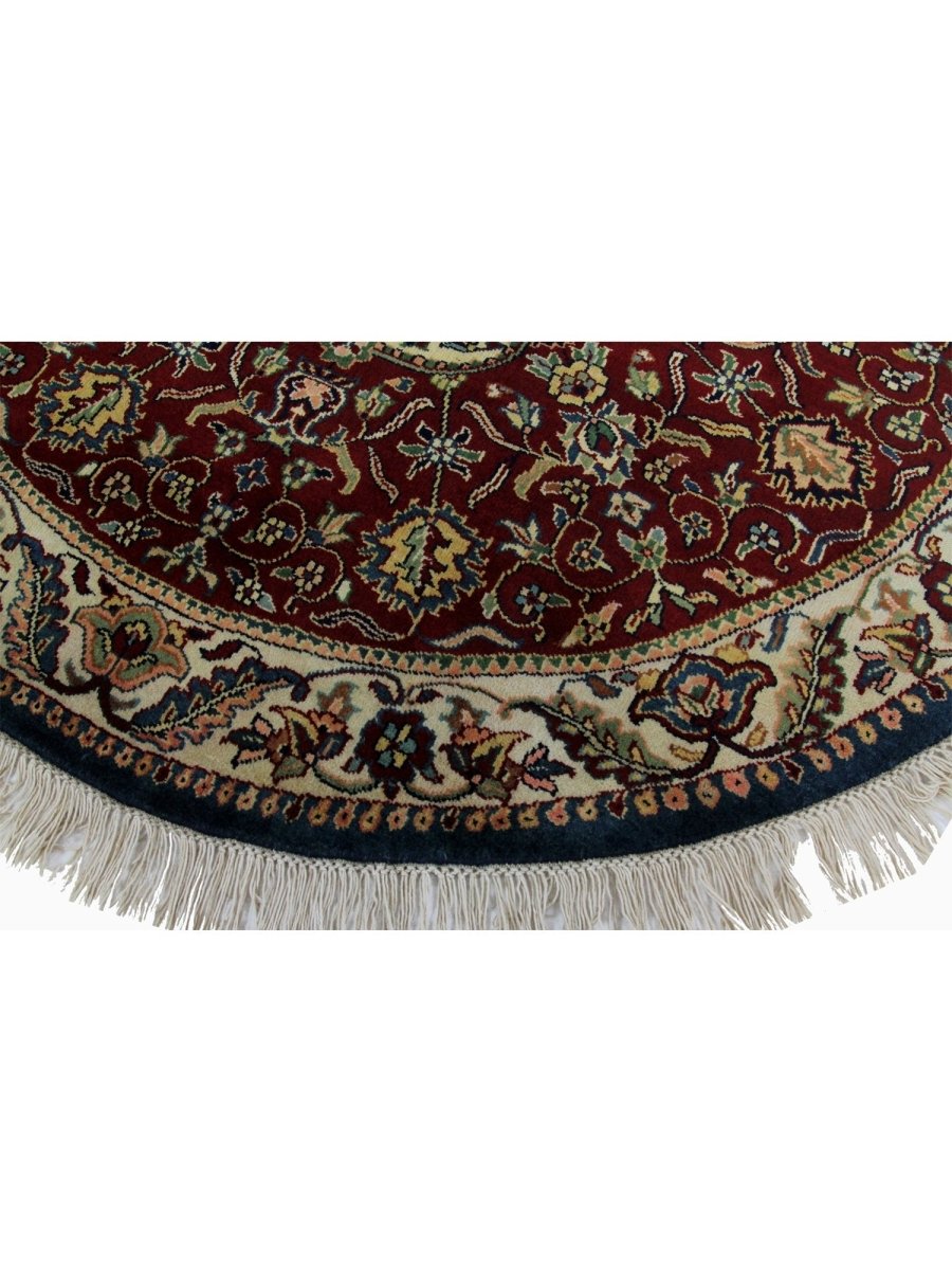 Experience luxury with this unique 4x4 round Indian Mughal area rug, reflecting traditional workmanship through its exquisite medallion pattern in rich burgundy, gentle beige, lush green, and stunning black. Hand-knotted from premium wool, this rug is ideal for enhancing your dining area, living room, or foyer. Its circular form and elaborate embellishments create a cozy and welcoming ambiance, making it a perfect choice for any home. More than just a floor covering, this new rug showcases the rich legacy of Indian creativity. Enjoy free delivery on this gorgeous item within the United States!