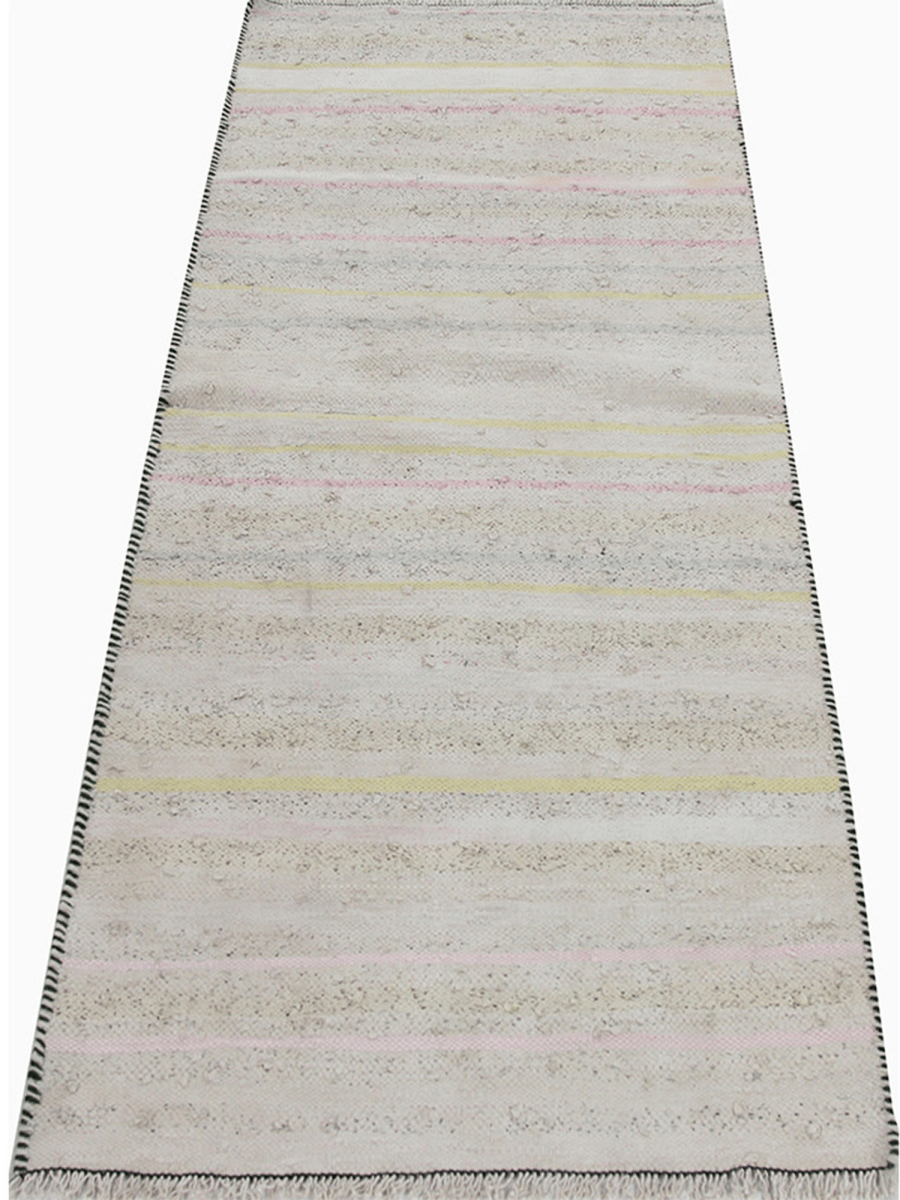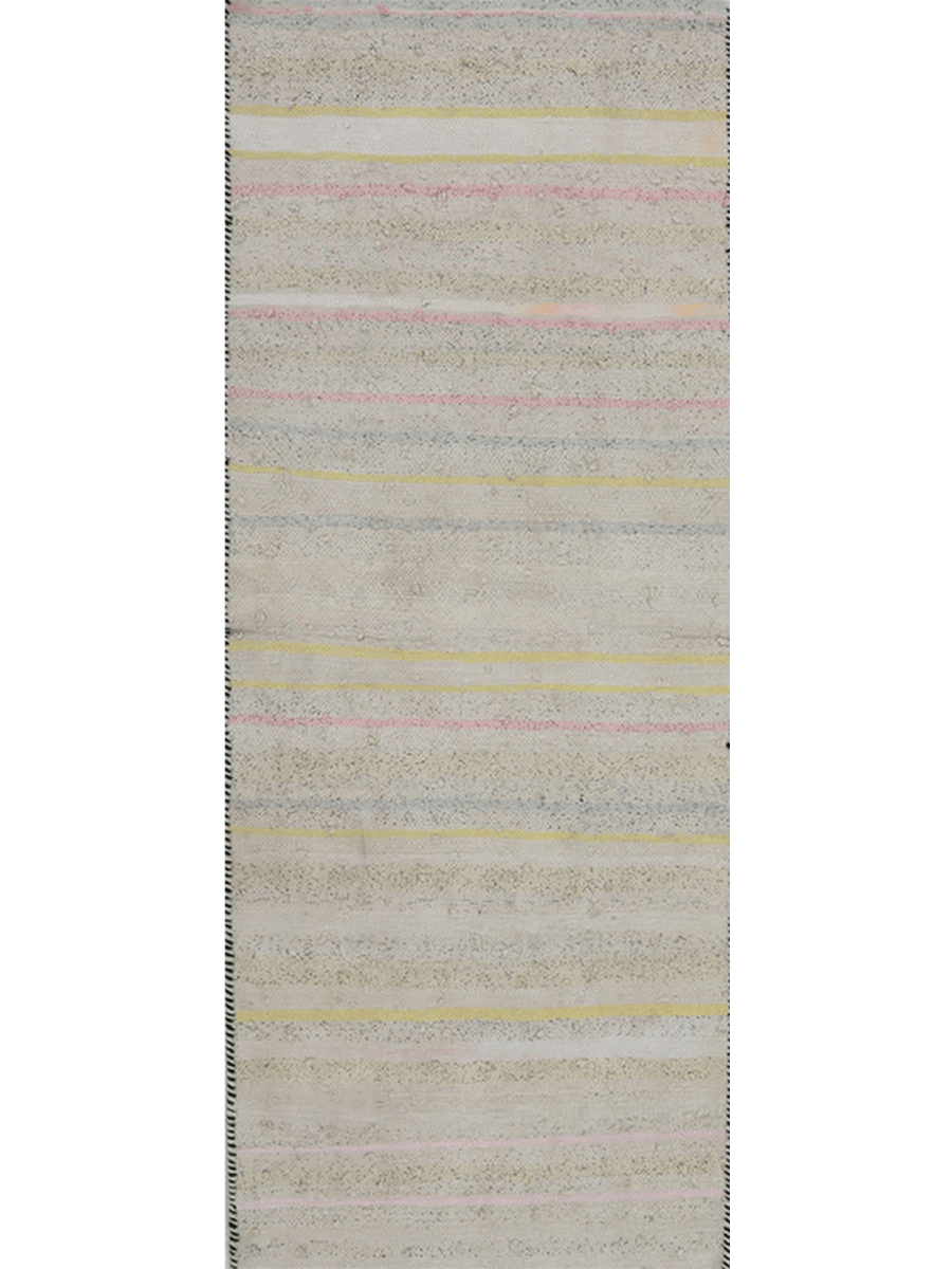 This 2x6 Persian Kilim runner rug features a soft, neutral-toned base with delicate horizontal stripes in pastel yellow, pink, and light blue hues. The subtle color variations create an airy and elegant aesthetic, making it an excellent choice for various interior styles. Handwoven from high-quality wool, this flat-weave rug offers durability while maintaining a lightweight and flexible structure blending effortlessly into various decor styles. The intricate craftsmanship ensures a timeless appeal, making it a versatile addition to any home.