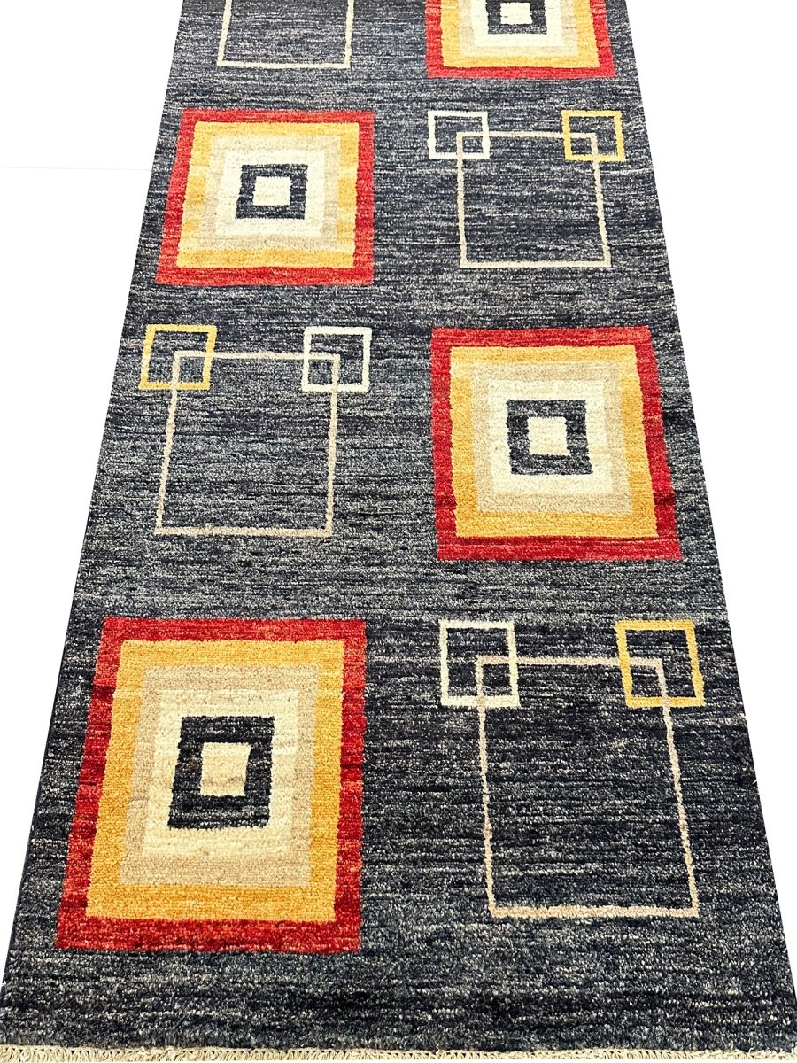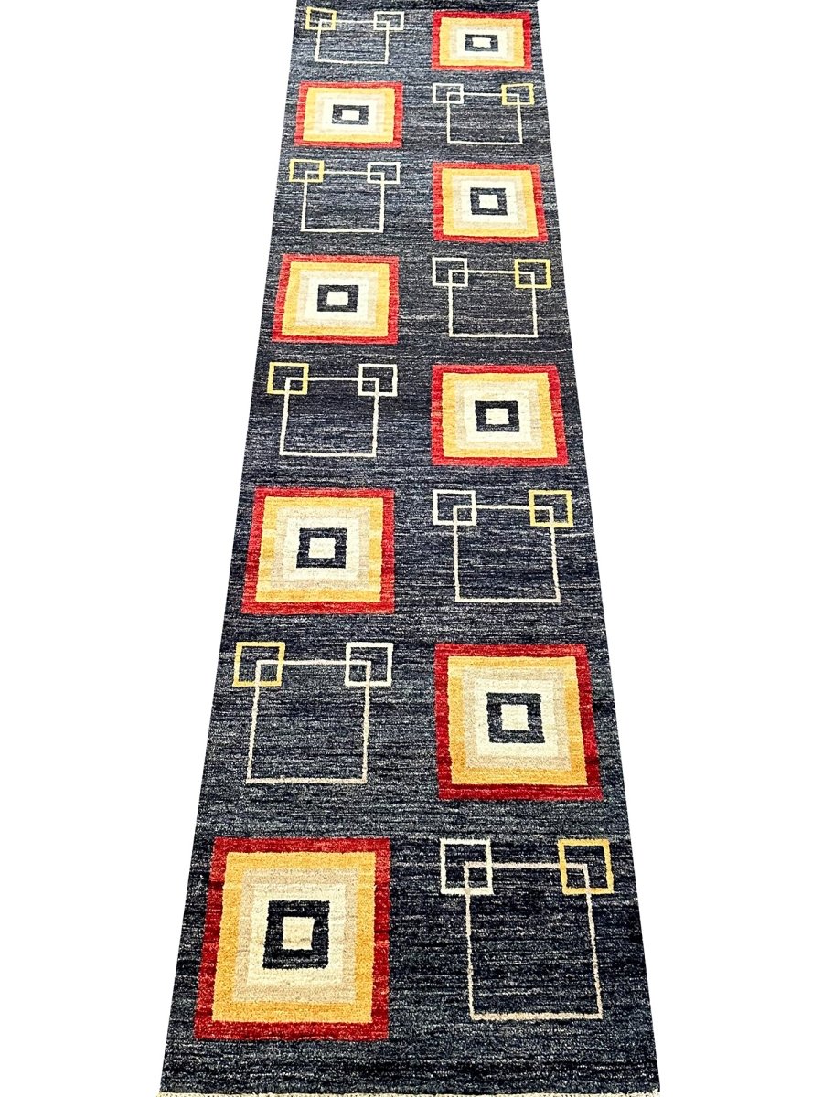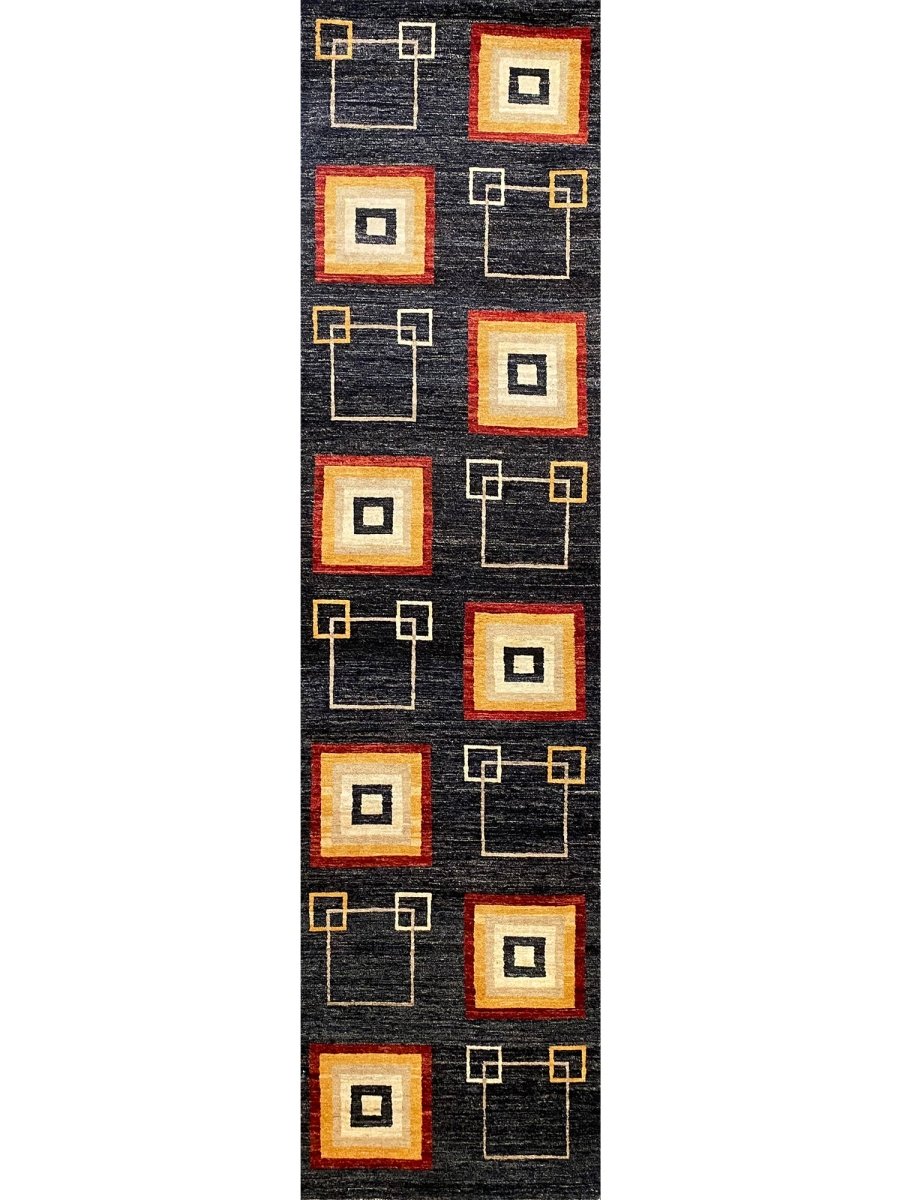 Add a touch of modern elegance to your home with this 3x10 Black and Gold Modern Runner Rug, expertly crafted in Pakistan. This stunning rug features a striking black and gold geometric pattern that adds a pop of color and texture to any room. The durable wool construction ensures longevity and easy care, making it ideal for high-traffic areas such as hallways, next to beds, and kitchen runners. The hand-knotted design reflects the skill and craftsmanship of Pakistani artisans, adding a unique and personal touch to your home decor. Whether you're looking to add a statement piece to your living room or a touch of warmth to your hallway, this modern runner rug is the perfect choice.