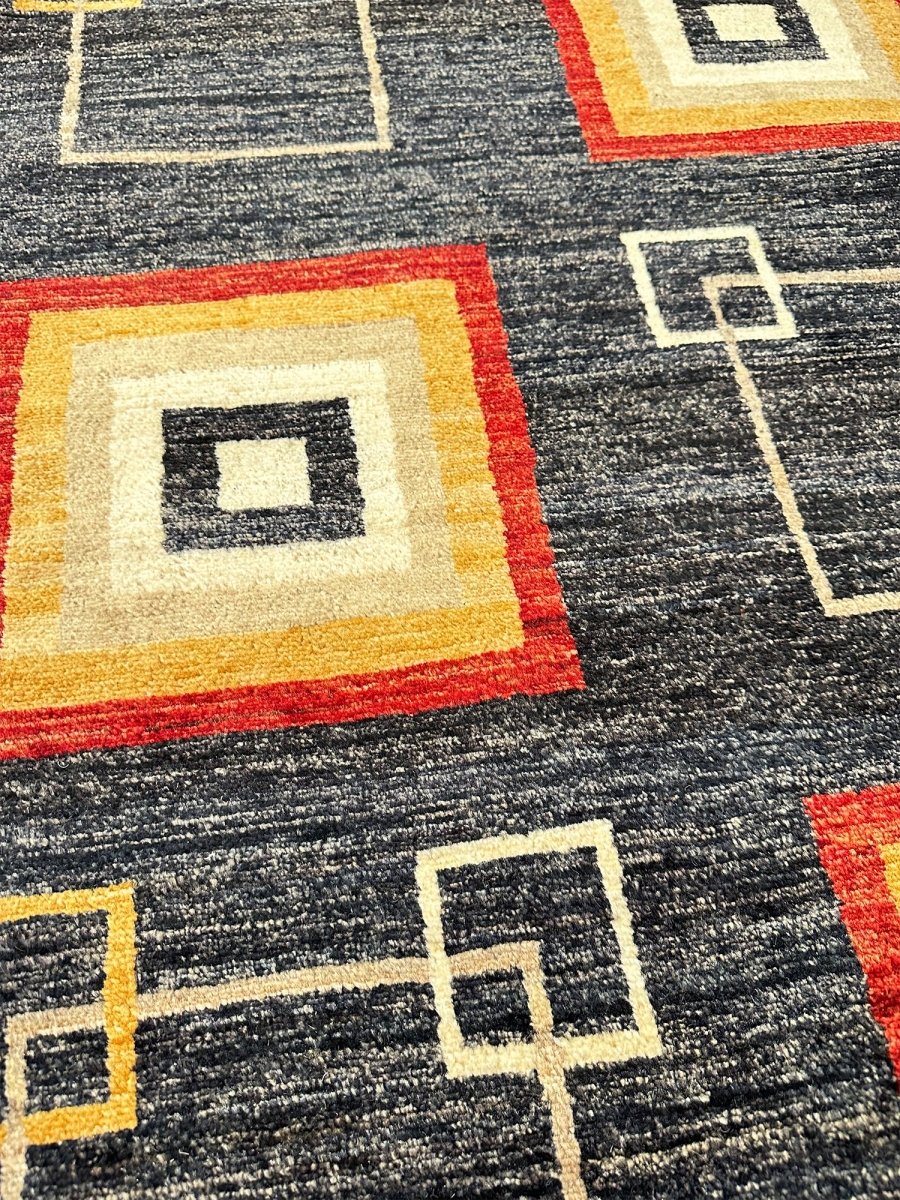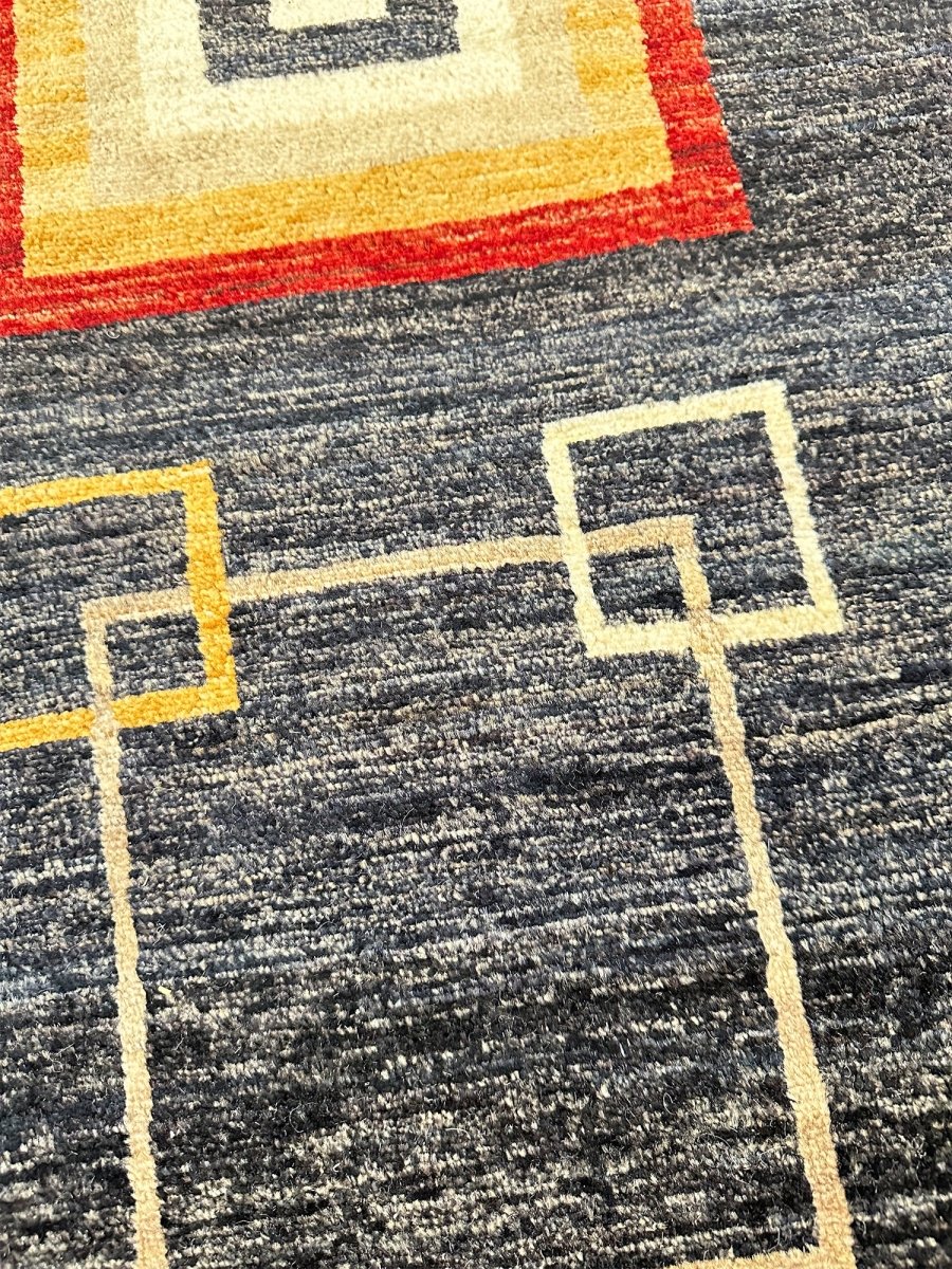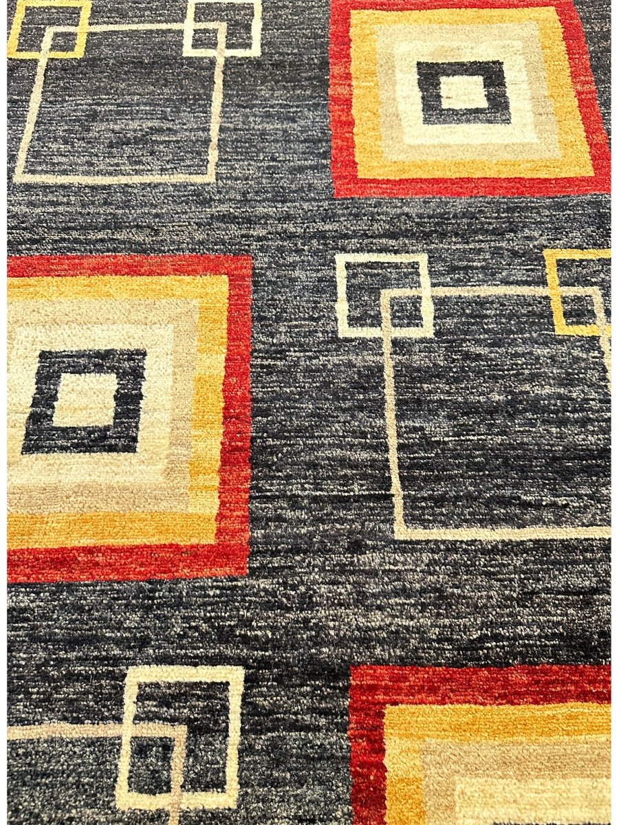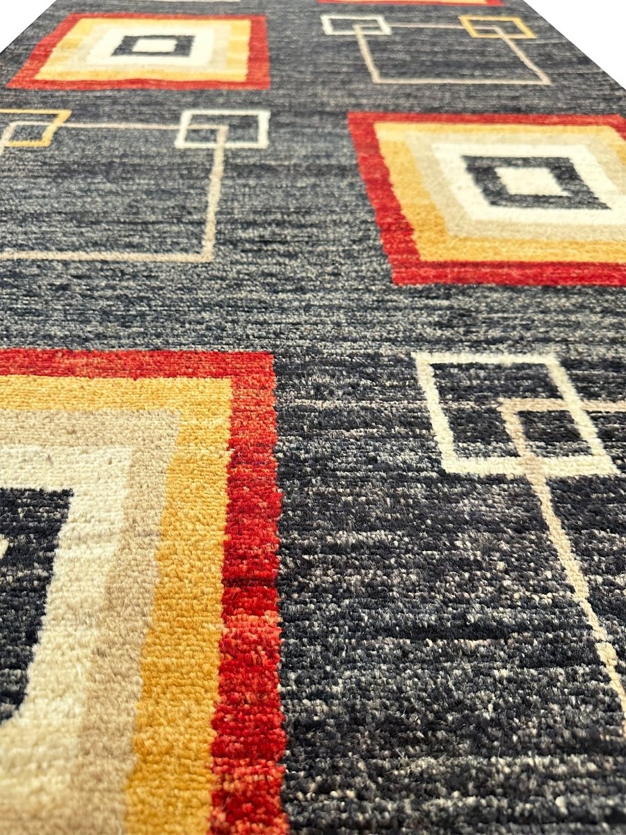 Add a touch of modern elegance to your home with this 3x10 Black and Gold Modern Runner Rug, expertly crafted in Pakistan. This stunning rug features a striking black and gold geometric pattern that adds a pop of color and texture to any room. The durable wool construction ensures longevity and easy care, making it ideal for high-traffic areas such as hallways, next to beds, and kitchen runners. The hand-knotted design reflects the skill and craftsmanship of Pakistani artisans, adding a unique and personal touch to your home decor. Whether you're looking to add a statement piece to your living room or a touch of warmth to your hallway, this modern runner rug is the perfect choice.