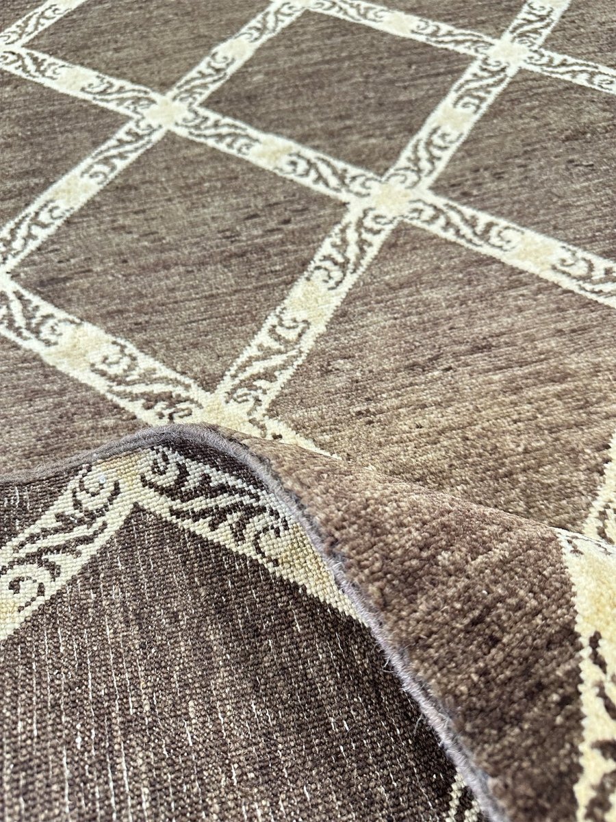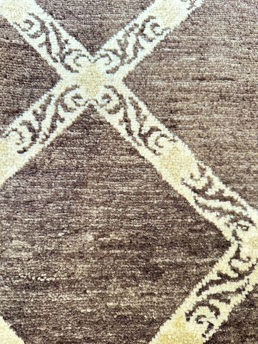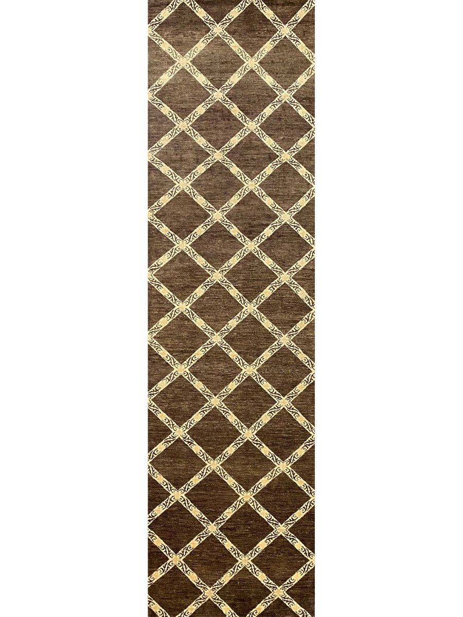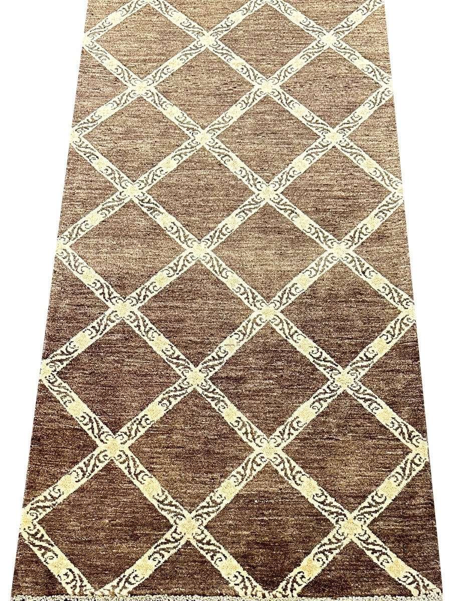 Add a touch of modern elegance to your home with this 3x10 Brown Modern Runner Rug, expertly crafted in Pakistan. This stunning rug features a striking brown and tan geometric pattern that adds a pop of color and texture to any room. The durable wool construction ensures longevity and easy care, making it ideal for high-traffic areas such as hallways, next to beds, and kitchen runners. The hand-knotted design reflects the skill and craftsmanship of Pakistani artisans, adding a unique and personal touch to your home decor. Whether you're looking to add a statement piece to your living room or a touch of warmth to your hallway, this modern runner rug is the perfect choice.