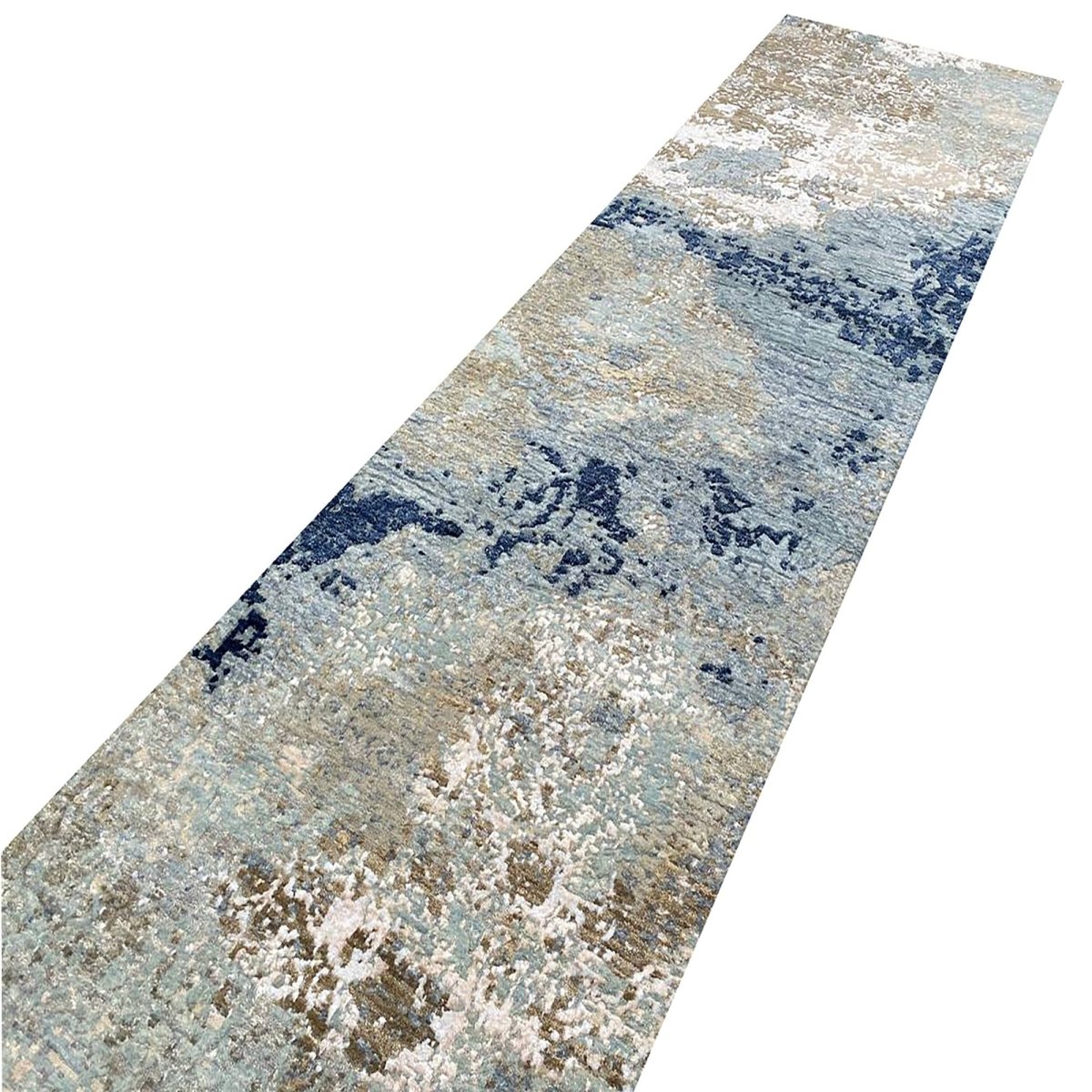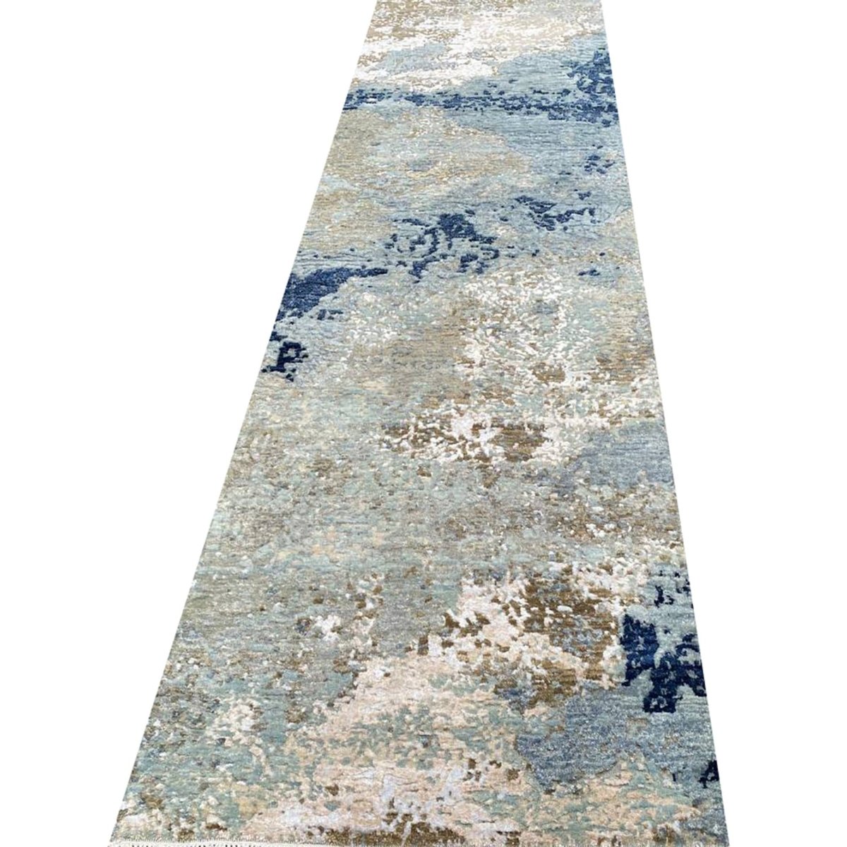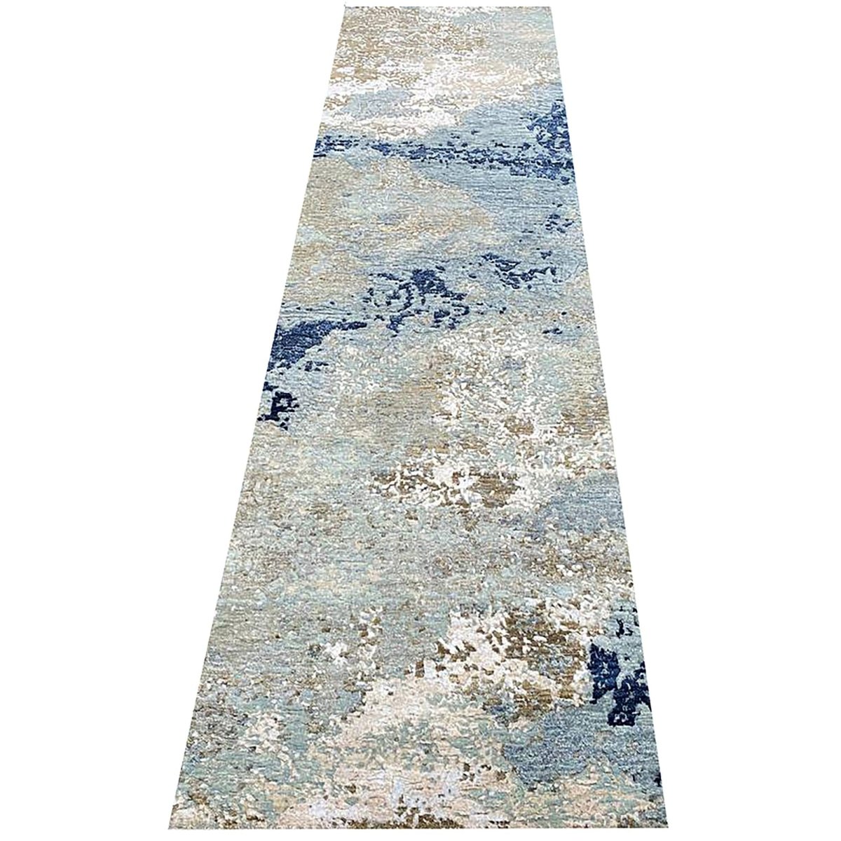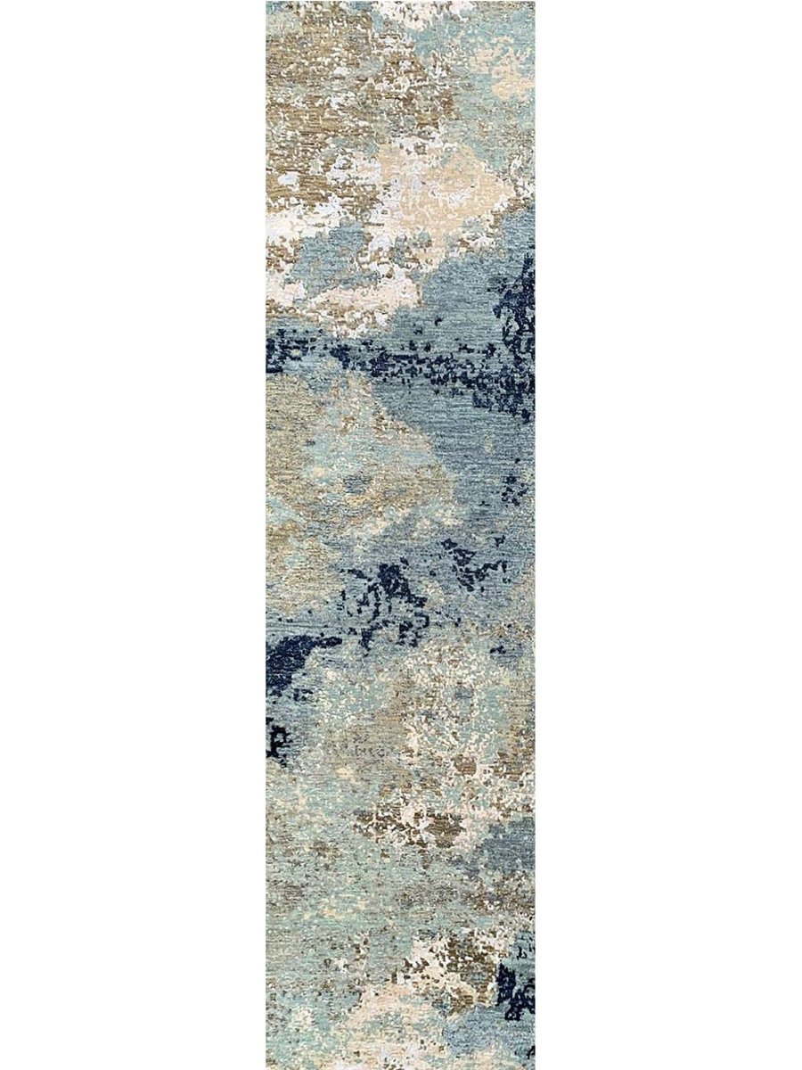 Experience the elegance of the 3x10 Modern Abstract Runner Rug, a distinctive piece that adds timeless sophistication to your home. Hand-knotted from high-quality wool, this exquisite rug features an abstract pattern on a grayish-blue field, bringing visual interest and charm to any interior. The harmonious blend of brown, warm beige, ivory, and navy tones makes it a versatile choice for a variety of decor styles. This exceptional piece enhances any space while also serving as a striking work of art. Enjoy free shipping within the U.S.