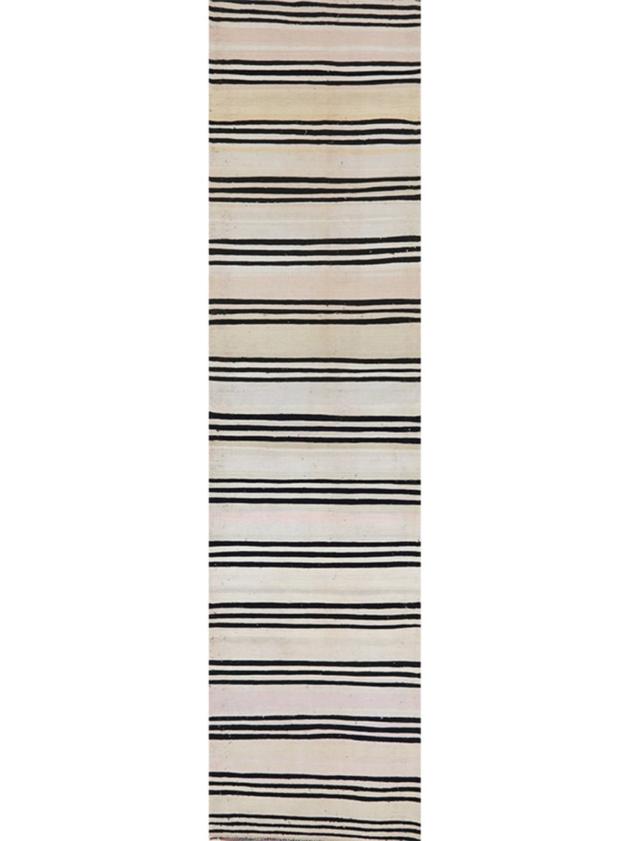This 3x13 Persian Kilim runner rug features a soft ivory base with refined stripes in black, beige, and gray. The neutral color palette creates a harmonious and elegant aesthetic. Handwoven from fine Persian wool, this flatweave rug offers durability and easy maintenance while showcasing classic craftsmanship. The understated yet classic striped design enhances both classic and rustic interiors, adding warmth and texture to any room.