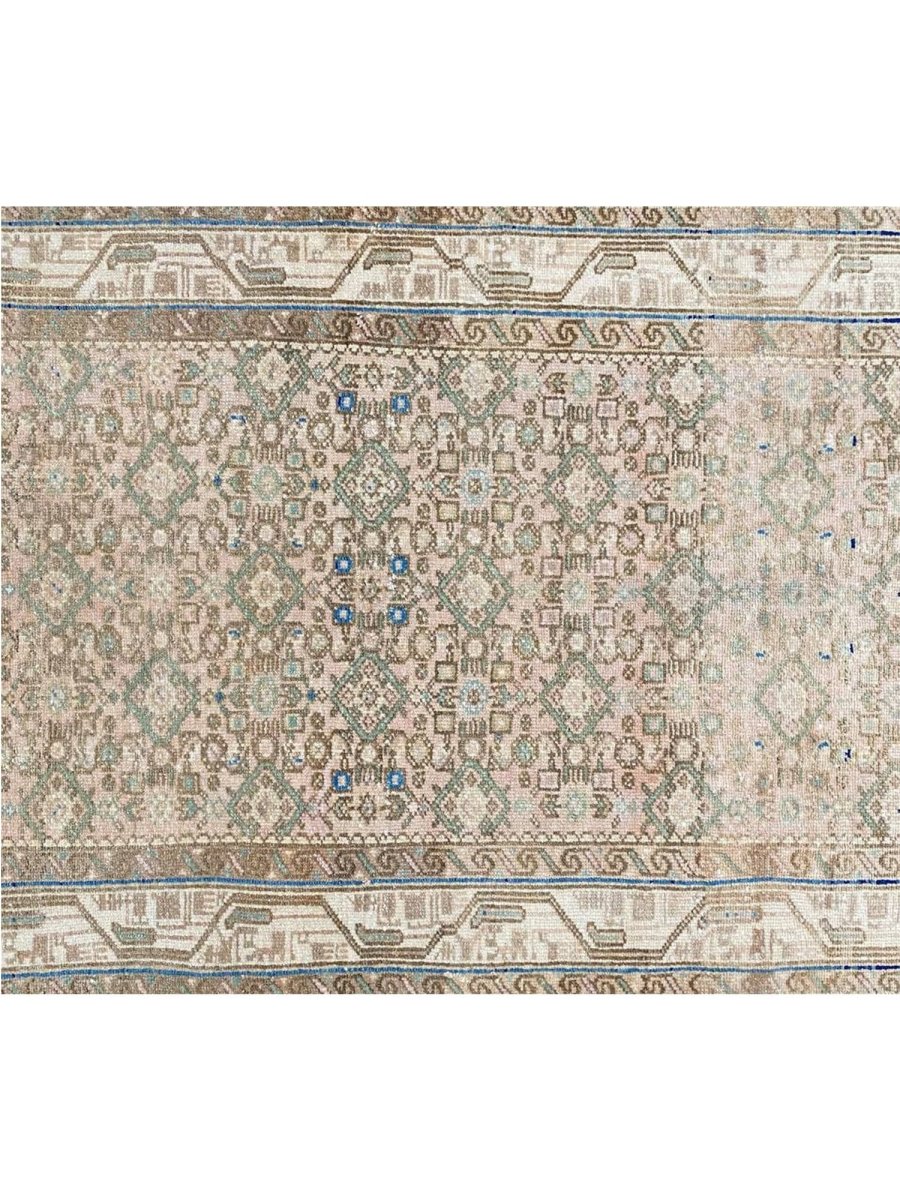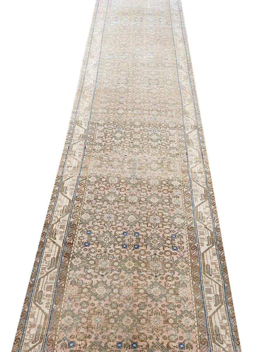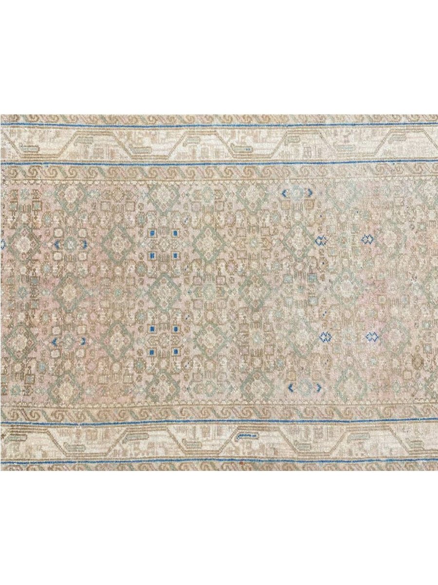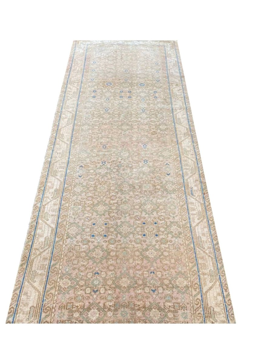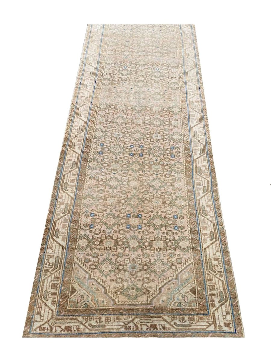 Enhance your hallway with the understated beauty of this 3x13 Old Persian Hamedan Runner Rug. This elegant runner features a delicate all-over geometric pattern, a testament to the intricate weaving traditions of Persia. The soft, light beige and brown tones form the primary palette, subtly accented by hints of muted light blue within the geometric motifs, creating a calming and refined appearance. Handwoven in Persia from premium wool, this rug offers a soft texture and lasting quality. Its narrow and long shape is ideal for corridors, entryways, or adding a layer of traditional sophistication alongside furniture, bringing authentic Persian artistry to your home.
