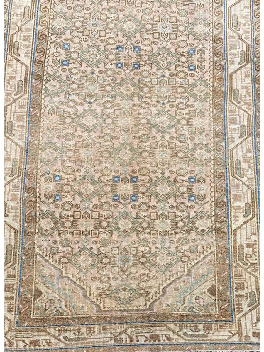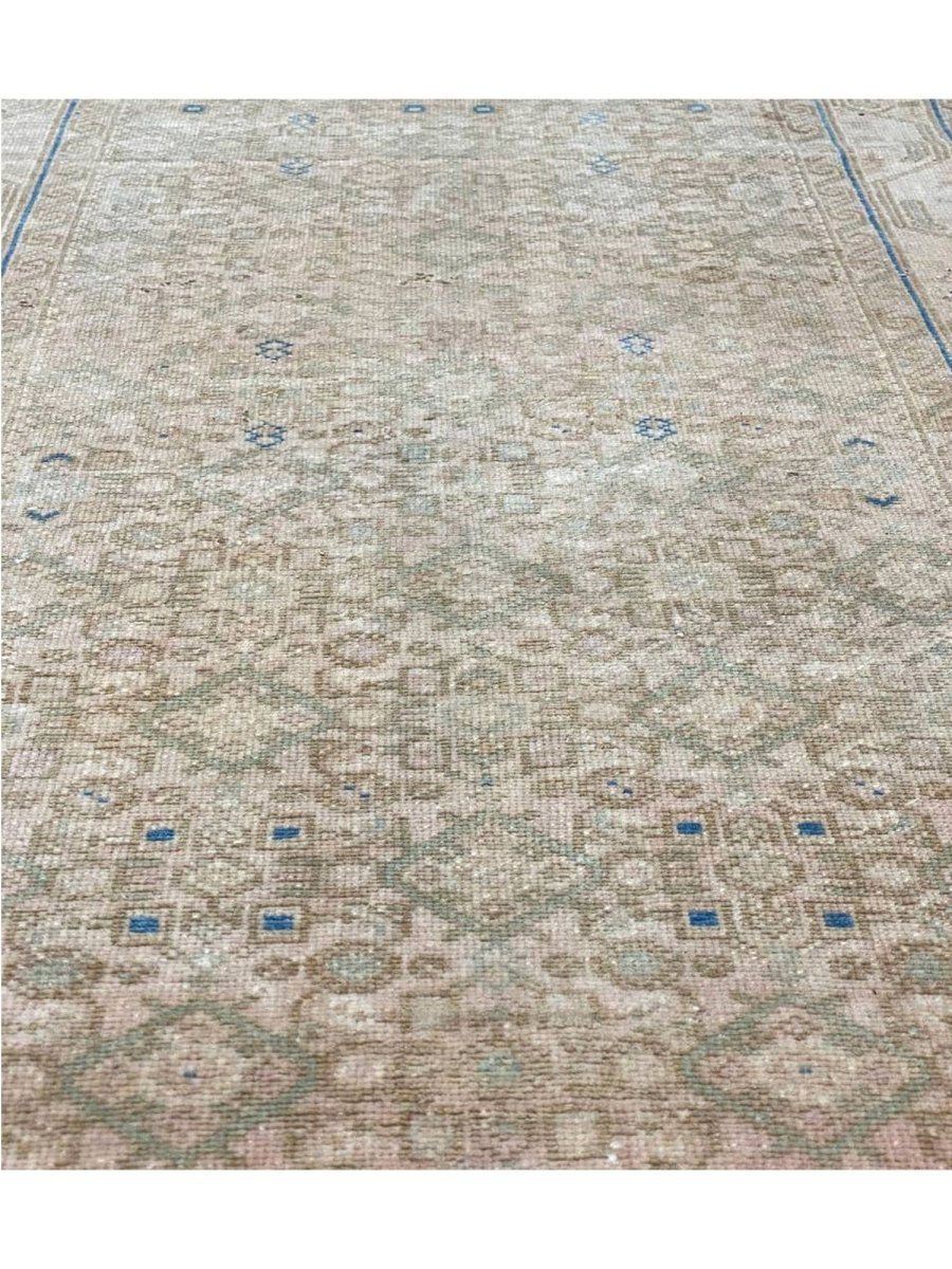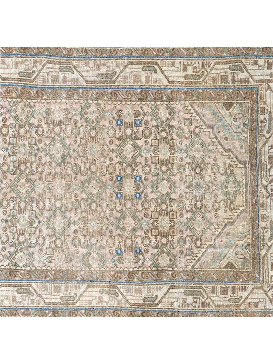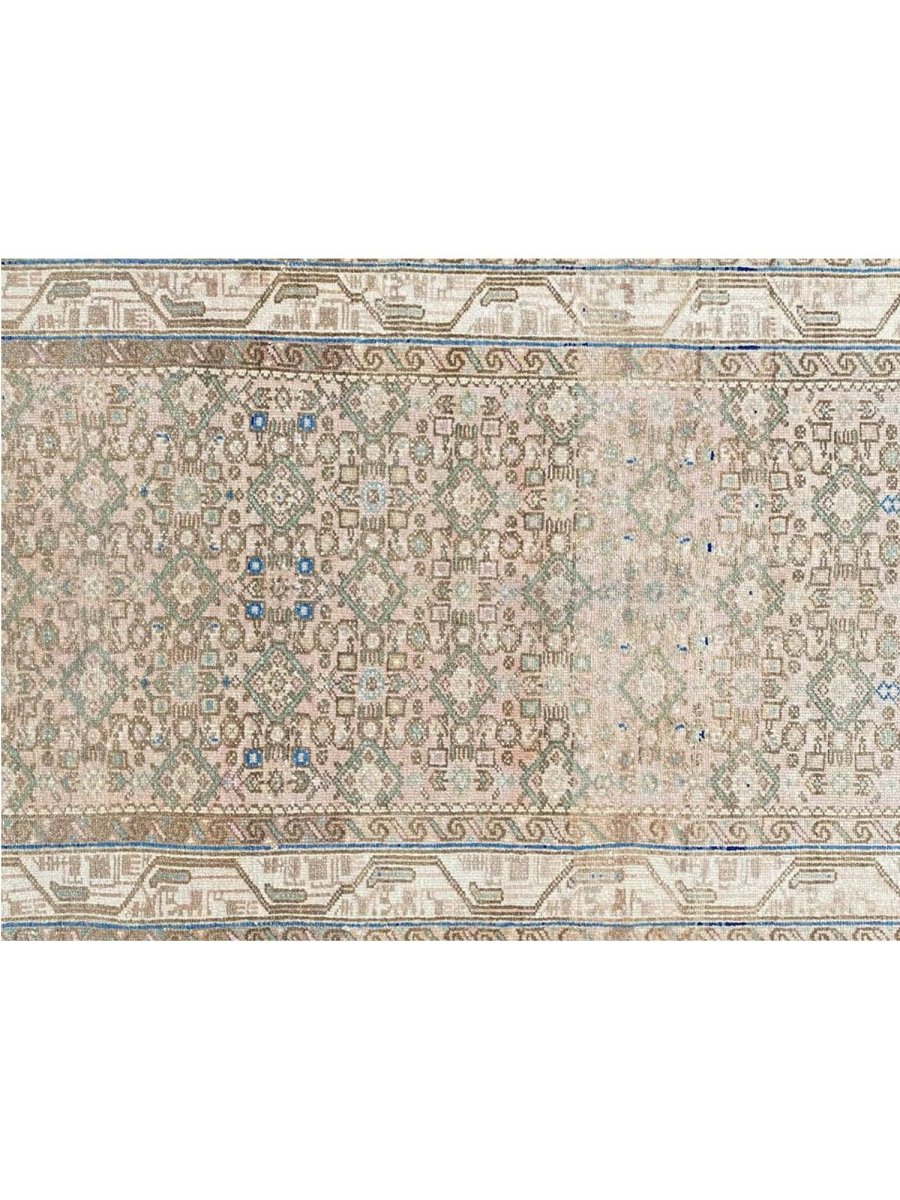 Enhance your hallway with the understated beauty of this 3x13 Old Persian Hamedan Runner Rug. This elegant runner features a delicate all-over geometric pattern, a testament to the intricate weaving traditions of Persia. The soft, light beige and brown tones form the primary palette, subtly accented by hints of muted light blue within the geometric motifs, creating a calming and refined appearance. Handwoven in Persia from premium wool, this rug offers a soft texture and lasting quality. Its narrow and long shape is ideal for corridors, entryways, or adding a layer of traditional sophistication alongside furniture, bringing authentic Persian artistry to your home.