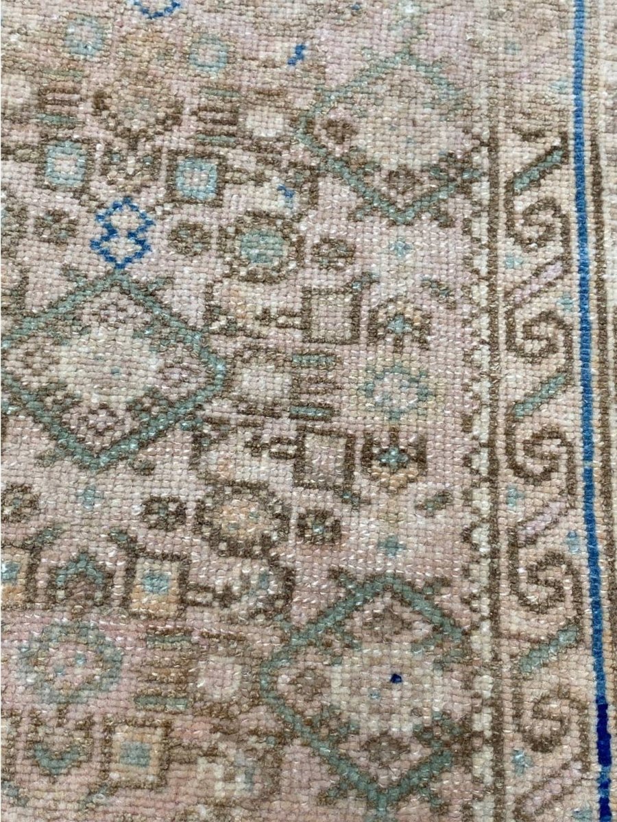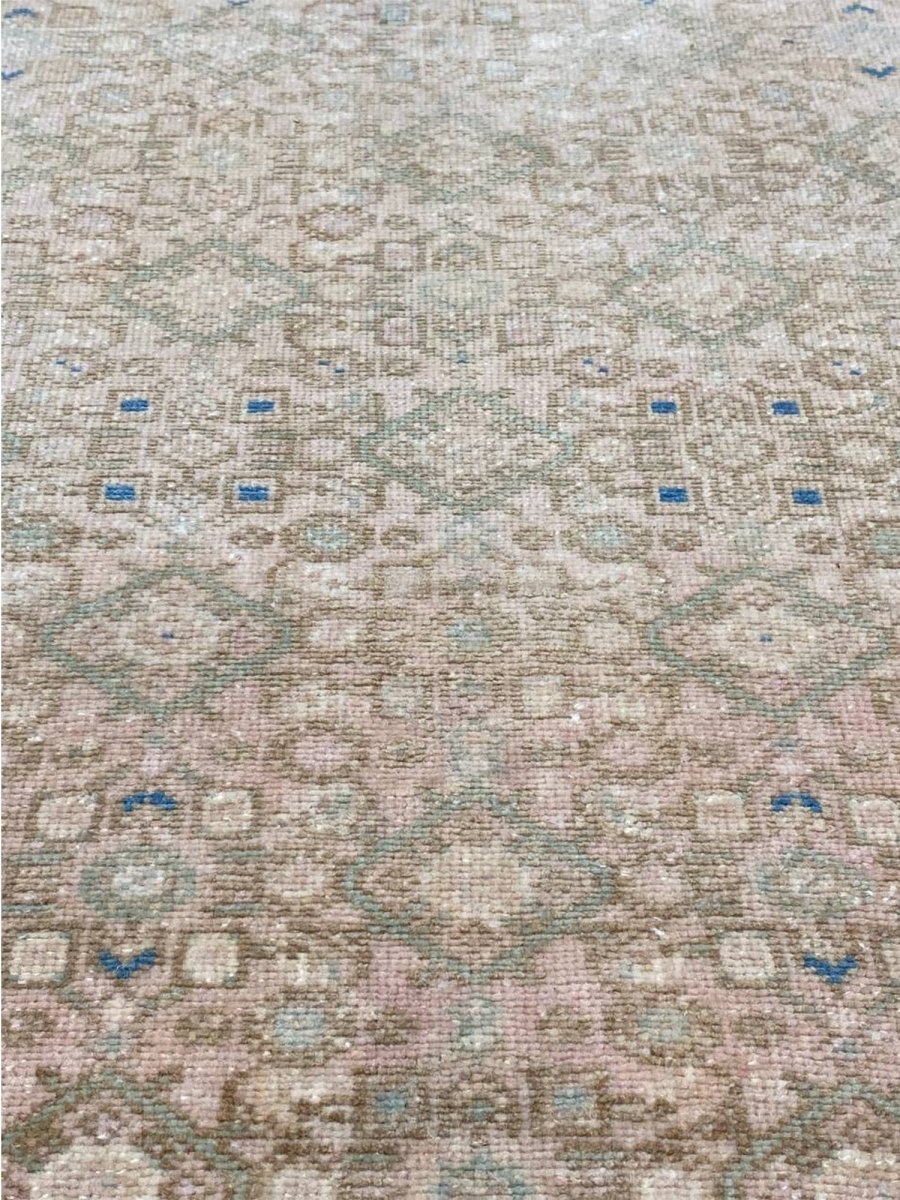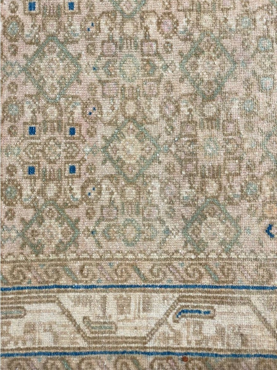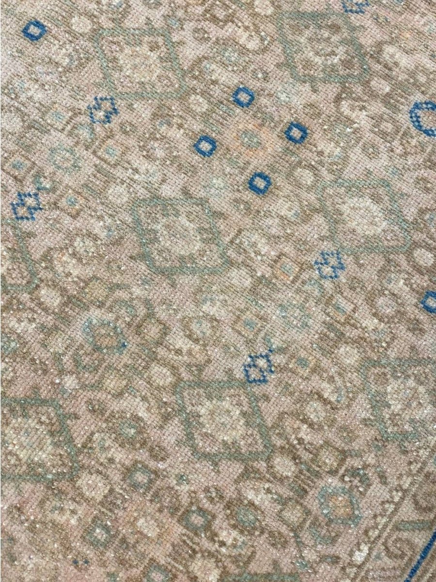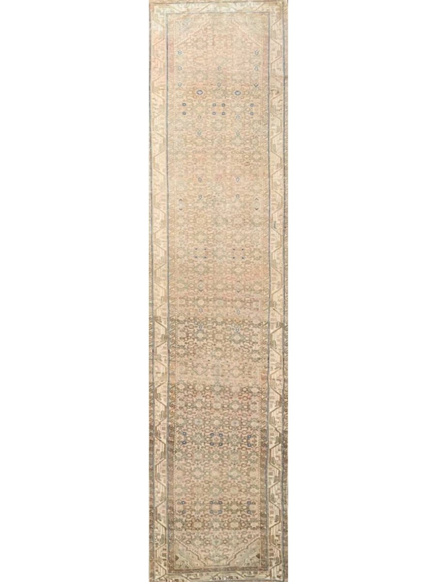 Enhance your hallway with the understated beauty of this 3x13 Old Persian Hamedan Runner Rug. This elegant runner features a delicate all-over geometric pattern, a testament to the intricate weaving traditions of Persia. The soft, light beige and brown tones form the primary palette, subtly accented by hints of muted light blue within the geometric motifs, creating a calming and refined appearance. Handwoven in Persia from premium wool, this rug offers a soft texture and lasting quality. Its narrow and long shape is ideal for corridors, entryways, or adding a layer of traditional sophistication alongside furniture, bringing authentic Persian artistry to your home.