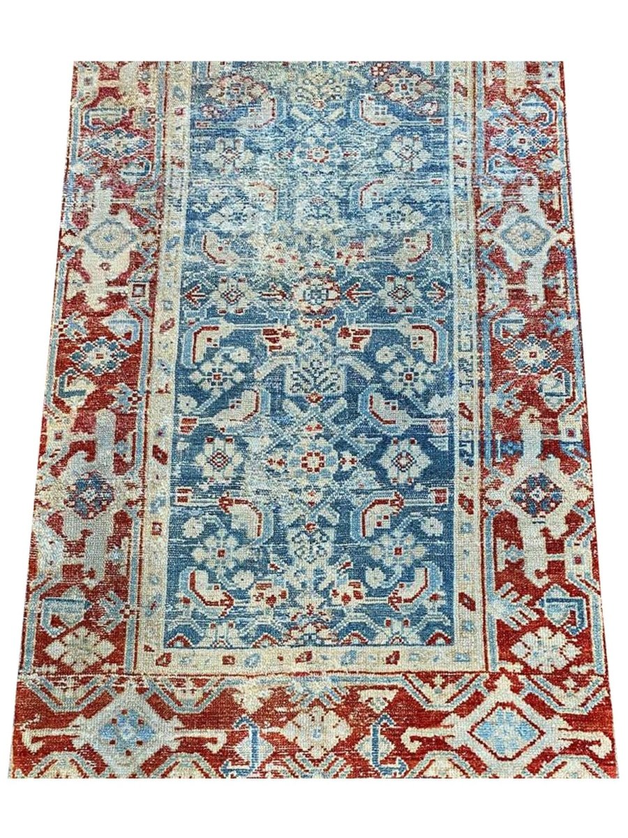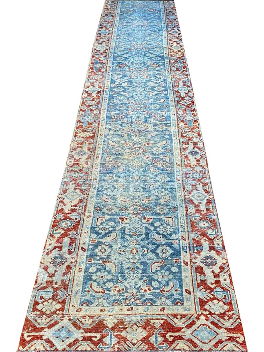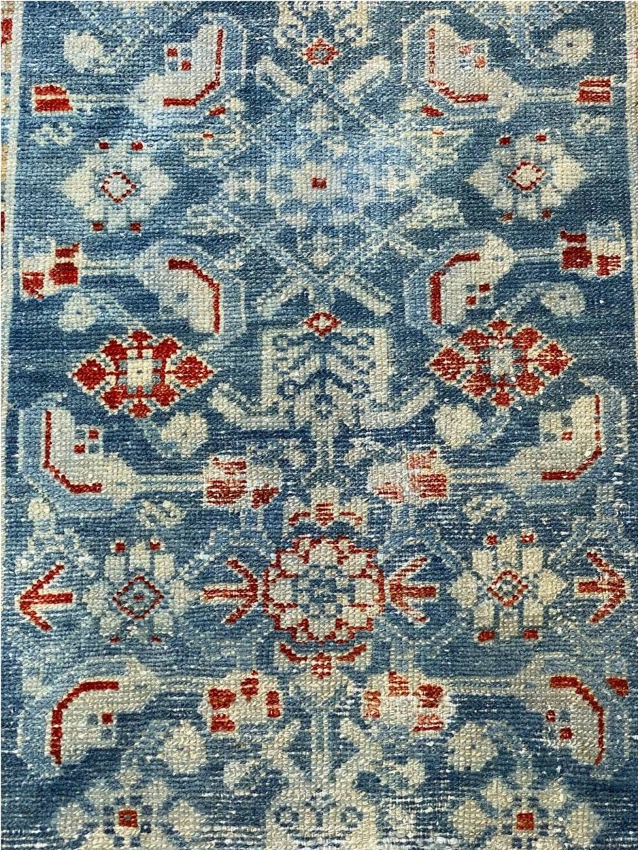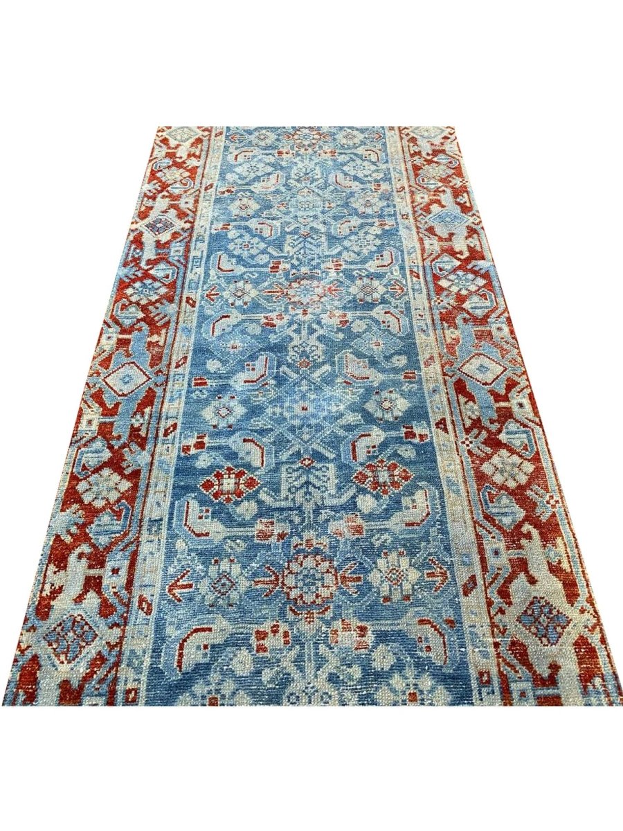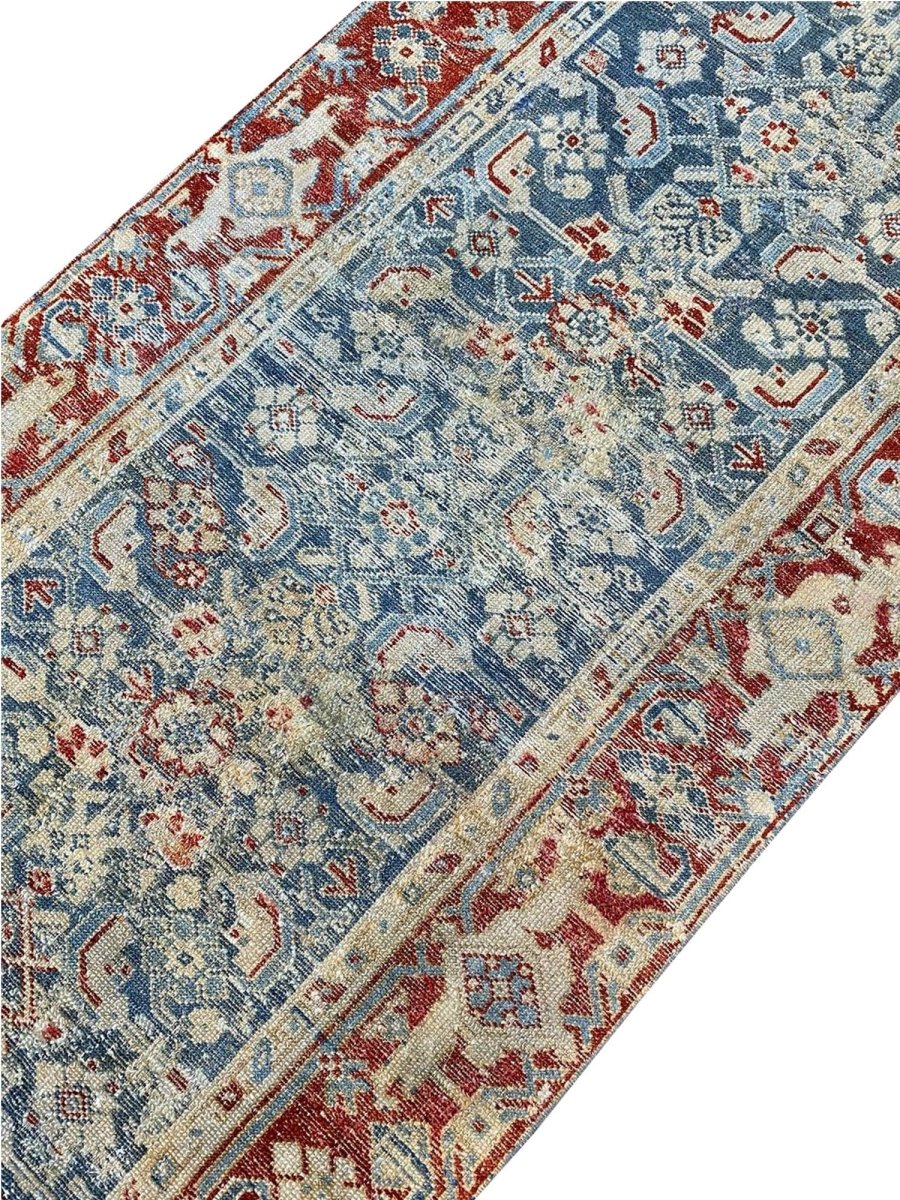 Add a touch of history to your home with this 3x16 Antique Persian Malayer Runner. This runner features a geometric pattern with intricate floral and diamond motifs, reflecting the timeless artistry of Persian design. The deep blue background is complemented by natural tones of rust, beige, and hints of ivory, creating a rich and elegant look. A detailed border with repeating motifs enhances its classic appeal. This rug is handmade in Persia with premium wool and offers durability and a luxurious texture. Ideal for hallways, entryways, or alongside furniture, it brings authentic Persian heritage to your space.