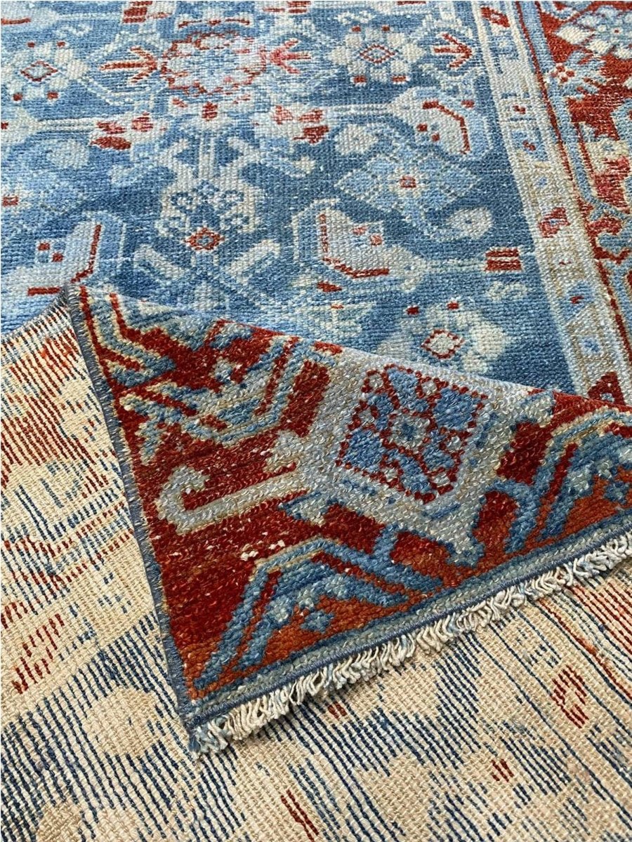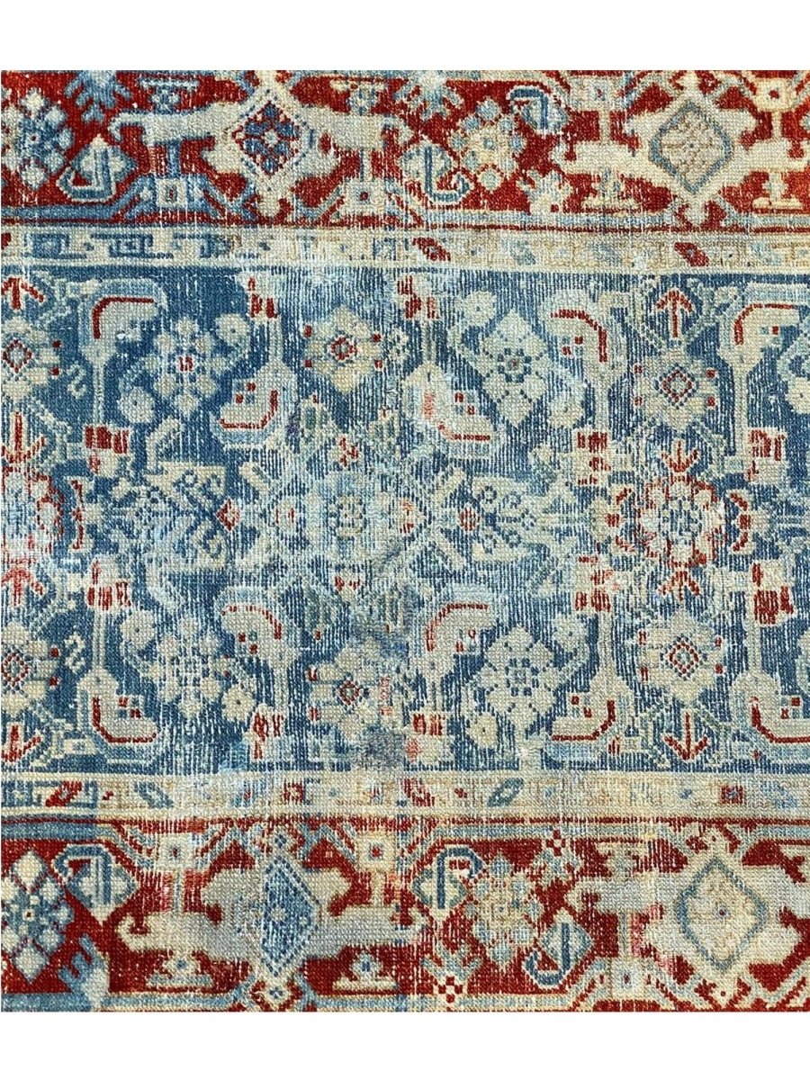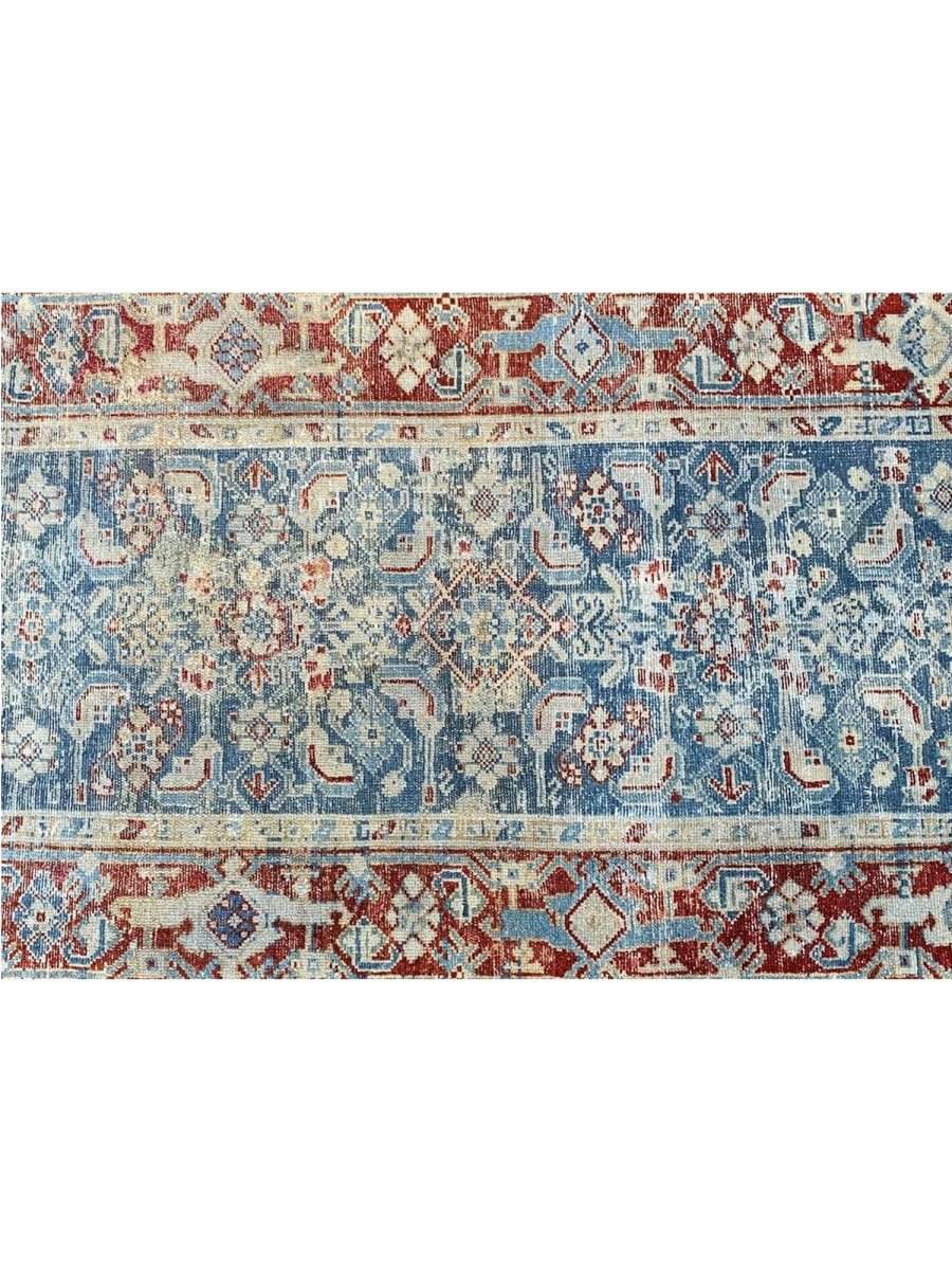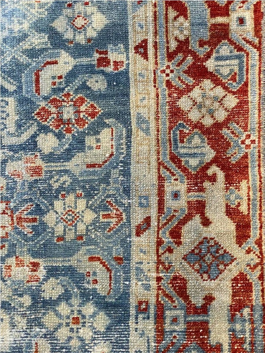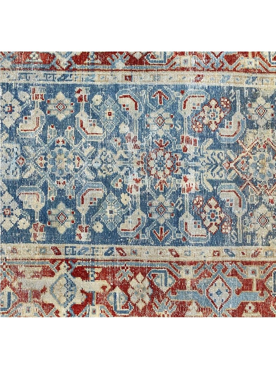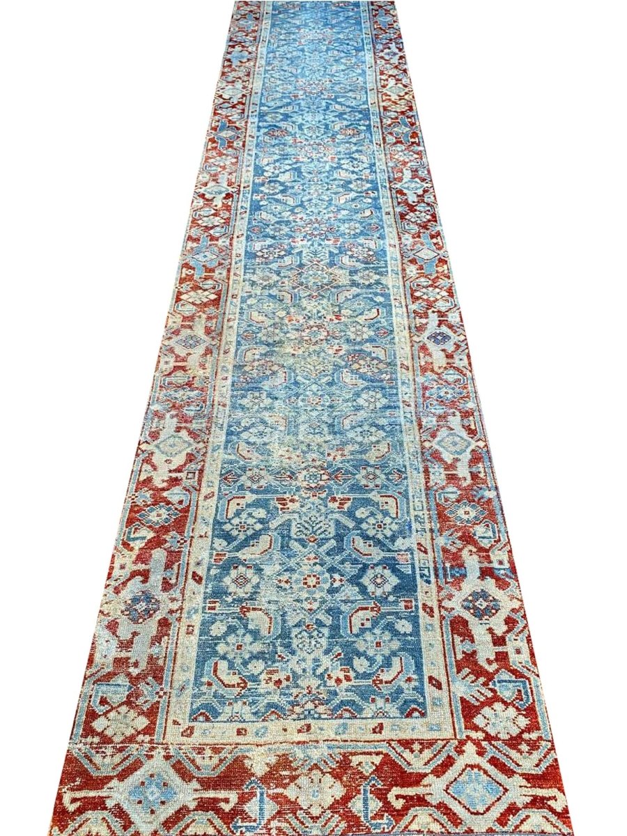 Add a touch of history to your home with this 3x16 Antique Persian Malayer Runner. This runner features a geometric pattern with intricate floral and diamond motifs, reflecting the timeless artistry of Persian design. The deep blue background is complemented by natural tones of rust, beige, and hints of ivory, creating a rich and elegant look. A detailed border with repeating motifs enhances its classic appeal. This rug is handmade in Persia with premium wool and offers durability and a luxurious texture. Ideal for hallways, entryways, or alongside furniture, it brings authentic Persian heritage to your space.