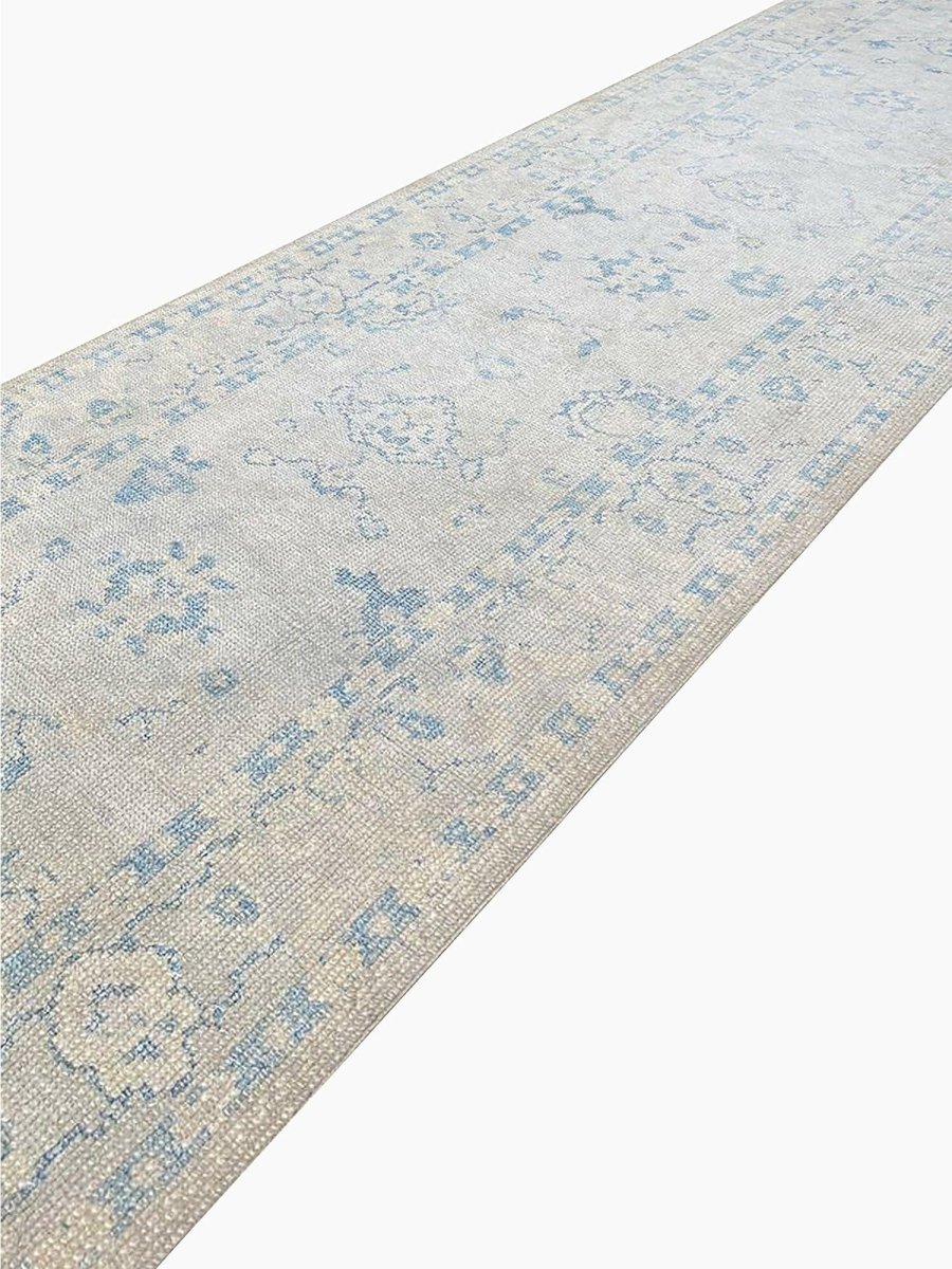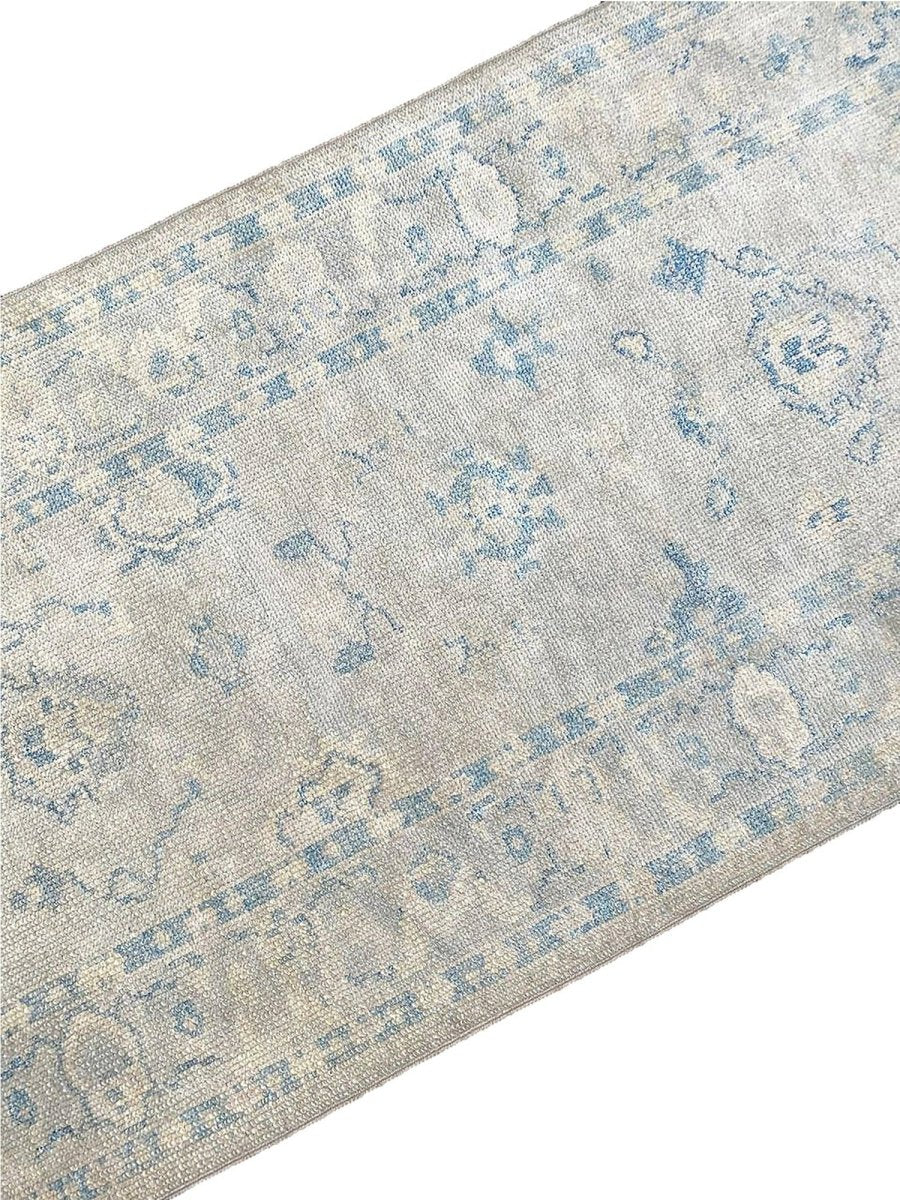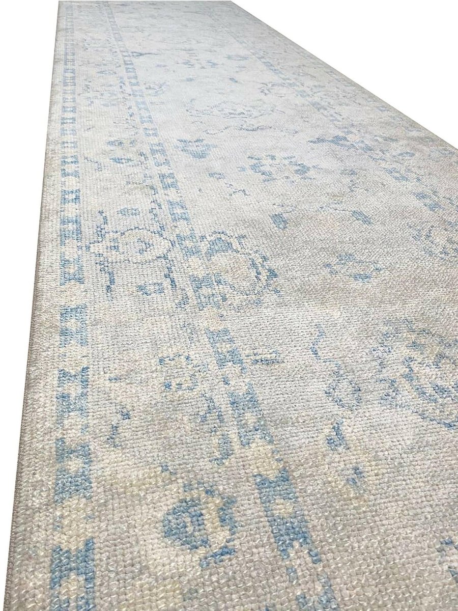 Enhance your space with the understated elegance of this 3x17 Turkish Oushak Runner Rug. This refined runner features a geometric pattern with delicate floral and diamond motifs, reflecting the traditional craftsmanship of Turkey. The light gray field is accented by soft blue and beige tones, creating a calm and sophisticated look. A detailed border with repeating geometric designs adds to its timeless appeal. Handmade with premium wool, this rug offers durability and a luxurious texture. Ideal for long hallways, entryways, or alongside furniture, it brings the authentic heritage of Turkish weaving to your home. Shop now to get free shipping in the United States.
