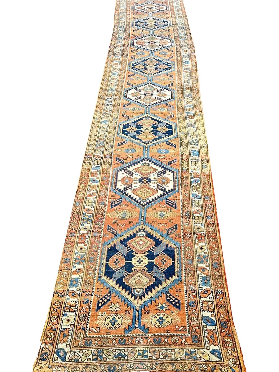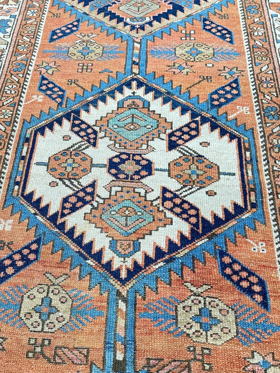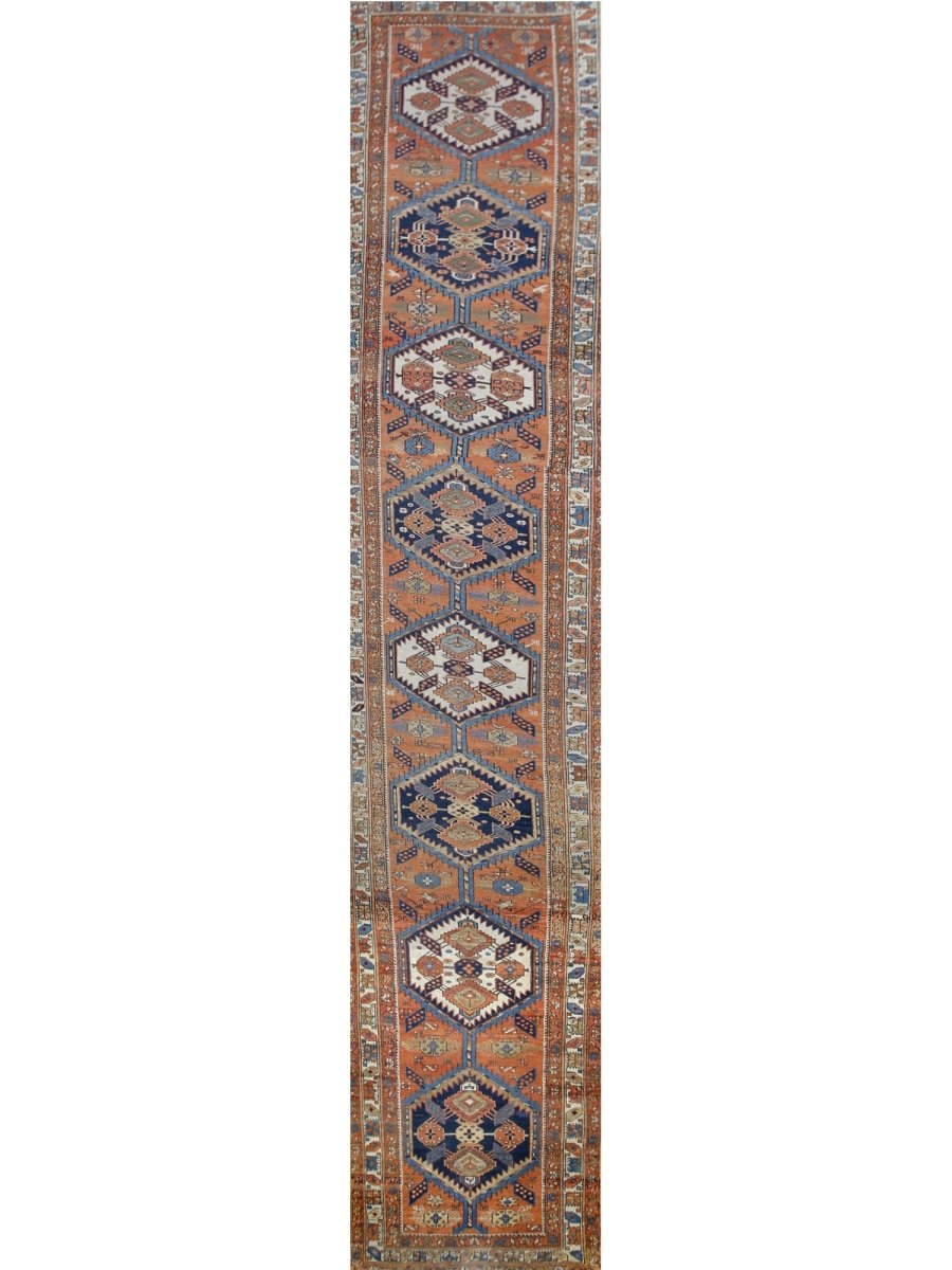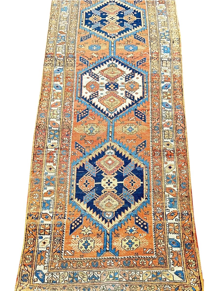The 3x18 Antique Persian Serapi Runner Rug is a unique find that transforms any area and adds a touch of classic traditional elegance. This gorgeous rug, made from high-quality wool, features a geometric design that enhances your interior decor. It creates a welcoming atmosphere its vibrant orange, blue, cream, and orange hues make it a versatile addition to any home. Beyond its functional use, this stunning runner serves as a beautiful centerpiece in your room. Enjoy free US delivery.