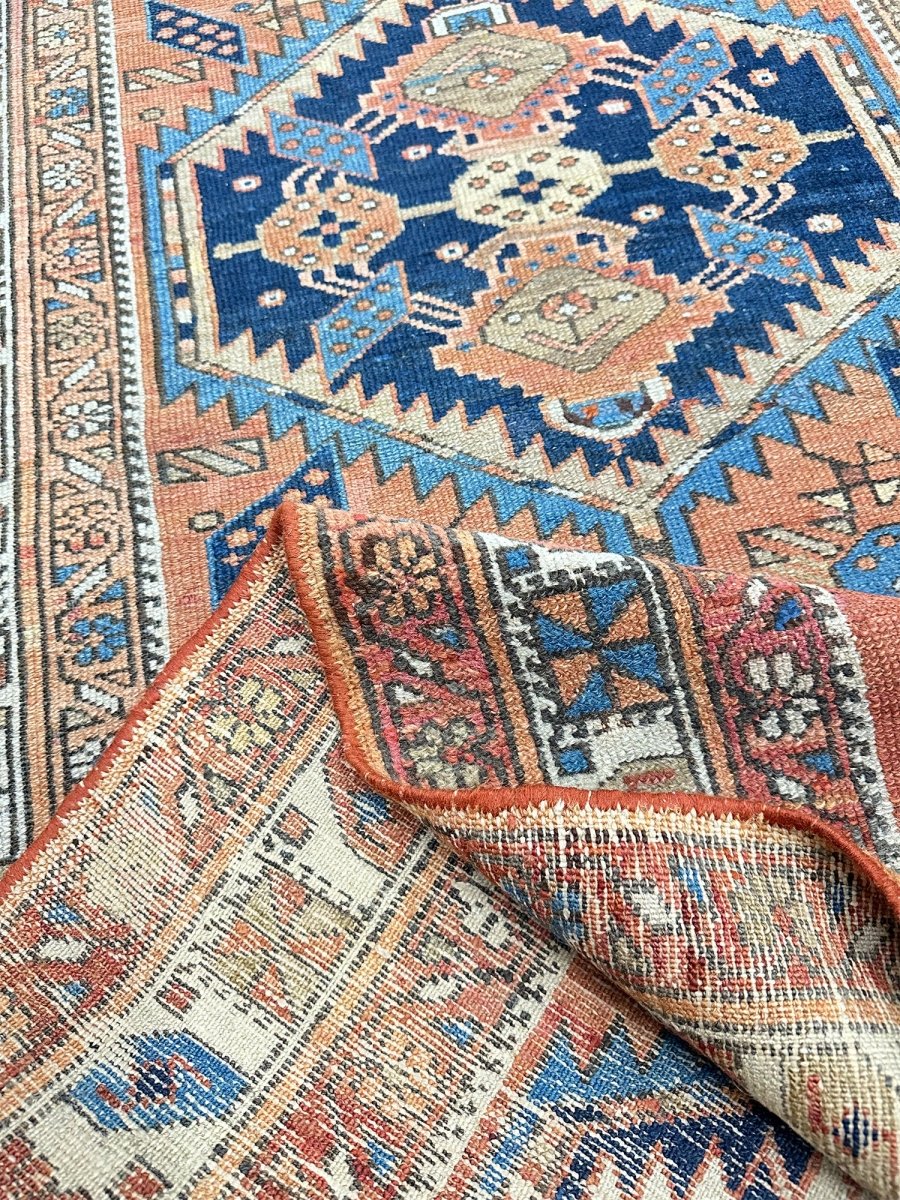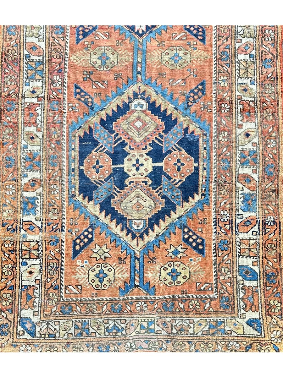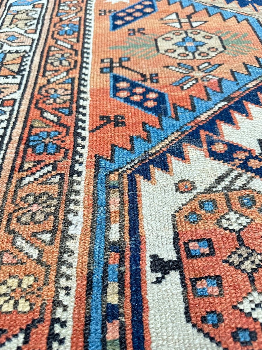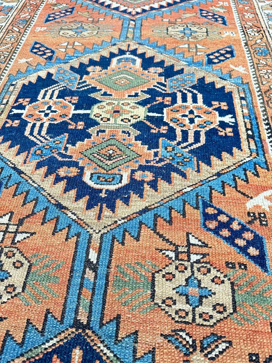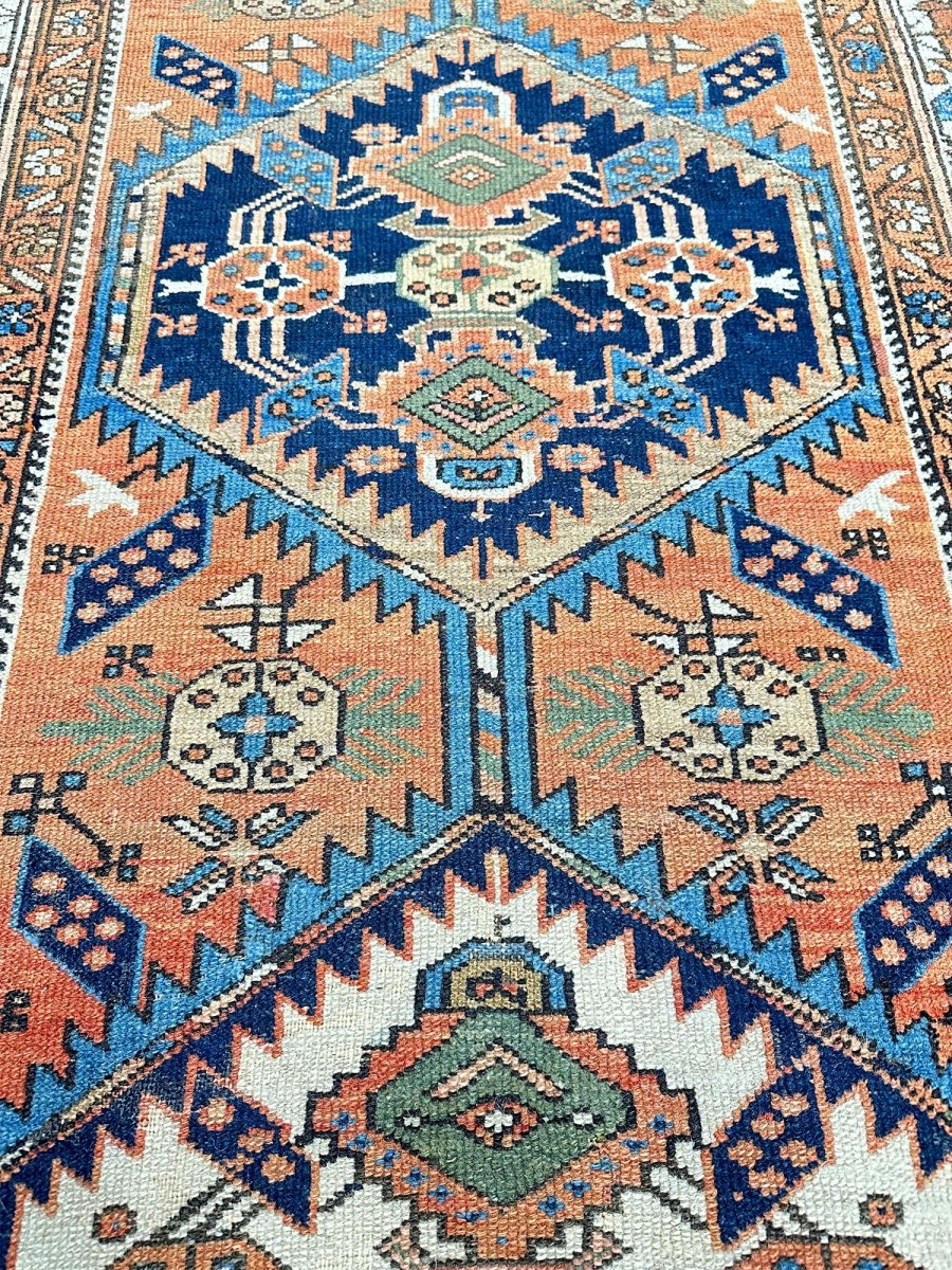 The 3x18 Antique Persian Serapi Runner Rug is a unique find that transforms any area and adds a touch of classic traditional elegance. This gorgeous rug, made from high-quality wool, features a geometric design that enhances your interior decor. It creates a welcoming atmosphere its vibrant orange, blue, cream, and orange hues make it a versatile addition to any home. Beyond its functional use, this stunning runner serves as a beautiful centerpiece in your room. Enjoy free US delivery.