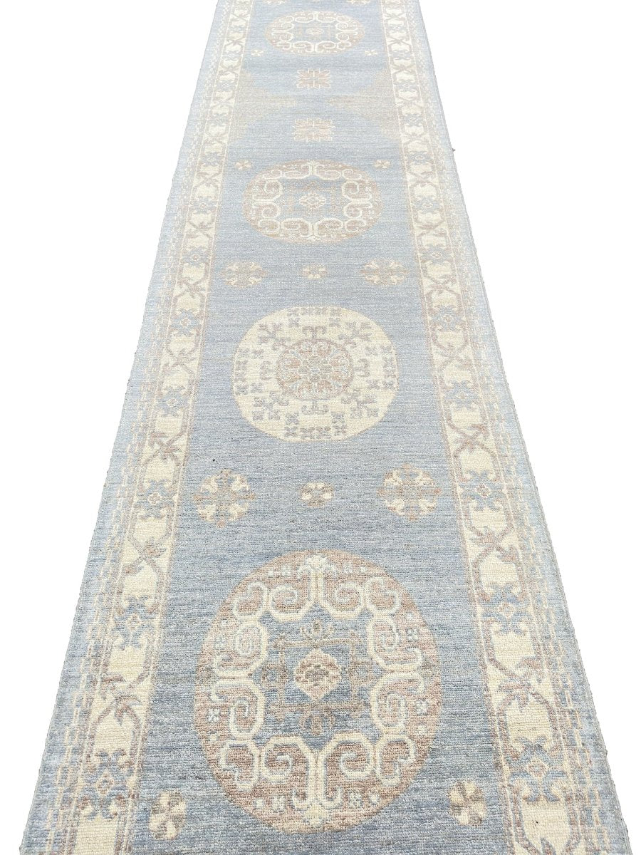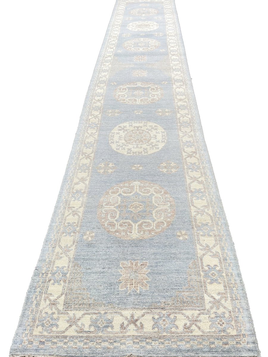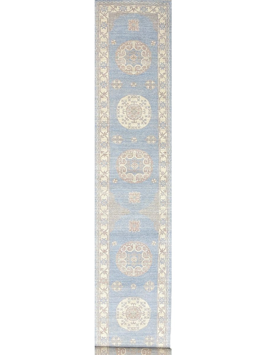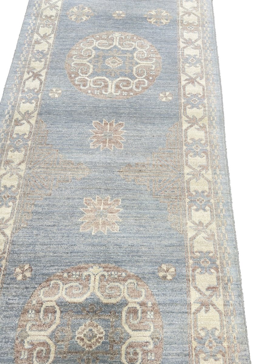Transform your home with the 3x18 Pakistani Style Runner Rug, a unique piece that masterfully combines traditional artistry. Hand-knotted in premium wool, this exquisite traditional rug boasts a geometric design that brings warmth and elegance to every room. The calming tones of blue and beige add a peaceful touch to your interior design, making it a chic addition to many different styles. This incredible rug is more than just a decorative item, it's an ageless rug that beautifies your home. Get free shipping in the US.