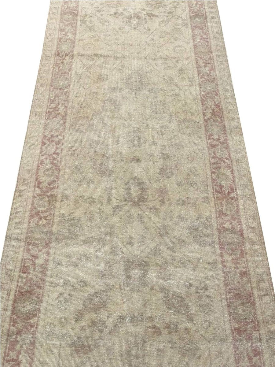 Adorn your long hallways or narrow spaces with the delicate charm of this hand-knotted 3x18 Persian Mahal style runner rug. This extended runner features a subtle all-over floral pattern, with delicate blossoms and intertwining vines gracefully dispersed across a light beige and gray field. Hints of a muted red are visible in the border and within some of the floral motifs, adding a touch of gentle warmth and refined color. The overall design evokes a sense of enduring elegance and serene beauty. Crafted entirely from high-quality wool, this rug provides a soft and durable surface underfoot, ensuring both comforting warmth and amazing performance in areas with consistent foot traffic. This runner rug is an exceptional choice for adding a sophisticated and elegant element to long hallways, entryways, seamlessly blending into your decor while offering lasting quality and a refined presence.