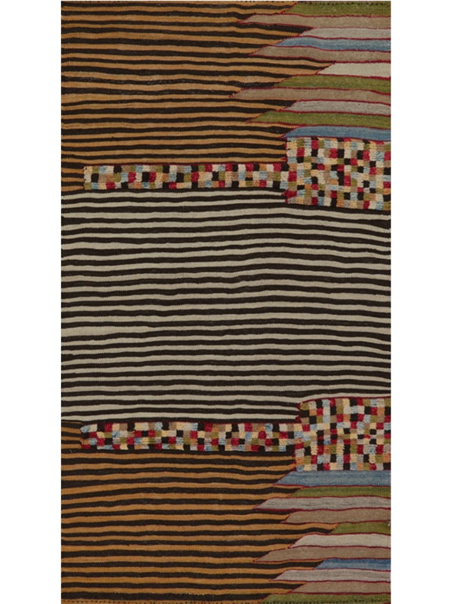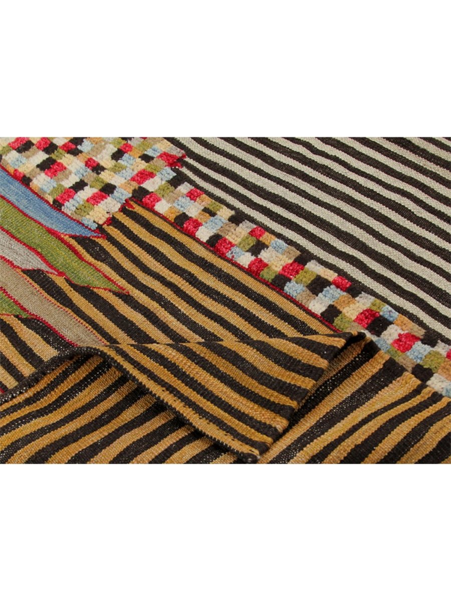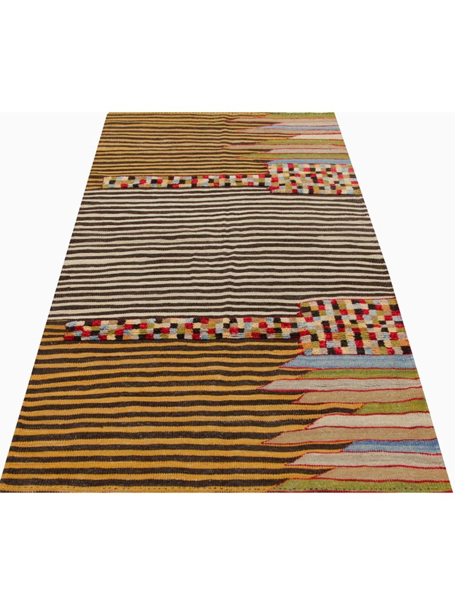 Bring sophistication with this 3x6 Persian Kilim runner. Hand-knotted from premium wool, it showcases a refined striped pattern in mustard yellow, black, gray, and blue, adding depth and character to any space. The intricate weaving technique highlights its artisanal craftsmanship, making it a timeless addition to your home.