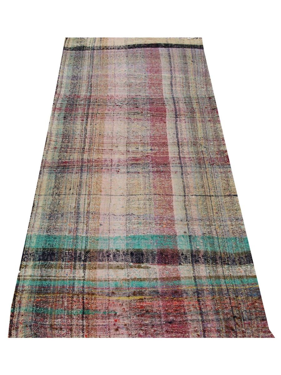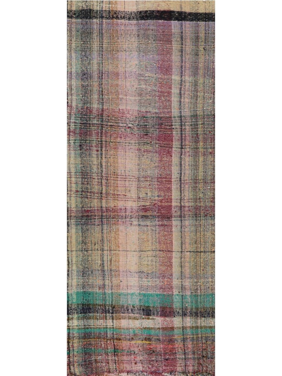 The 3x7 Persian Kilim Runner adds a soft, calming touch to any hallway or narrow space. Handwoven in Persia with a cotton blend, this rug features a muted color palette, including pastel shades of pink, purple, teal, along with neutral beige and light brown tones. The plaid-like design, with horizontal and vertical stripes, creates a soothing visual rhythm that complements a variety of decor styles. This hand-knotted runner showcases fine craftsmanship, offering both durability and elegance. Its gentle colors and intricate pattern make it a perfect choice for adding warmth and charm to any sleek or bohemian-inspired interior. Ideal for adding a pop of color and a touch of Persian craftsmanship to any room in your home.