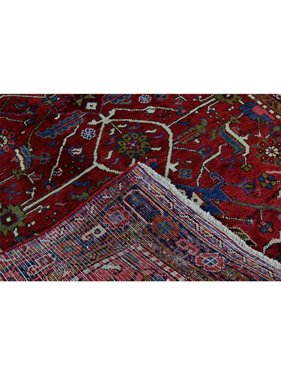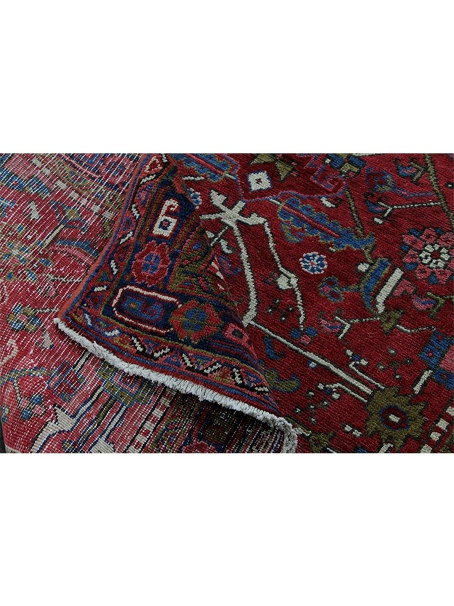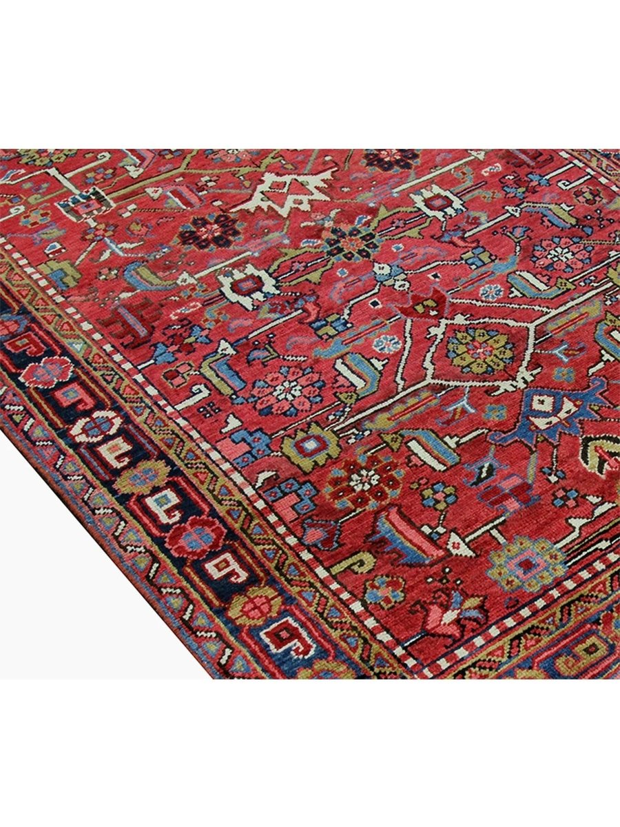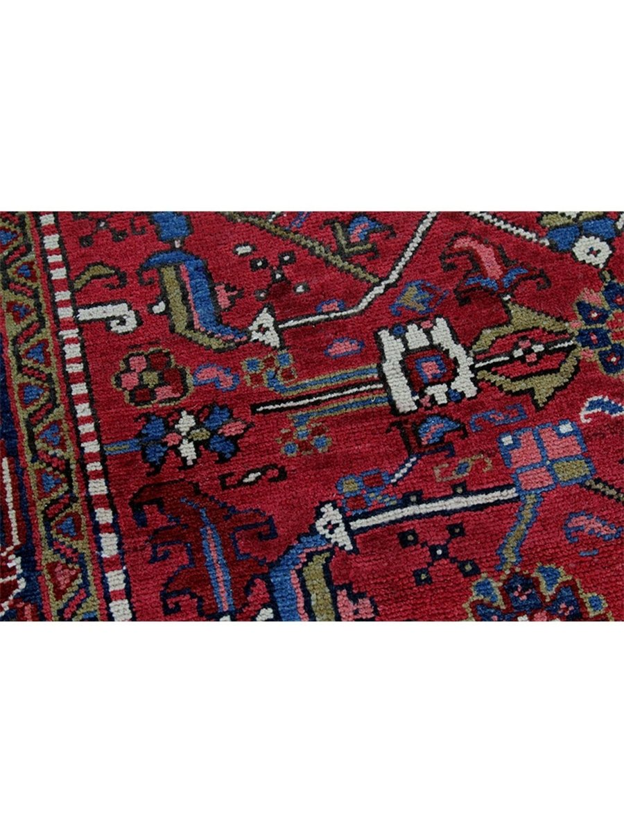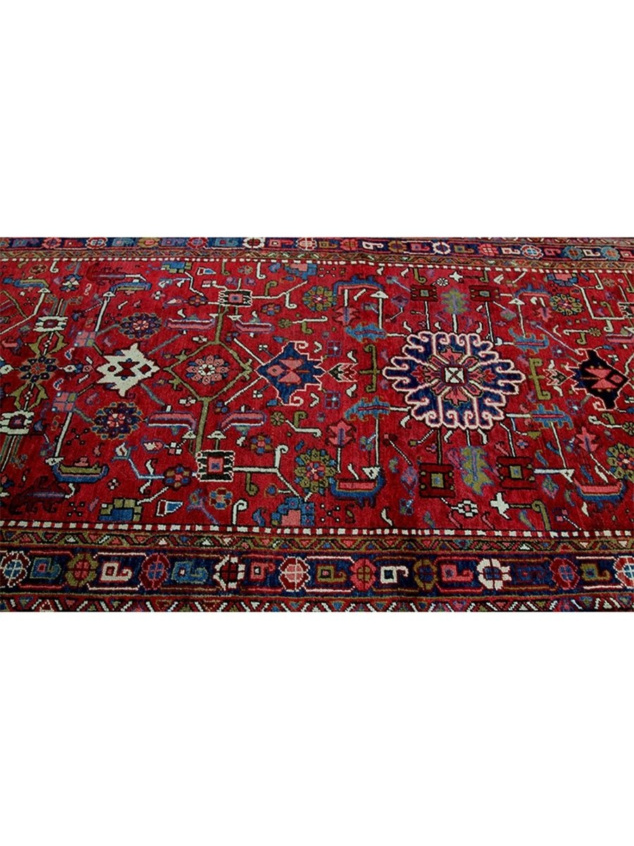 Hand-knotted in Persia, this 4x13 Old Persian Heriz Runner rug is a powerful exemplar of craftsmanship and cultural tradition. Rich red in its background, it creates a pop of color for the intricately woven geometric pattern, outlined in deep navy, pink and soft ivory motifs. The geometric patterns evoke the traditional style, renowned for its strength and expressive flair. Crafted from premium wool, this rug provides both visual beauty and a dense, sumptuous pile that is a pleasure to walk on. Ideal for highlighting entryways, reading spaces, or petite areas, this classic piece brings warmth and sophistication to any space. Free US shipping.