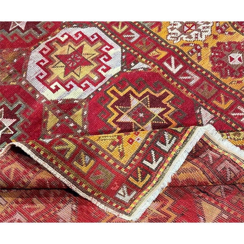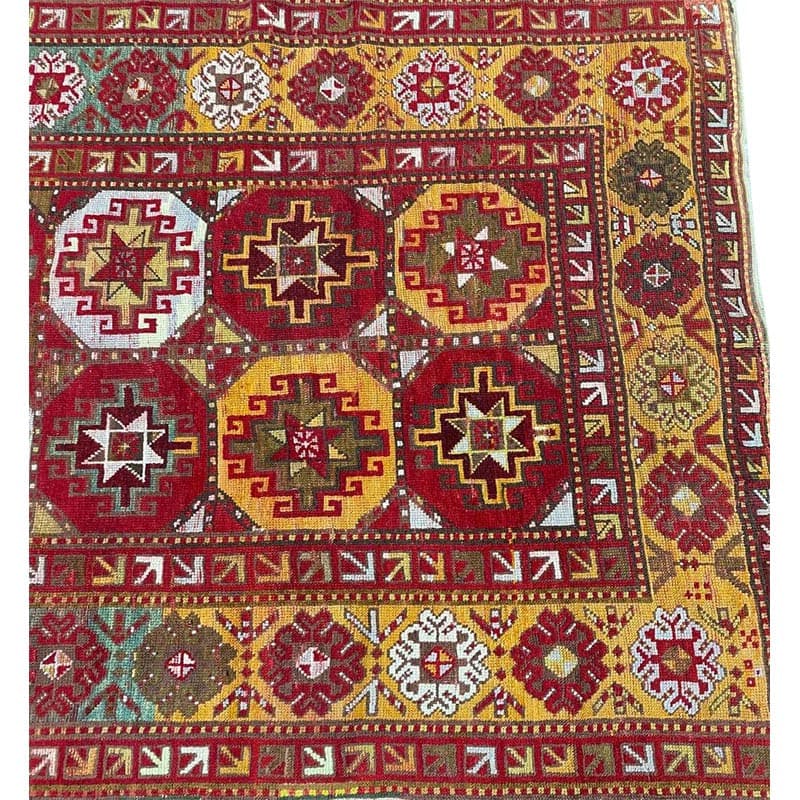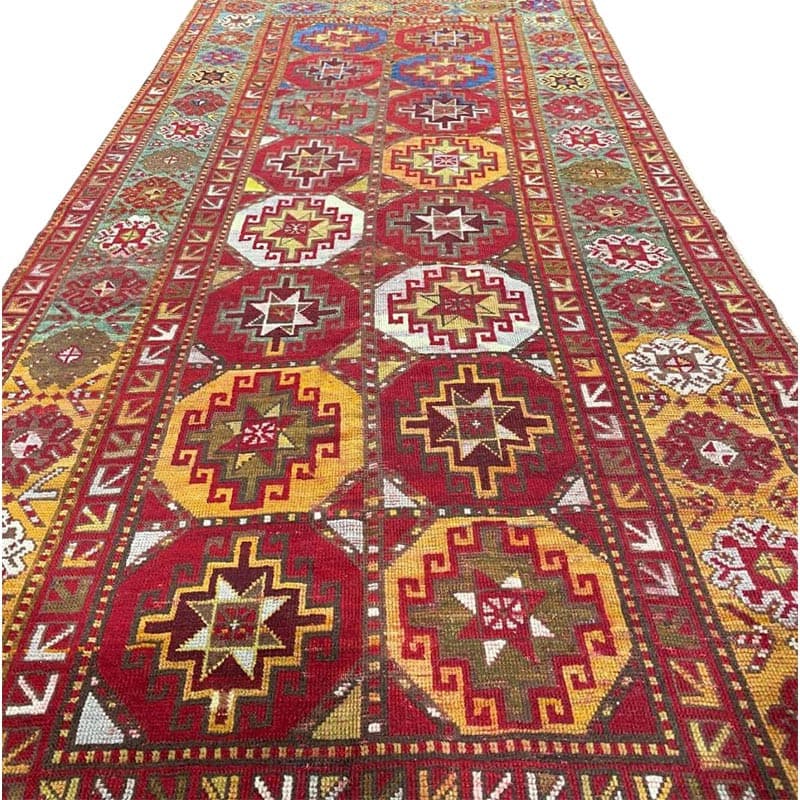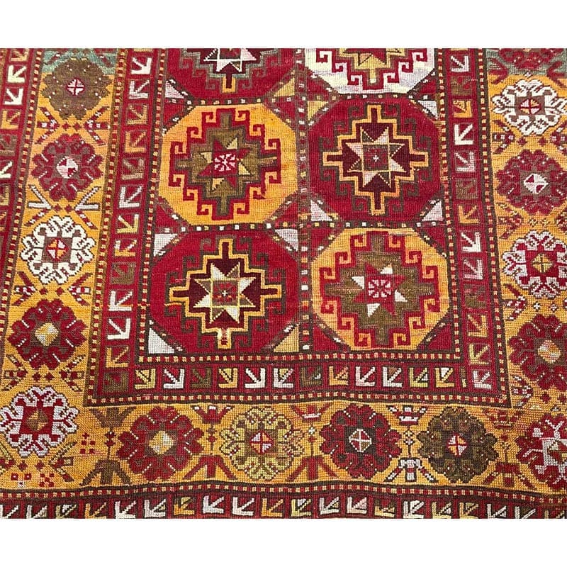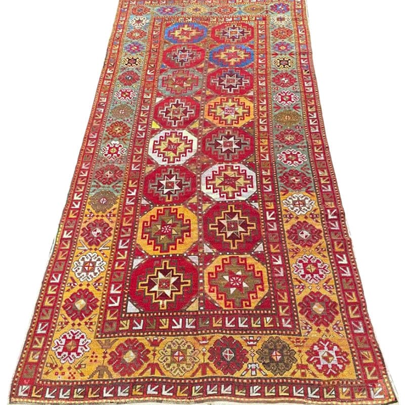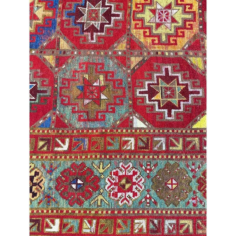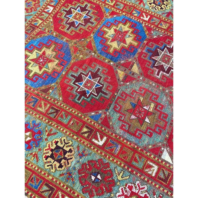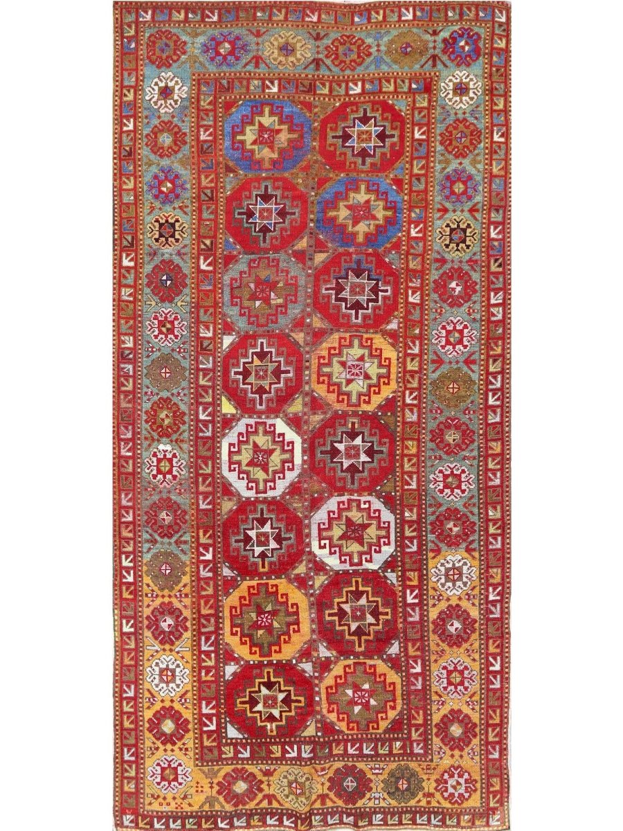 Elevate your space with the vibrant beauty of this 4x9 Antique Russian Kazak area rug, crafted in Persia. This rug features a geometric pattern with bold diamond and star motifs, reflecting the rich cultural heritage of the Caucasus region with Persian craftsmanship. The deep red background is complemented by natural tones of blue, yellow, and hints of beige, creating a striking and sophisticated aesthetic. A detailed border with repeating geometric designs enhances its classic appeal. Handmade with premium wool, this rug offers durability and a luxurious texture. Perfect for long hallways, entryways, or alongside furniture, it brings a touch of authentic Persian heritage to your space.