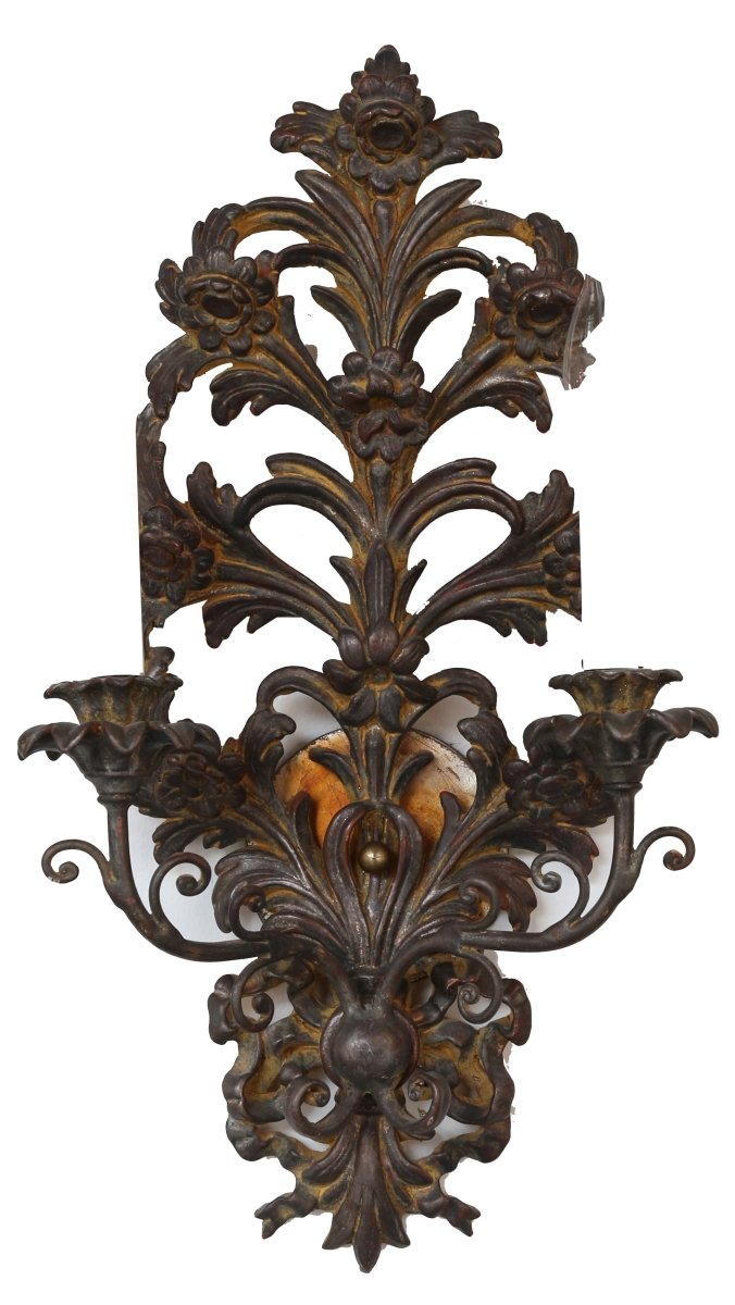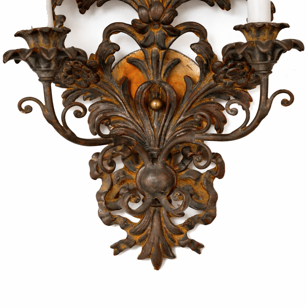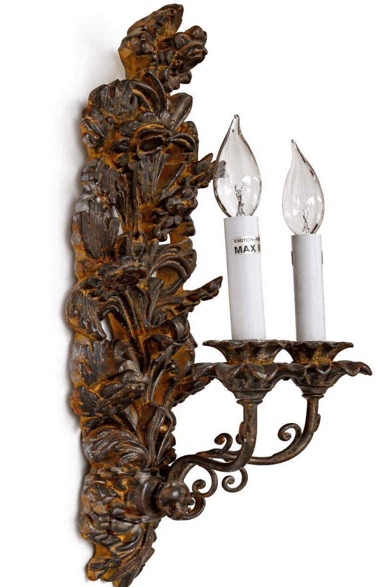 Each vertically oriented backplate is adorned with stylized blossoms, scrolling foliage, and ribbon-like details that rise gracefully upward. Two curved arms extend from each sconce to support candle-style lights, resting in shaped bobeches that echo the ornate carving. The oxidized silver gilt finish lends an antique-inspired character while remaining versatile and sophisticated.