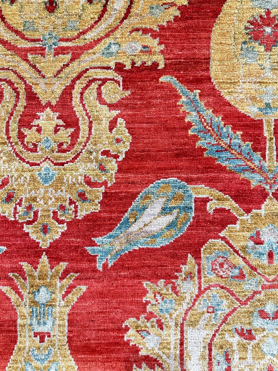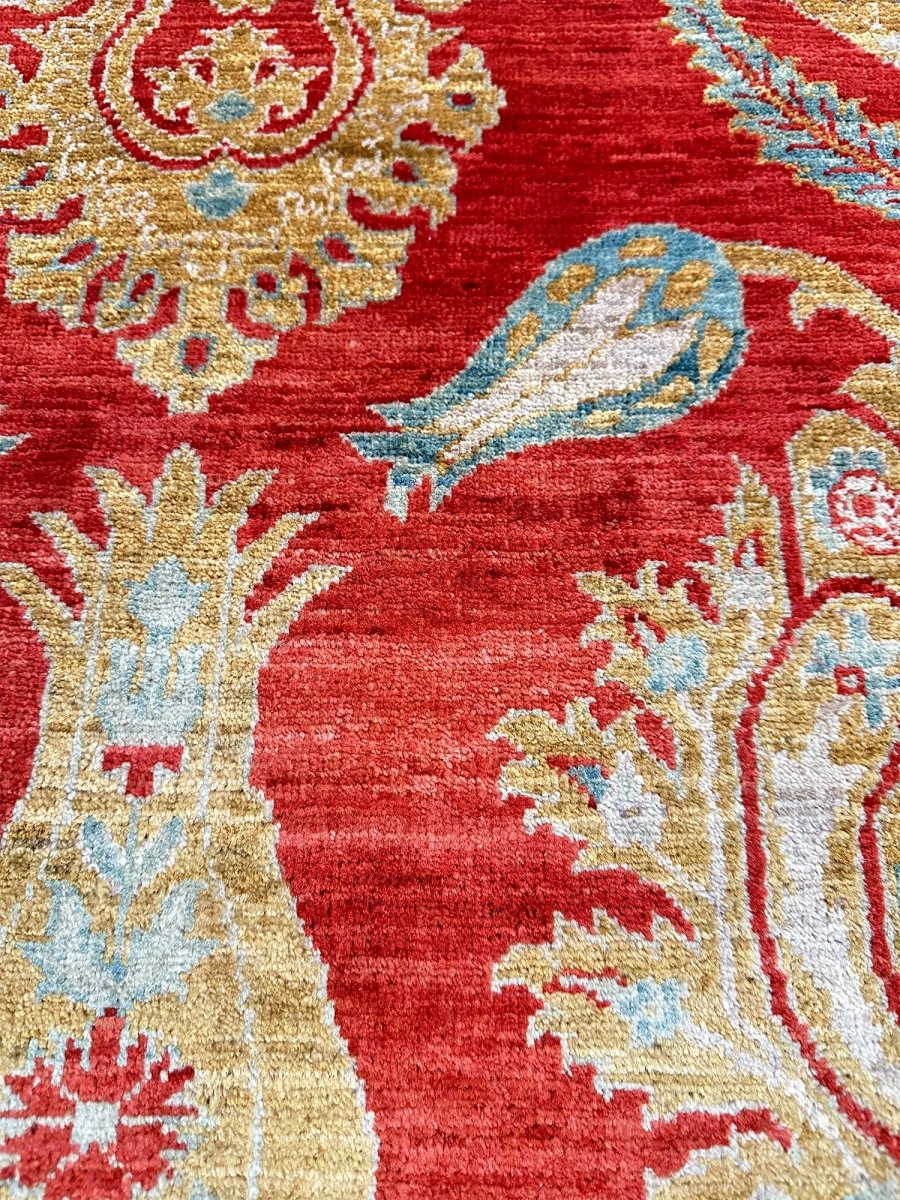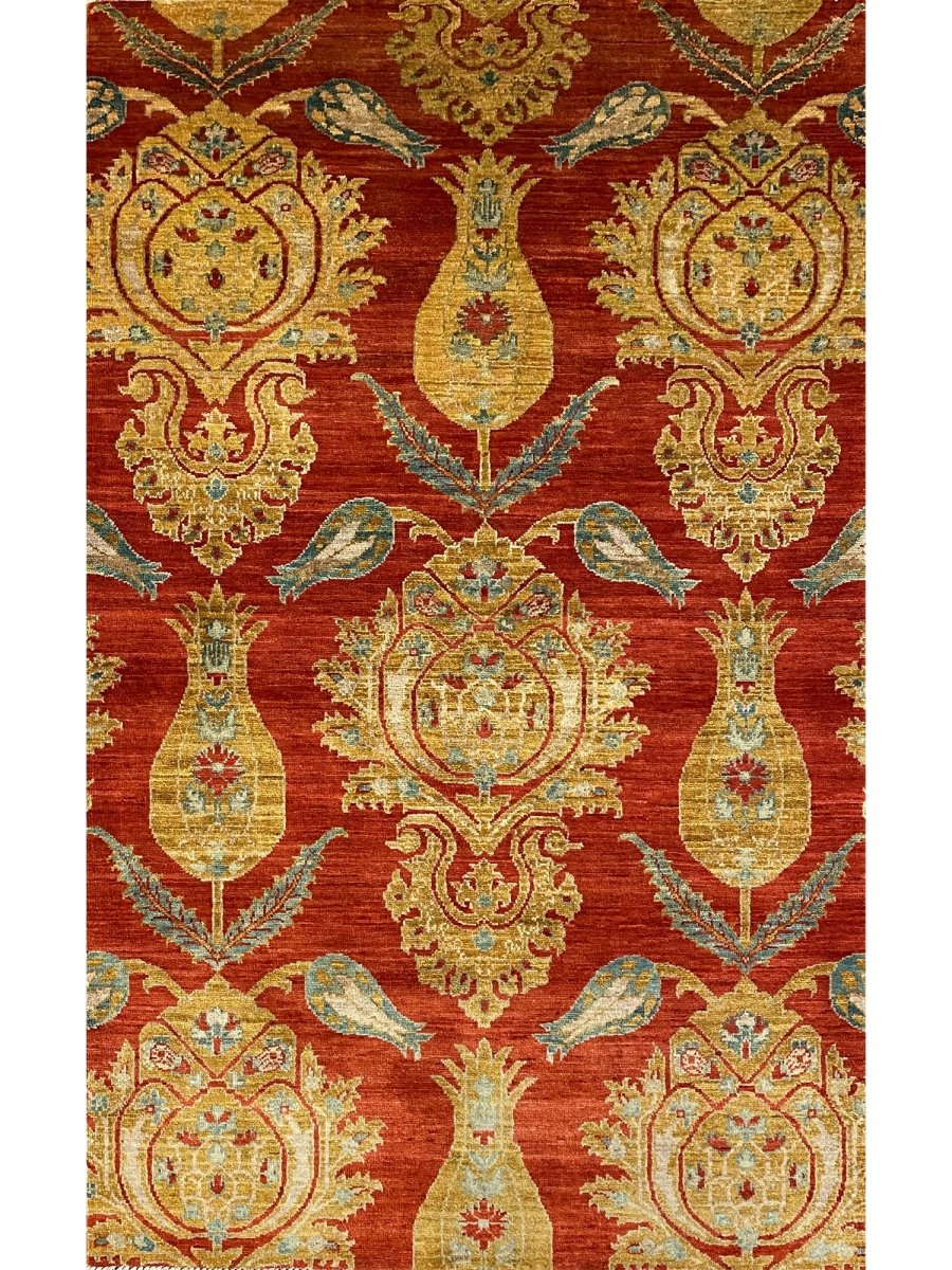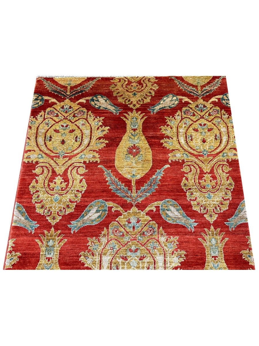 The 3x5 Red and Gold Arts and Crafts Area Rug is a unique treasure that embodies the rich history of Pakistani weaving and would elevate your decor. Made from high-quality wool, this gorgeous rug features a geometric design that blends in perfectly with any type of interior design. It provides a friendly atmosphere and is perfect for entryways, small kitchens, and bathrooms. It is a flexible addition to your space; the rich blend of brick red, gold, and gray tones adds depth and character. This traditional rug is a stunning work of art that elevates your living space. Take advantage of free US delivery.