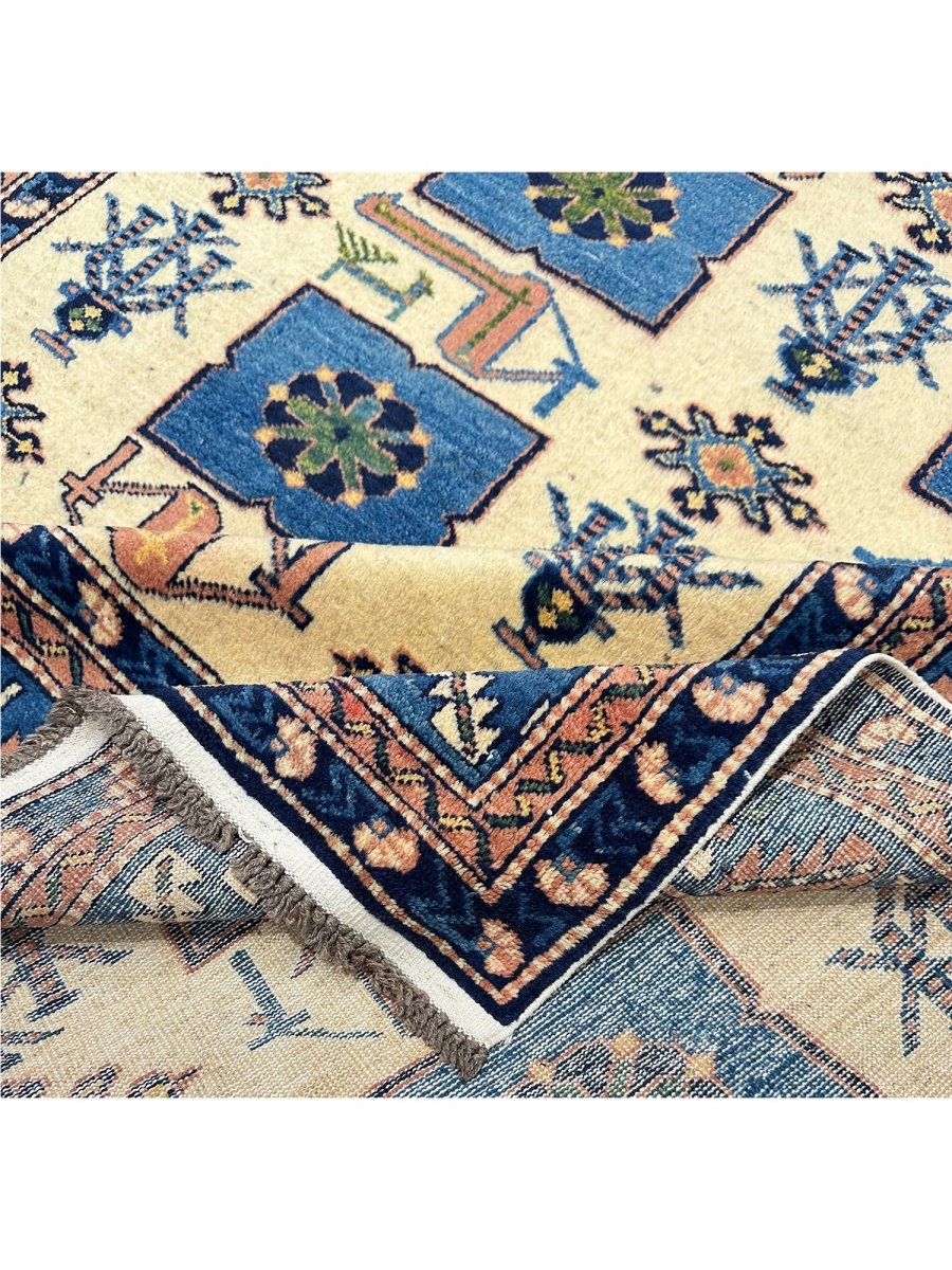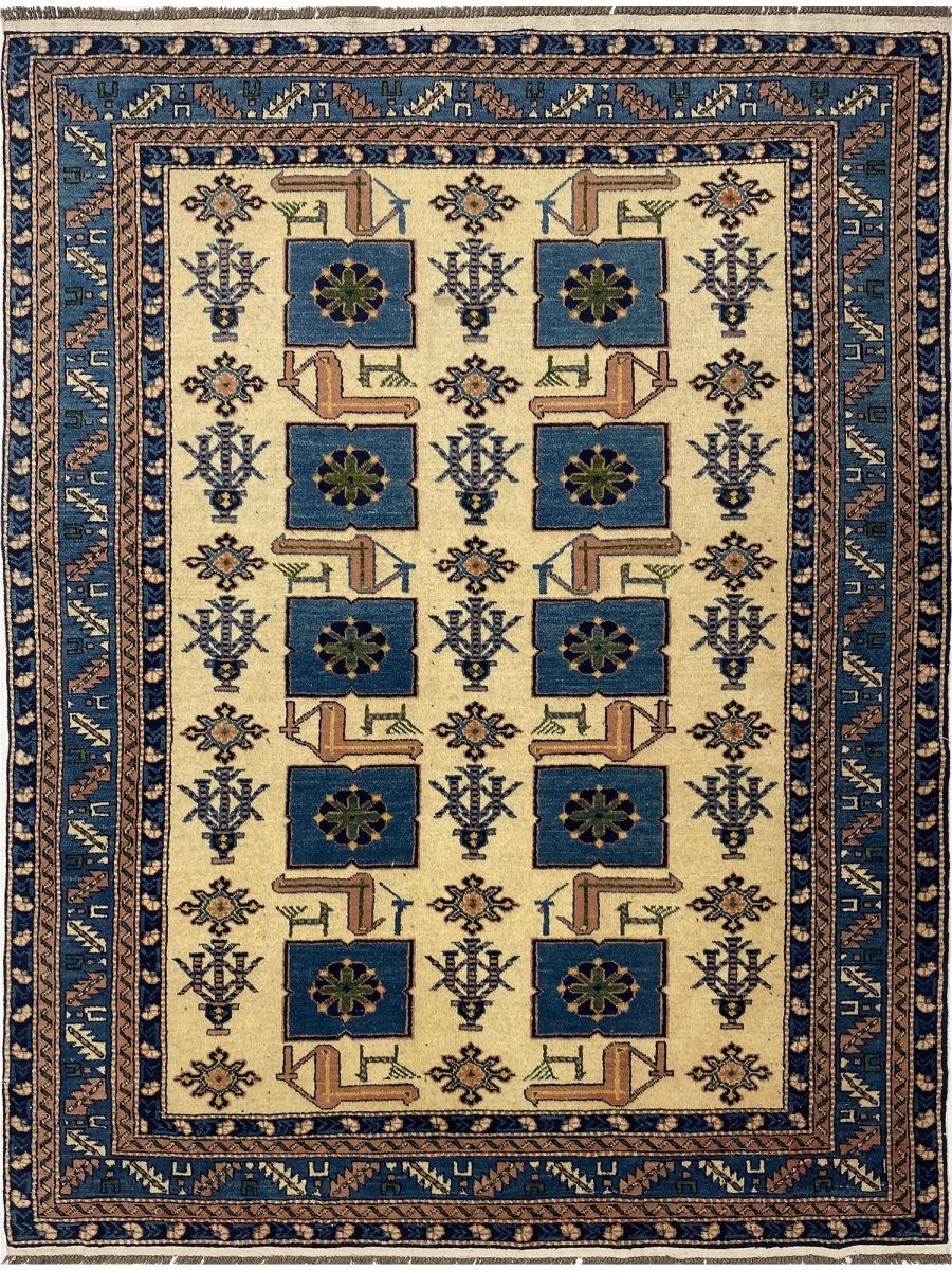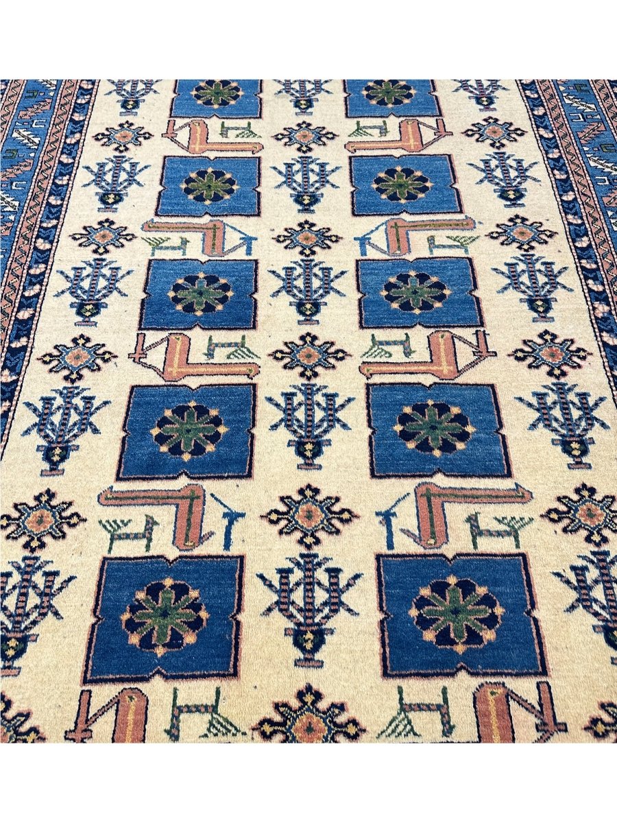 Explore the vintage classic design with a 4x6 handwoven Afghan area rug. Made in Afghanistan with traditional handwoven methods. Manufactured using exquisite wool material with a heap soft underfoot and sturdy enough to withstand daily activities, this rug features tribal geometric designs and beautiful tones of blue and ivory; therefore, it can easily accommodate either old local designs or a more trendy approach, adapting to wider decor styles. Complimentary delivery within the United States.