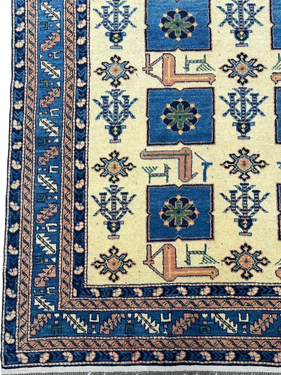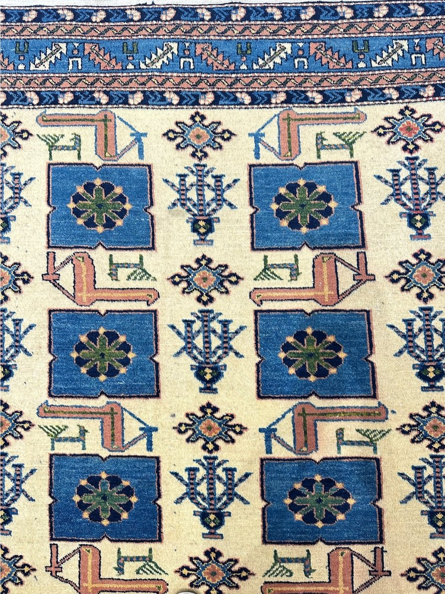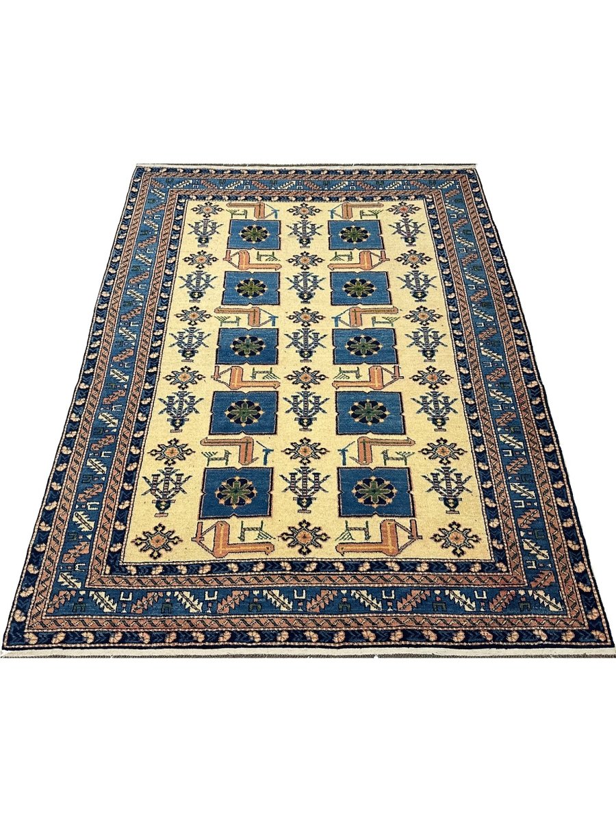 Explore the vintage classic design with a 4x6 handwoven Afghan area rug. Made in Afghanistan with traditional handwoven methods. Manufactured using exquisite wool material with a heap soft underfoot and sturdy enough to withstand daily activities, this rug features tribal geometric designs and beautiful tones of blue and ivory; therefore, it can easily accommodate either old local designs or a more trendy approach, adapting to wider decor styles. Complimentary delivery within the United States.