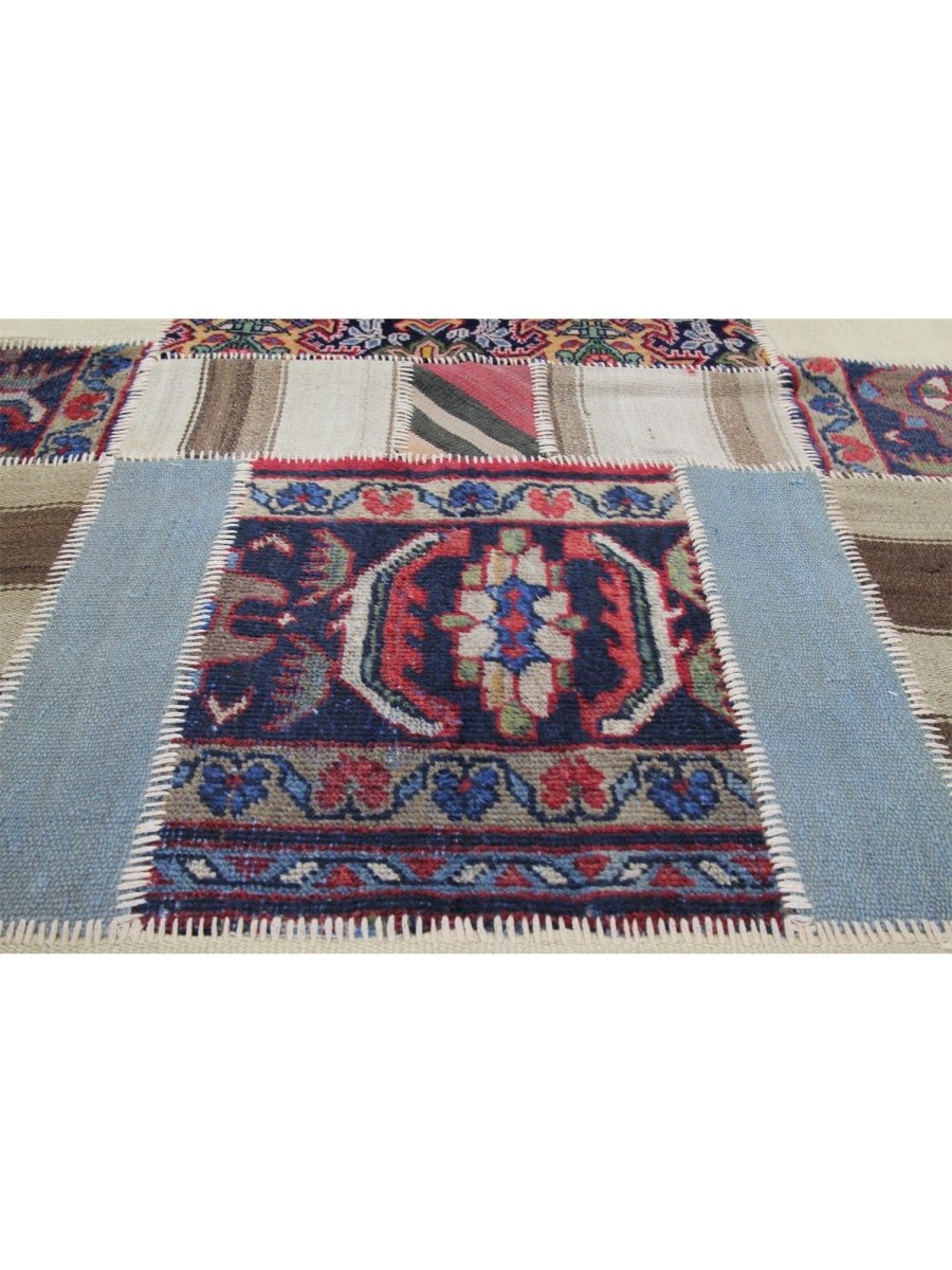 This 4x6 Persian patchwork rug beautifully combines hand-knotted Persian rug fragments with kilim textile sections, creating a striking contrast between ornate and rustic elements. The central panel showcases a detailed floral and geometric pattern reminiscent of Bakhtiari or Qashqai rugs, while the surrounding striped kilim sections in beige, brown, red, and blue add a subtle cultural touch. The visible hand-stitched seams highlight its handmade craftsmanship, reinforcing the rug’s durability and artistic charm. A versatile statement piece, this patchwork rug is ideal for bohemian, eclectic, or timeless interiors. It effortlessly adds warmth, texture, and cultural depth to any space, making it a timeless addition to your home decor.