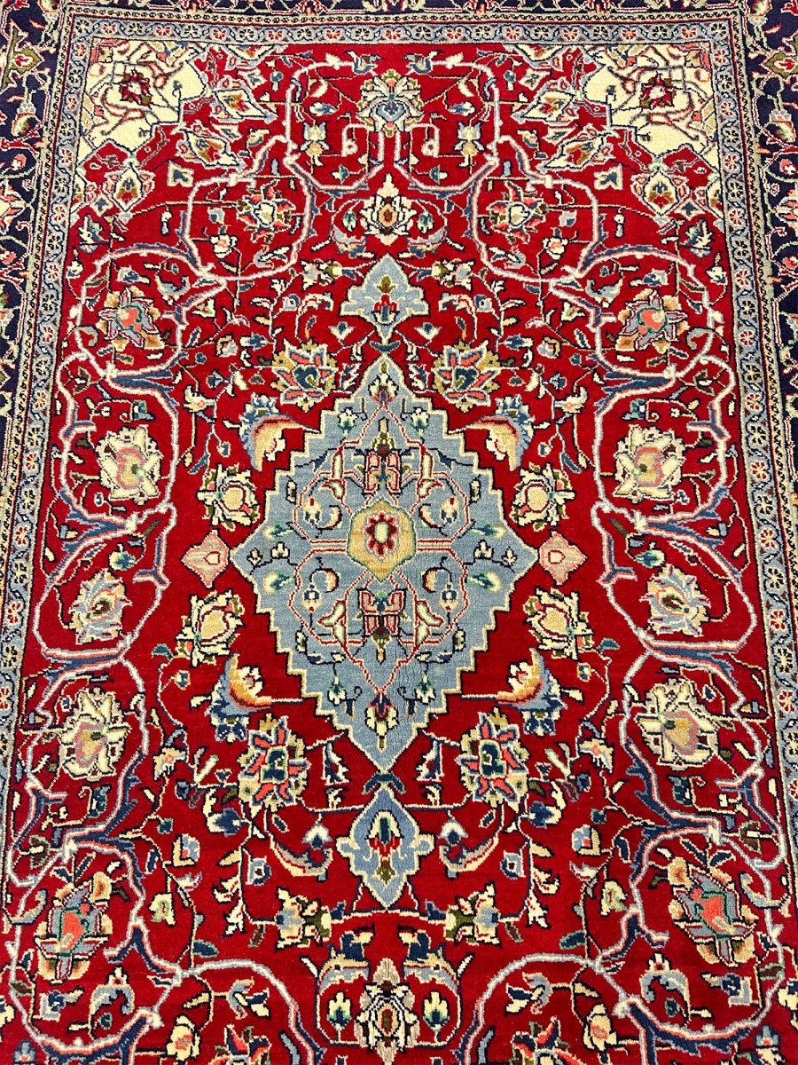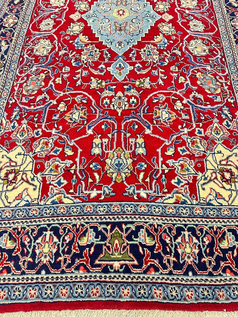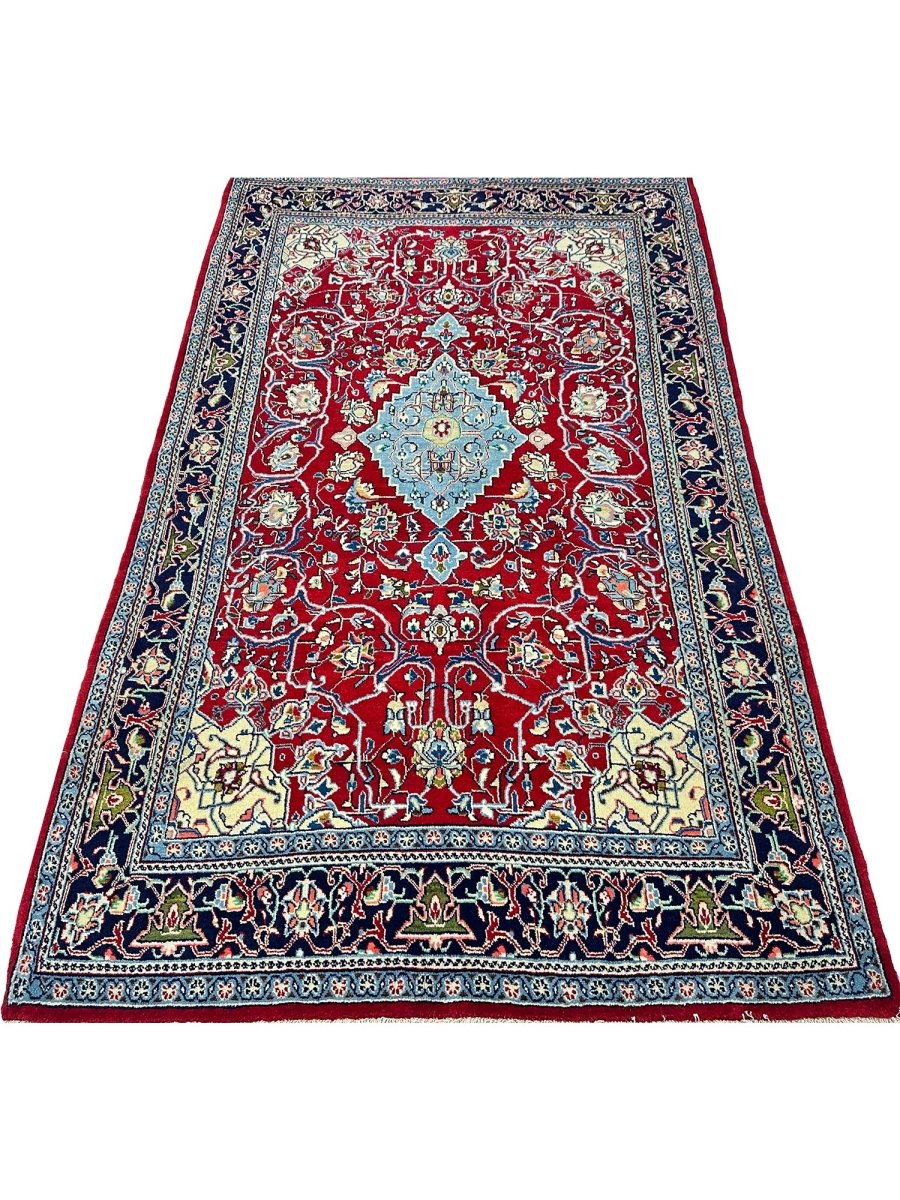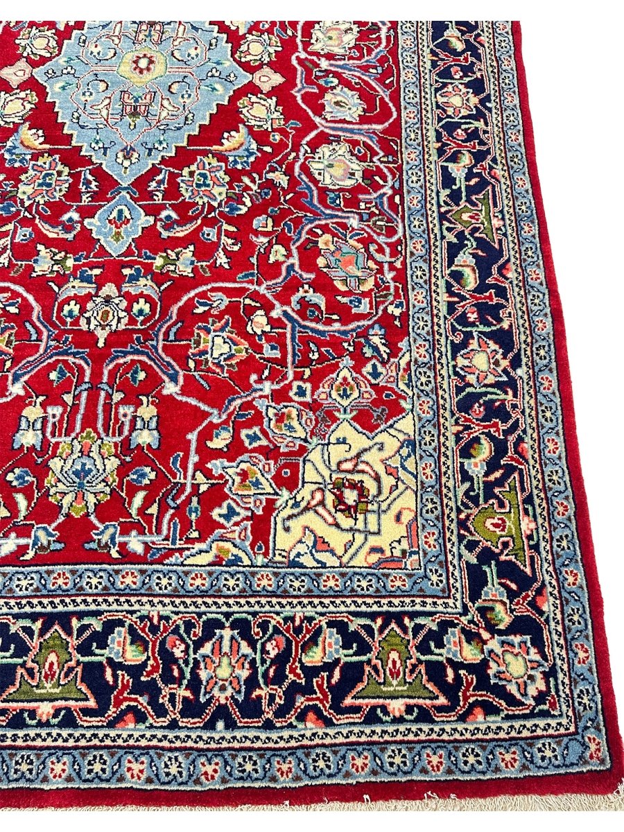 Elevate your space with the seamless design of a 5x7 hand-knotted Persian sarough area rug. Hand-knotted with elite wool in Persia, elaborated with a medallion design that will bring sparkle to every interior, and colored in vibrant red and blue. A complete package of warmth, comfort, and sophistication, rich with cultural and traditional aesthetics. Enjoy free delivery all around the US.